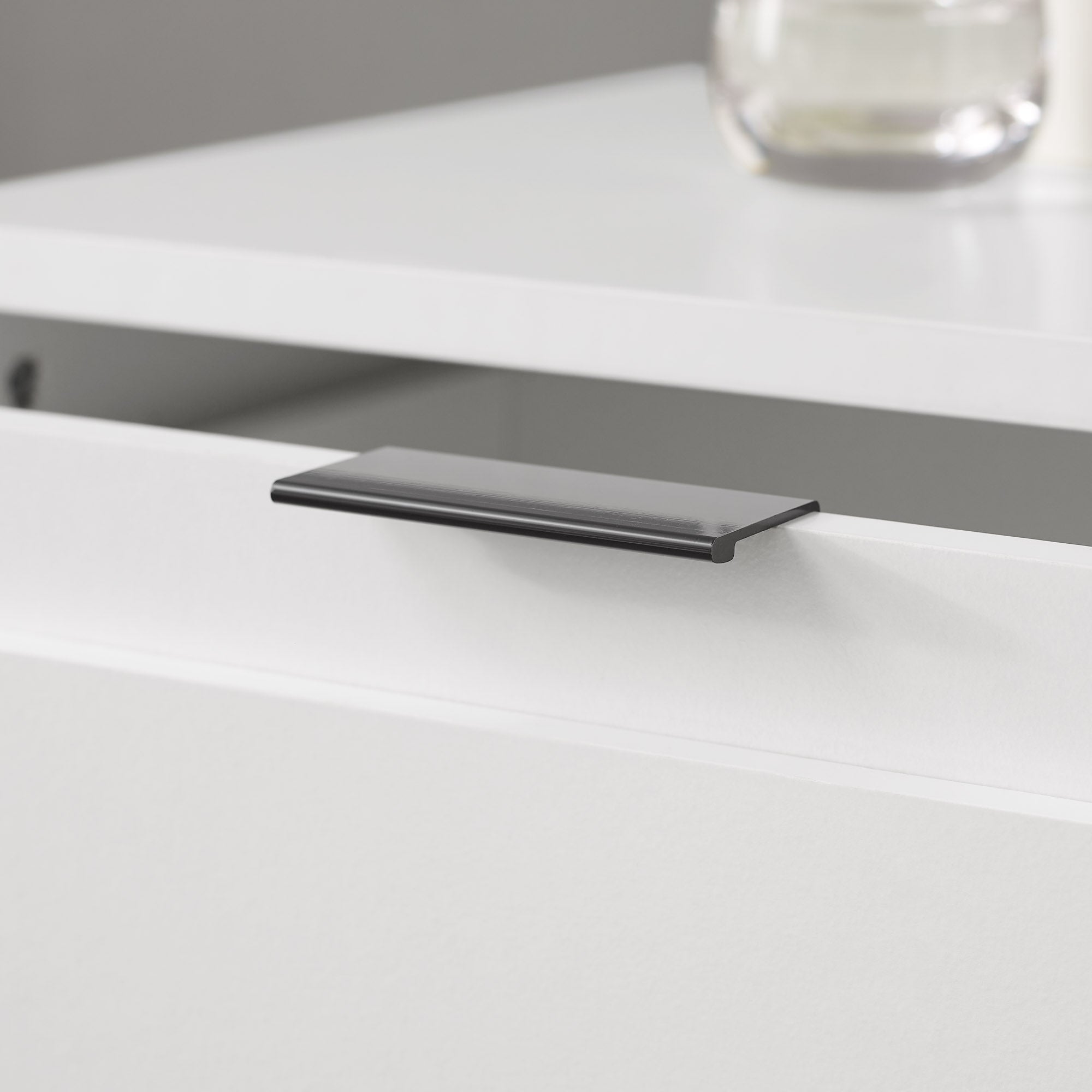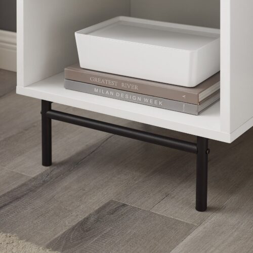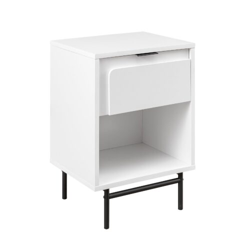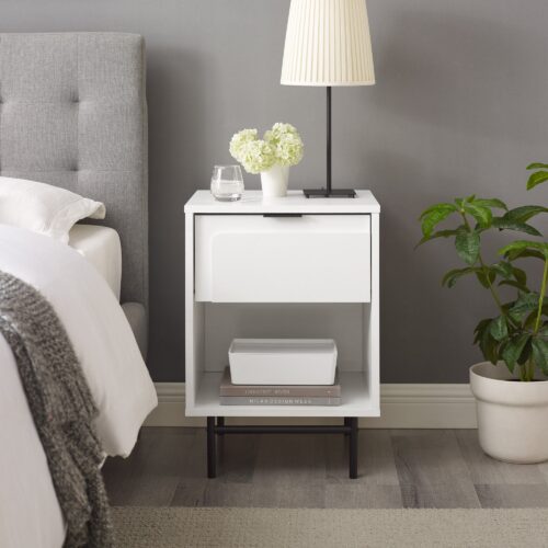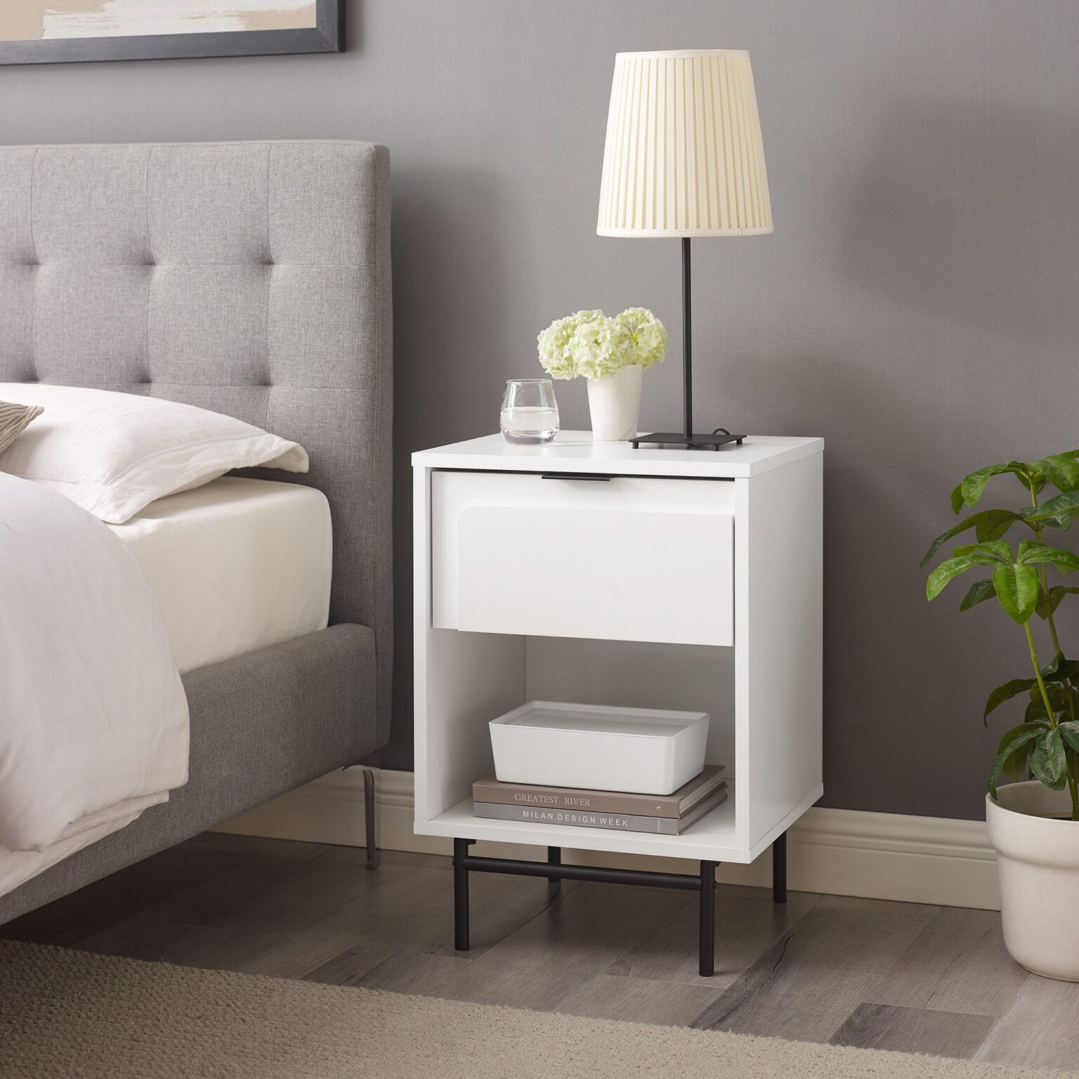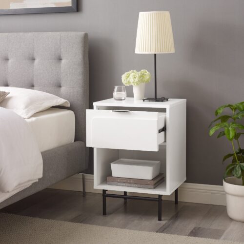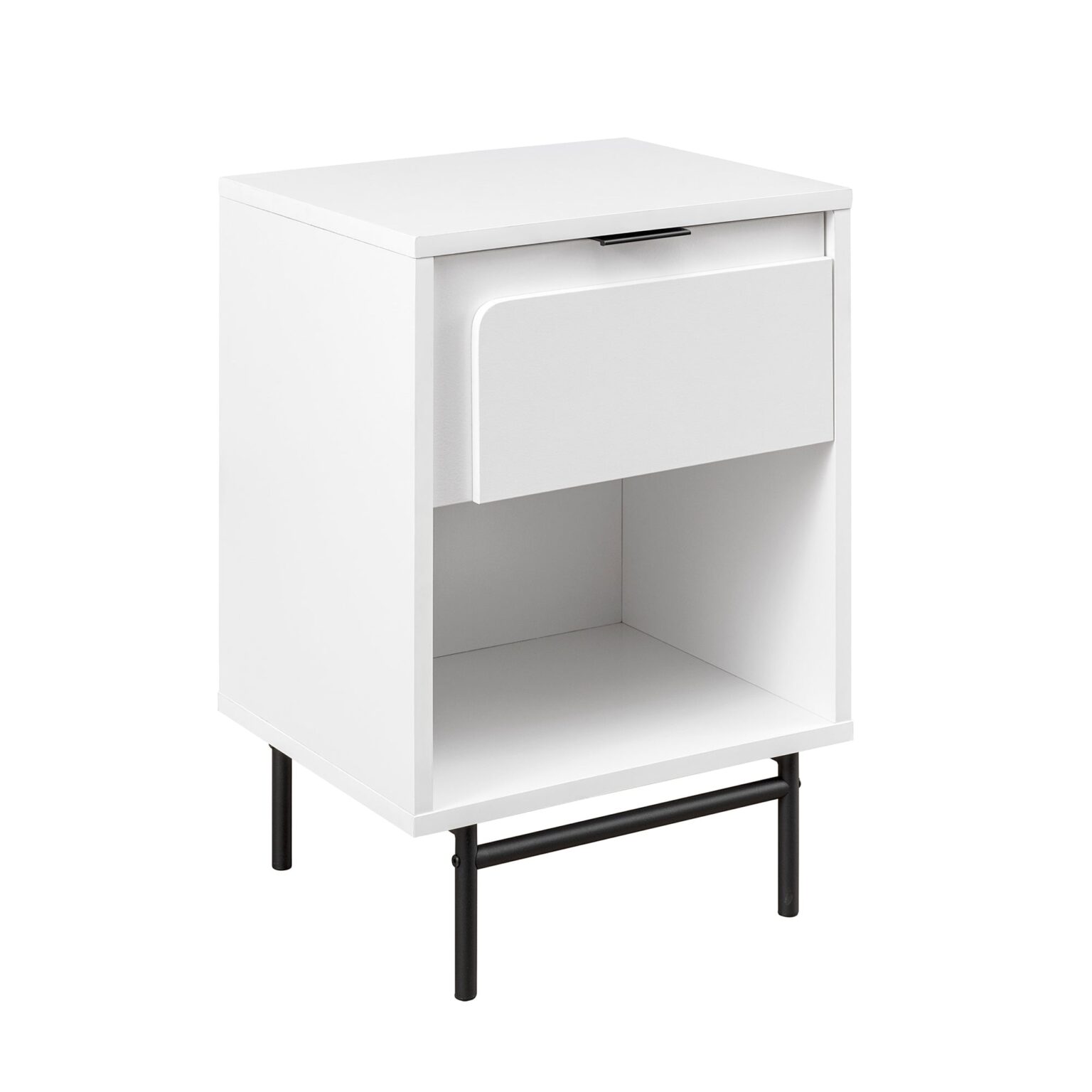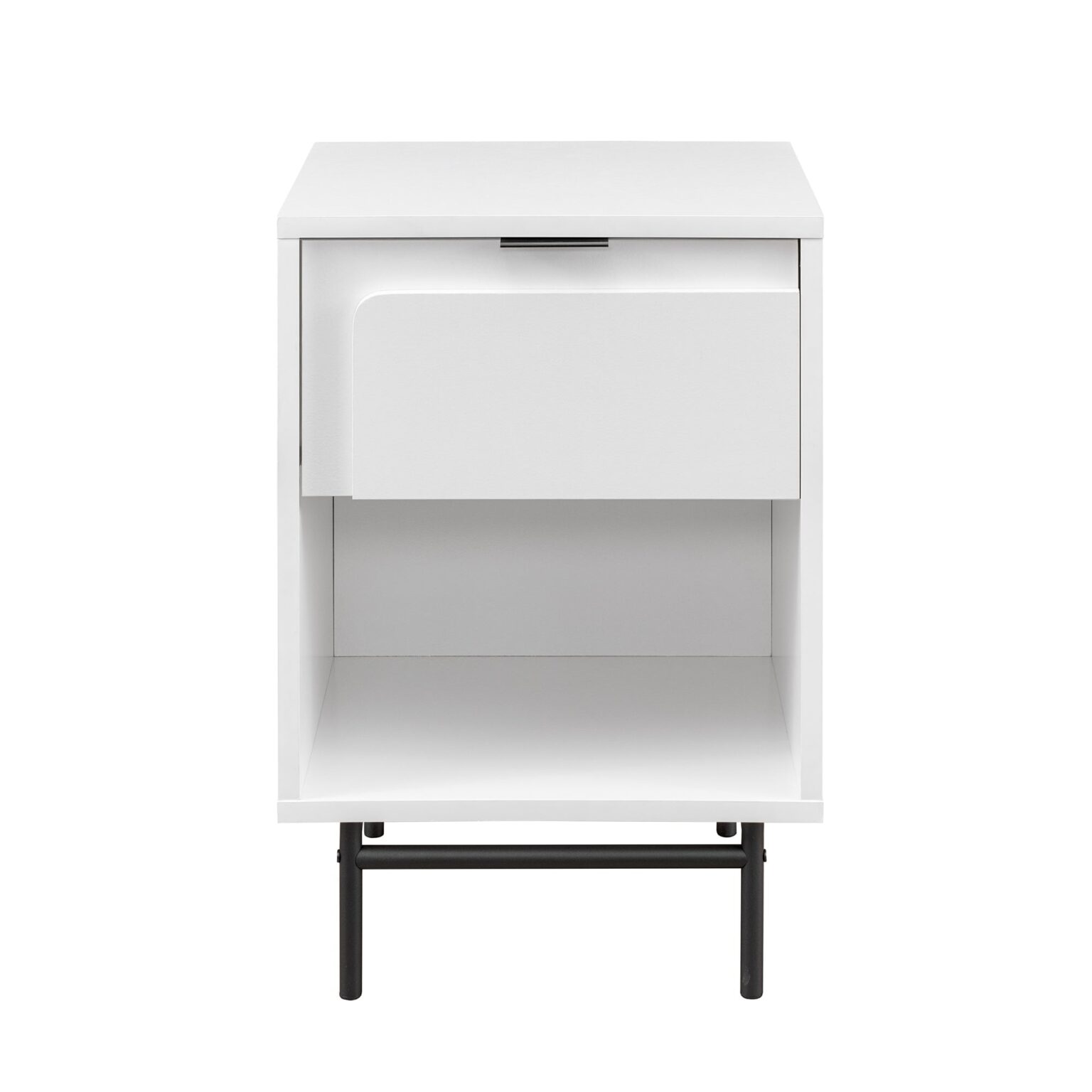 Simple meets style with this Modern Metal-Leg 1-Drawer Nightstand with 3D Detail. The single drawer is a handy place to keep extra chargers, a journal, and other bedside necessities. Your favorite books or a storage basket fit neatly into the open cubby, making this modern bedside table a storage dream. The crisp, boxy silhouette caters to the modern decorator, while the curved drawer face accent adds a tasteful hint of intrigue. Metal legs provide a sturdy foundation for the MDF and laminate body of this contemporary nightstand.