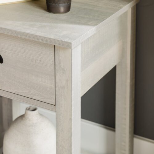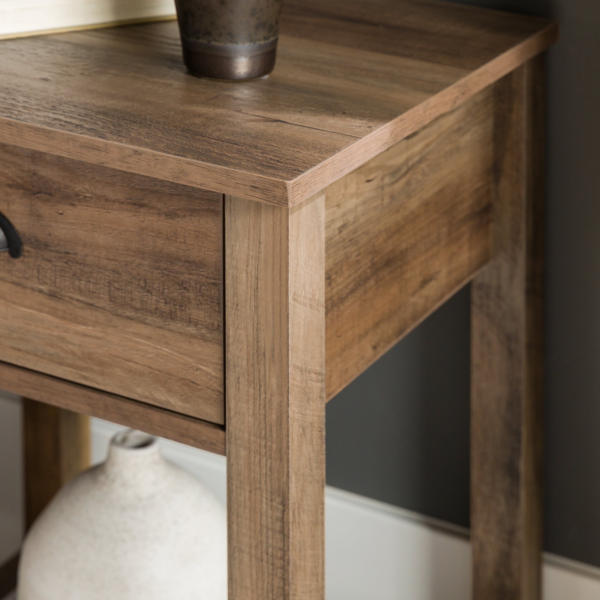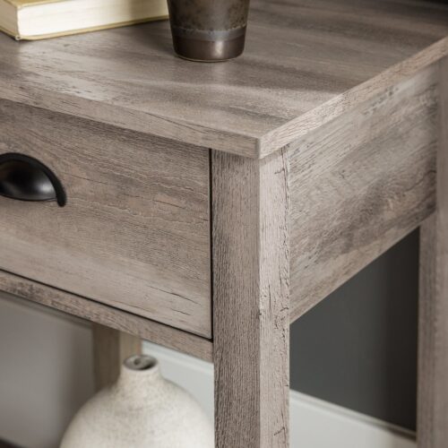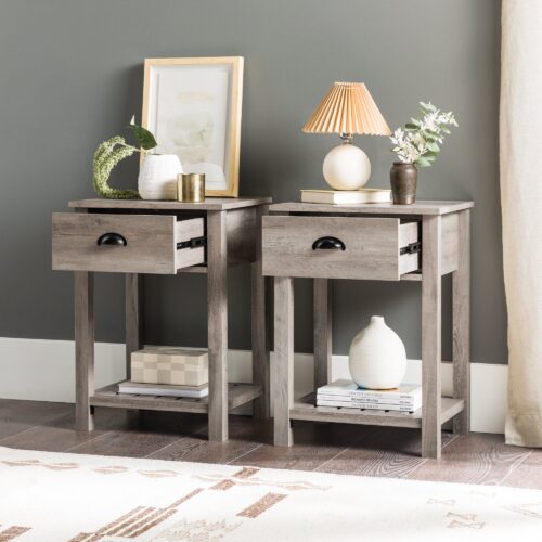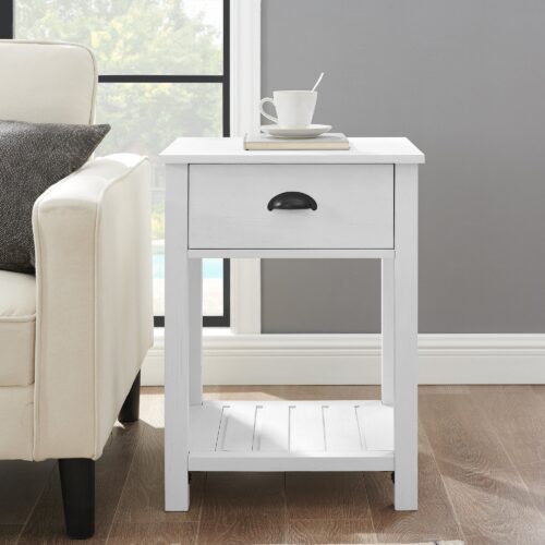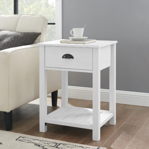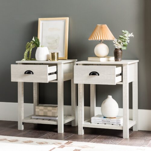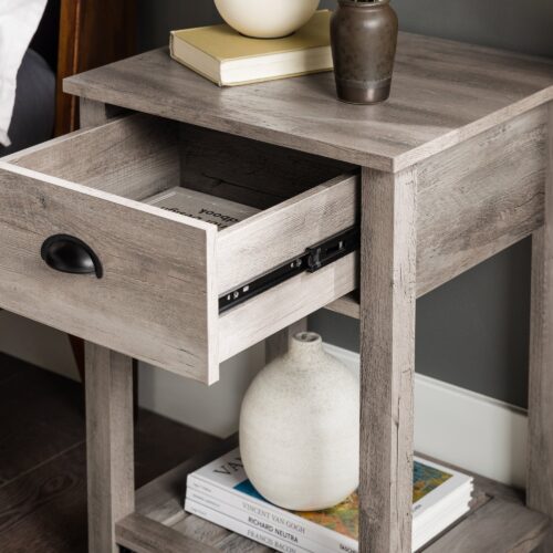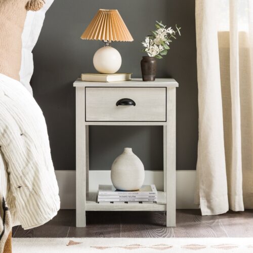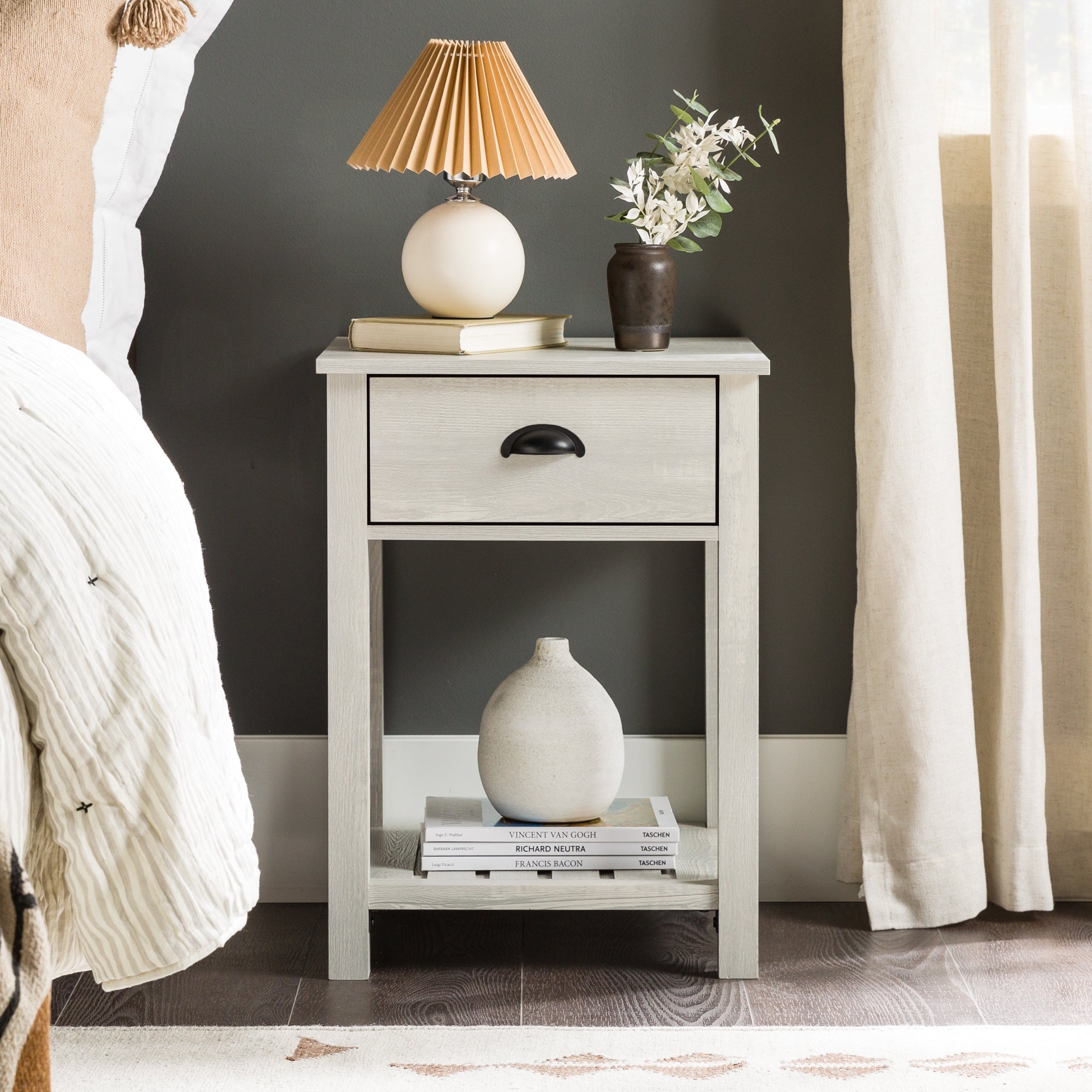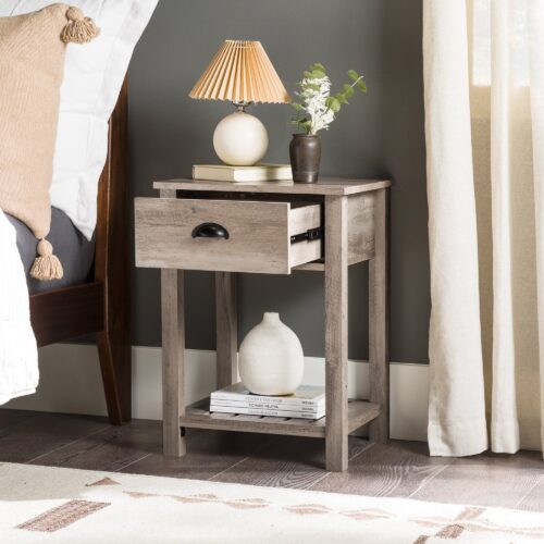 Whether you’re looking to keep things quaint and country or simply organize your home, this one-drawer farmhouse nightstand will satisfy your design desires. The single top drawer with a cup handle features telescoping metal drawer glides for a smooth push and pull track for convenient closed storage. The lower slat style shelf creates open storage while infusing farmhouse style. Use this accent table in the living room or home office for some sneaky storage. Pair with the matching entry table to make a complete set in your home.