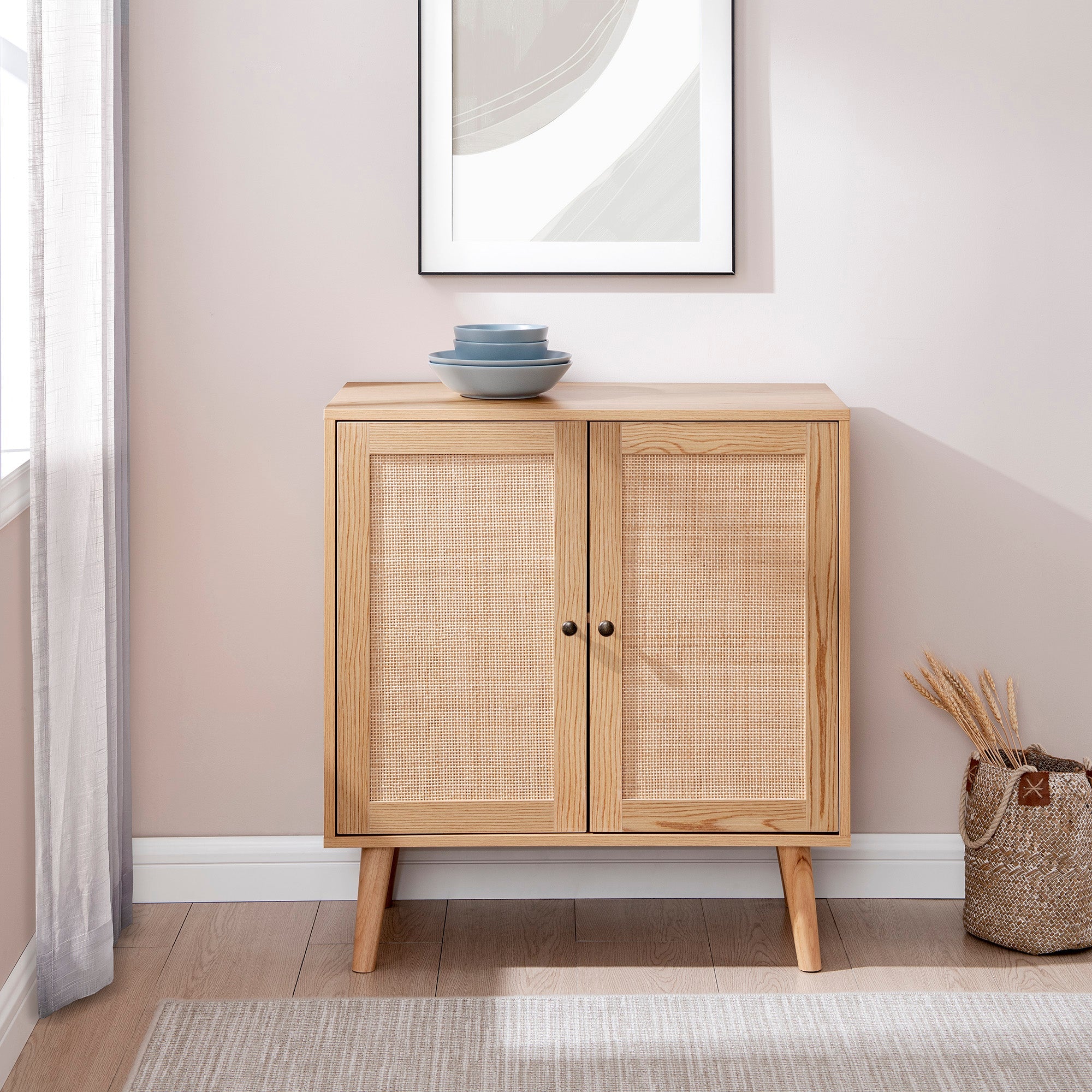 Quell your wanderlust, and greet beach bungalow vibes and a cool, coastal aesthetic in your personal space when you display this boho two door accent cabinet. A solid wood build contrasted by authentic rattan-detailed double doors helps craft the most inviting interior in your bedroom or entryway. Let the adjustable shelf serve as a sanctuary for spare linens, sweaters, or dishware; or remove it completely for more customized storage. Ideal for both small and sprawling spaces, perch this style icon in any alcove to spotlight your favorite corner. Comprised of solid pine wood responsibly sourced from renewable forests, your future tidy-ups are sure to be sustainably stylish for years.