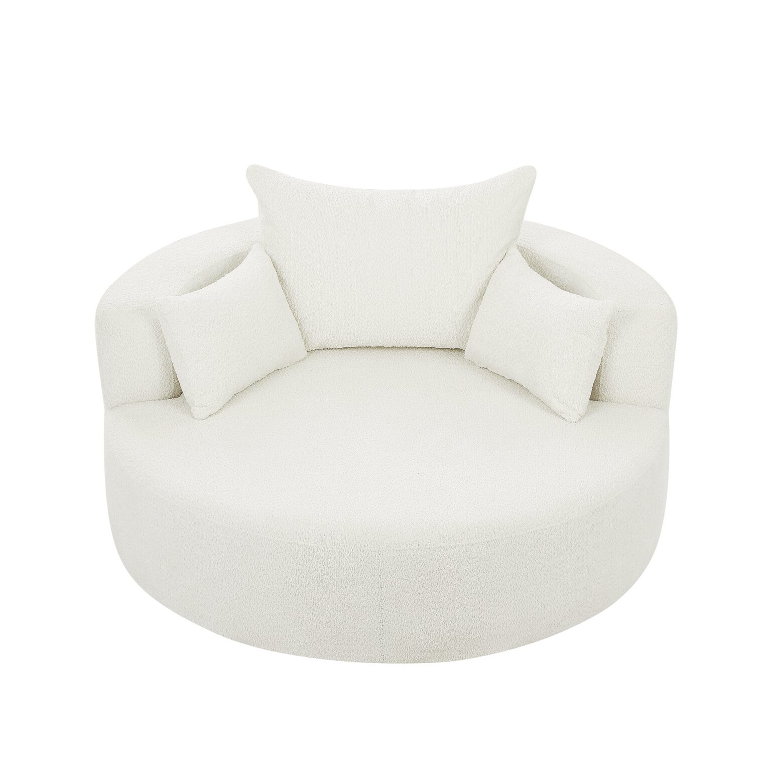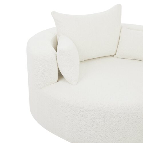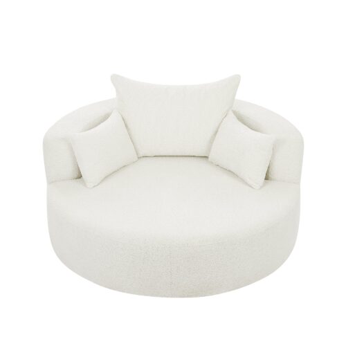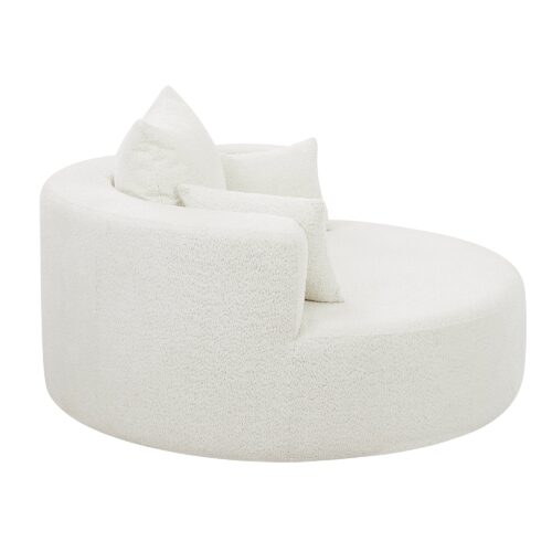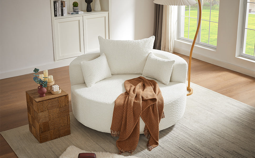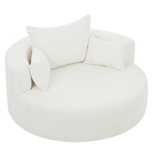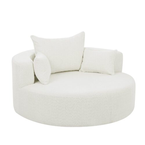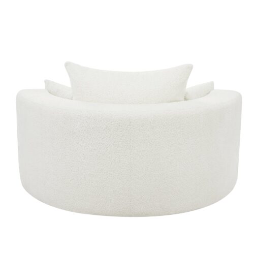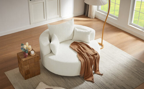 This chair offers a perfect combination of comfort and style. With a 360-degree swivel base, it provides easy movement in any direction. The spacious 39.4-inch seat depth ensures comfortable lounging, while the luxurious chenille fabric is soft yet durable. The removable throw pillows make for easy maintenance, and the chair’s modern circular design adds a sophisticated touch to any space. Despite its ample size, the chair is space-efficient, making it ideal for smaller rooms or apartments. Its versatility and sleek design make it a great addition to any living room, bedroom, or office.