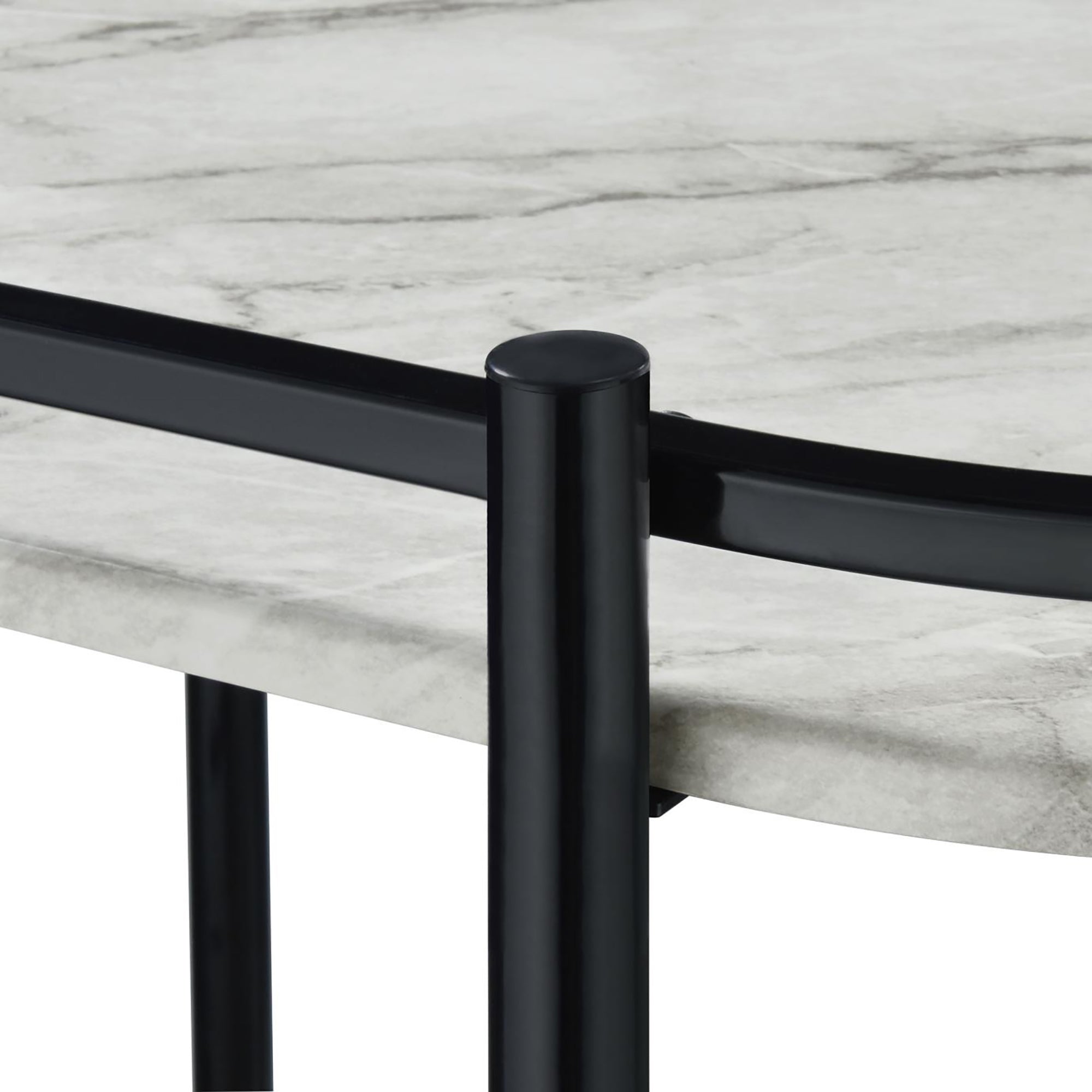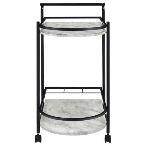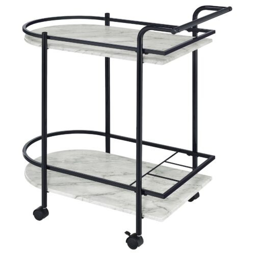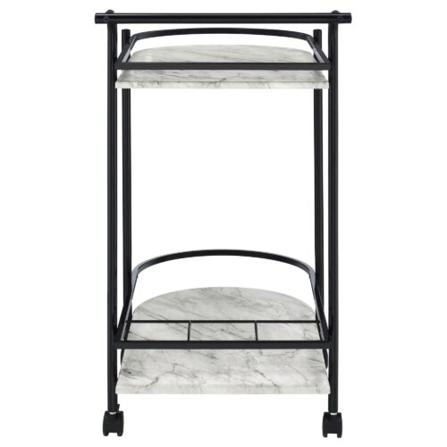 Be ready for entertaining contemporary style with this serving cart, a relic with retro design power and plenty of utility. This faux white marble finish cart with metal framing provides surface space on two levels for beverages, glassware, and incidentals, and includes caster wheels for portability to work a room.
