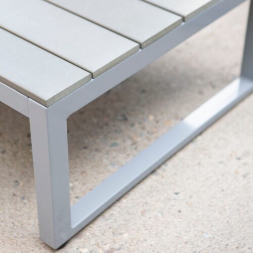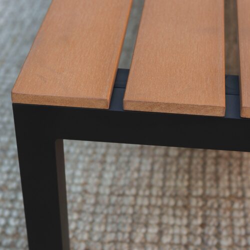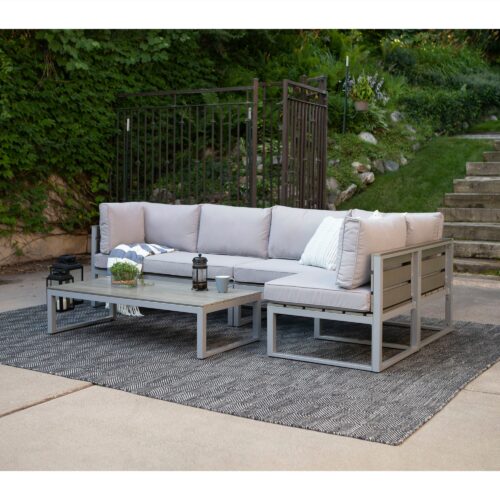 Elevate your next summer BBQ with this four piece patio conversation set. This modern piece fits all contemporary styles. Dress up its coastal flair with blue throw pillows or keep it chic and glam. Fabric seat loops allow for the UV resistant cushions to be removed and cleaned. Cast aluminum framing with unique, polysynthetic wood accents means this patio chat set is made to last, so enjoy picturing the rest of your stunning summer nights in style. And did we mention it comes with a coffee table?