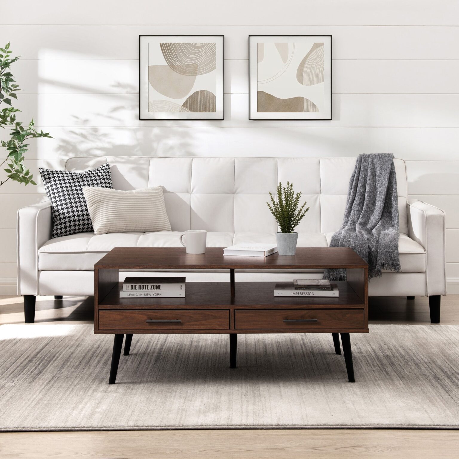 Contemporary contours, minimalist metal drawer pulls, and ample open storage: what else could a modern home need? This coffee table is both storage savvy and stylish with two drawers on smooth metal glides and divided open cubby space. With a quick build time, lightweight frame, and small-space-friendly silhouette, this coffee table will lend your space an effortless elegance that’s easy on the eyes as well as your budget. Pair this piece with the matching side table and entry console to curate a cohesive aesthetic throughout your abode.