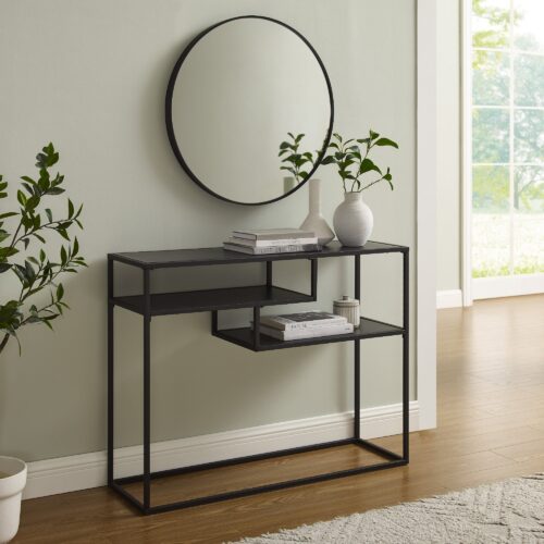 Give your hallway, entryway, or mudroom a quick and easy refresh with this contemporary console. Two floating shelves lend additional display space, while a spacious tabletop leaves room to host houseplants, candles, and décor. This entry table’s sleek design makes it the ideal couchside storage companion, as well as the perfect piece for your small space or apartment. With included wall-mounting hardware and a sturdy, powder-coated steel build, this piece is sure to debut your favorite décor for decades.