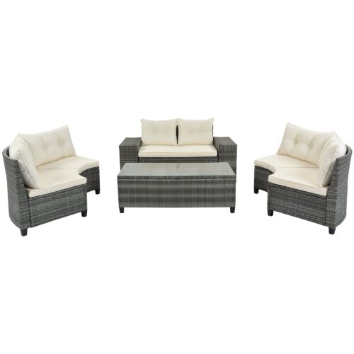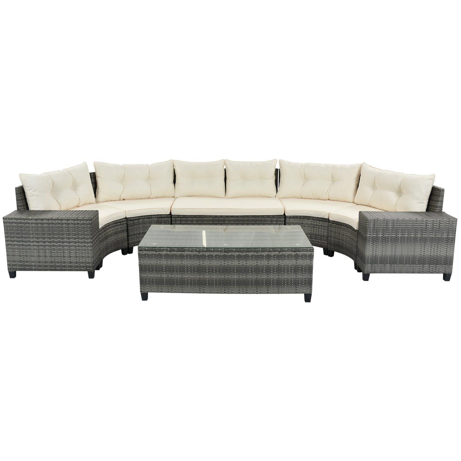 This wicker sofa set is constructed from top quality wicker, a durable material that’s fitting for the outdoors, this set includes 4 scalloped sofas, 1 double seat, 1 table and 2 side tables, which are for placing things and supporting your body for your comfort. The hand-woven wicker has the look and texture comfortable of natural wicker with high UV resistance, and with cushions to provide not only comfortable but durable.