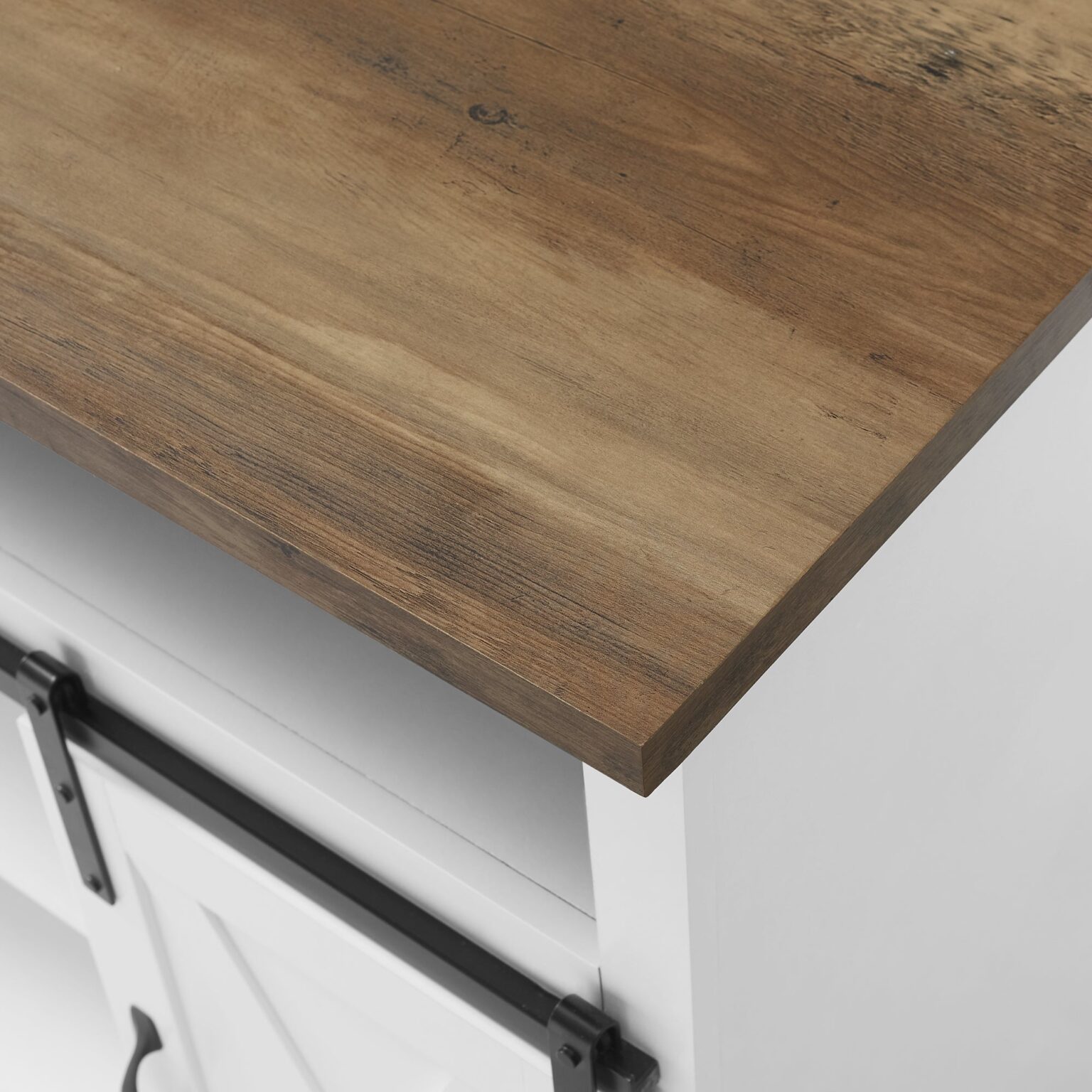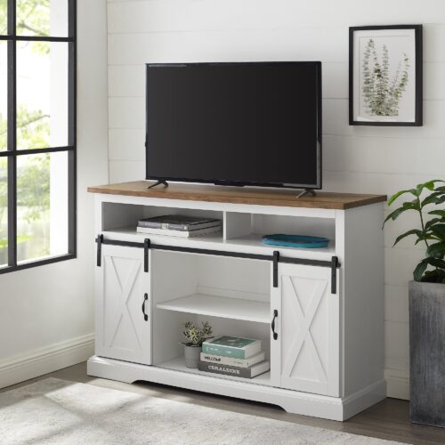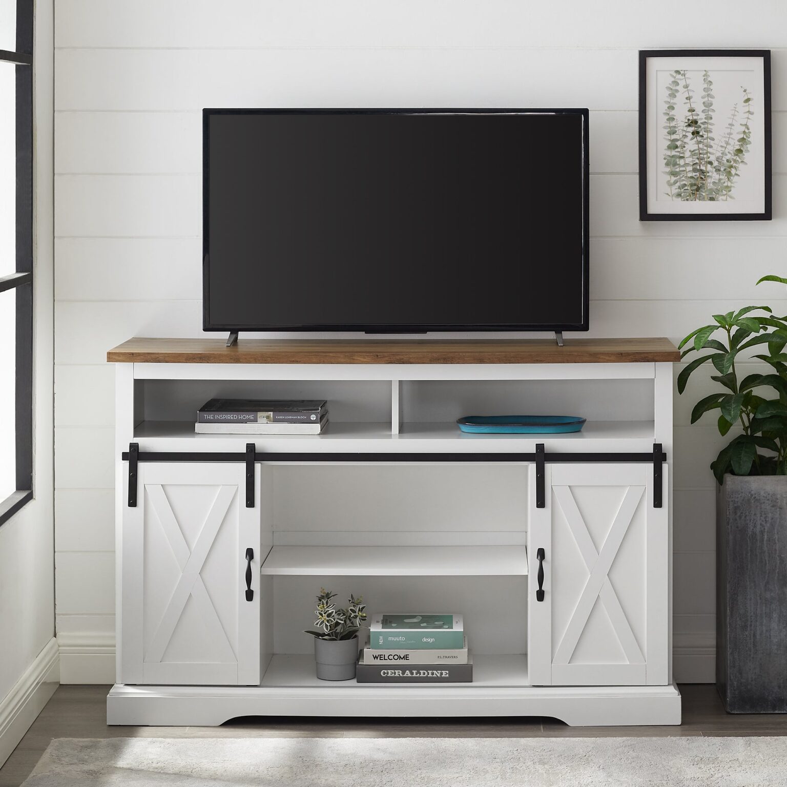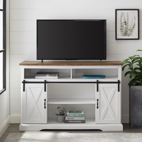 Design your home with the storage space you need by incorporating this 52-inch TV stand into just about any room. With a versatile design, this TV stand can be utilized not only as an entertainment center in your living room, but as either a buffet in your kitchen or a storage cabinet in your bedroom. With plenty of storage space provided, from the open shelving and closed shelving with sliding barn cabinet doors. Position the sliding doors in the center or sides, with your media, electronics, accessories, glassware, or décor on the shelves. Including adjustable shelves and cord management to keep your room essentials organized and in one spot. Crafted of warp-resistant MDF, durable laminate, and metal for a modern farmhouse and traditional style. Can fit up to a 60-inch TV.