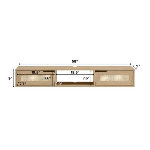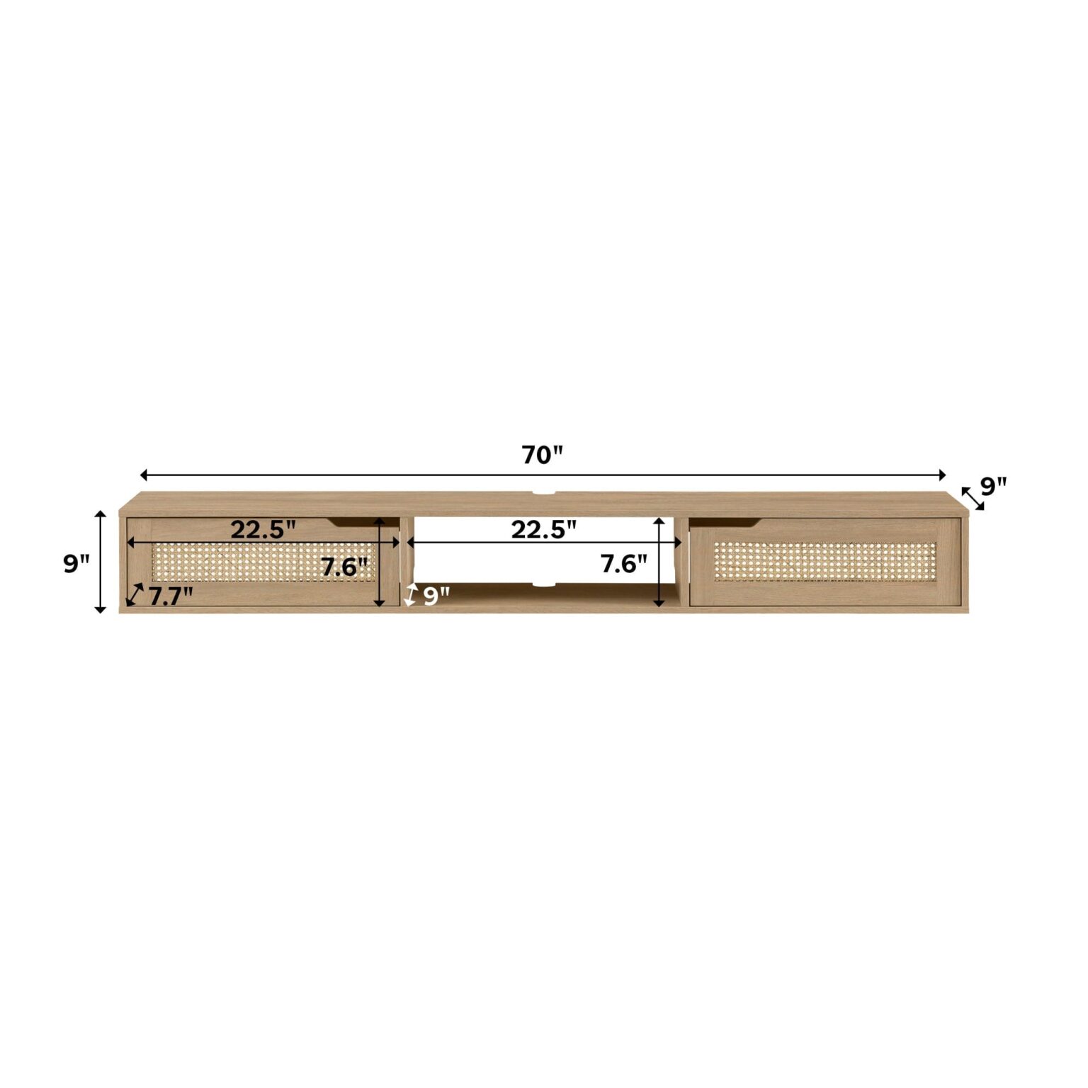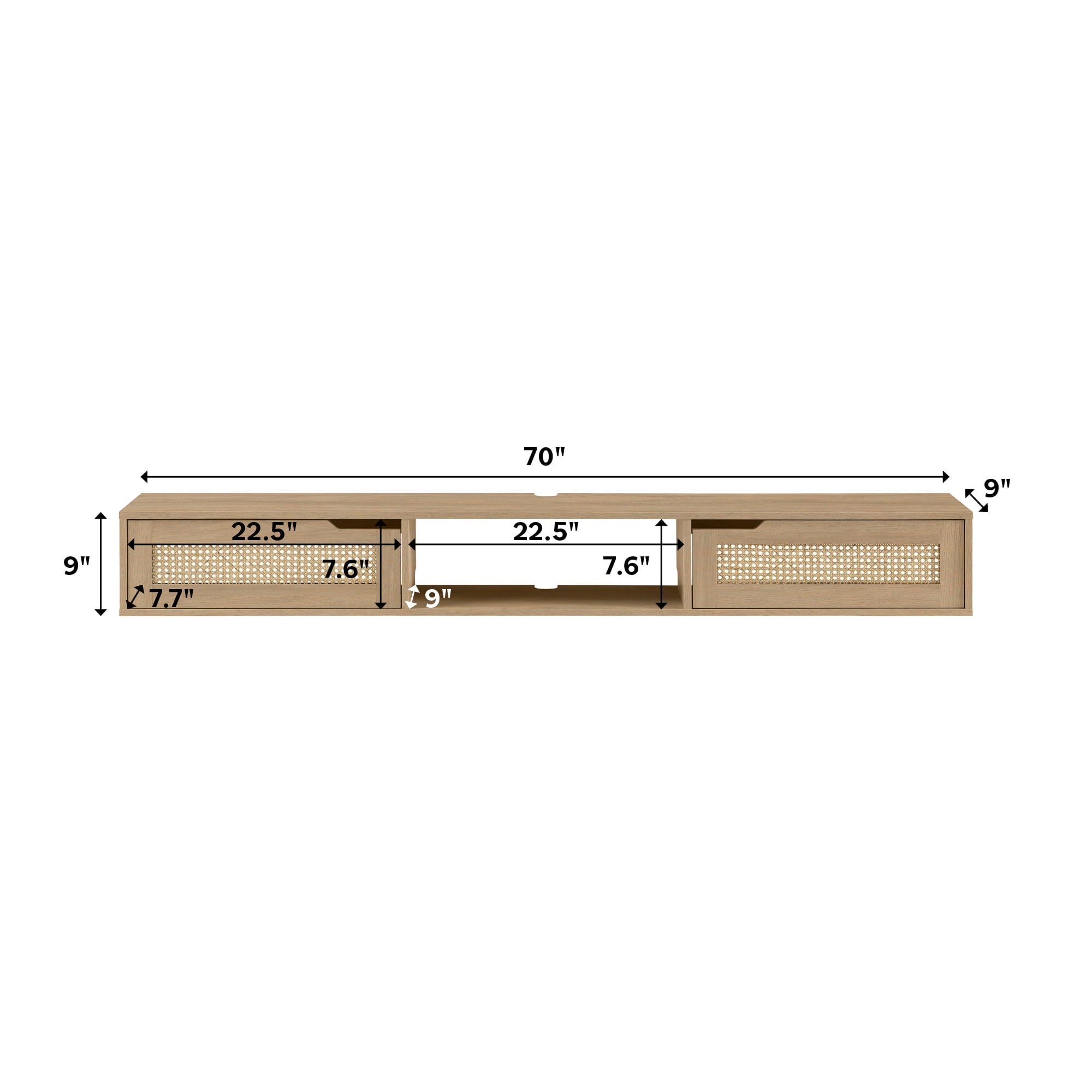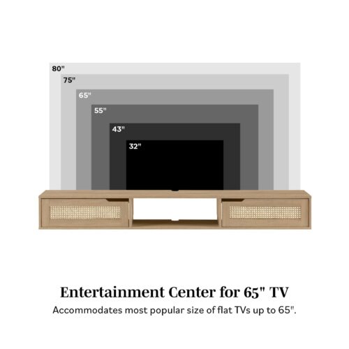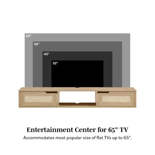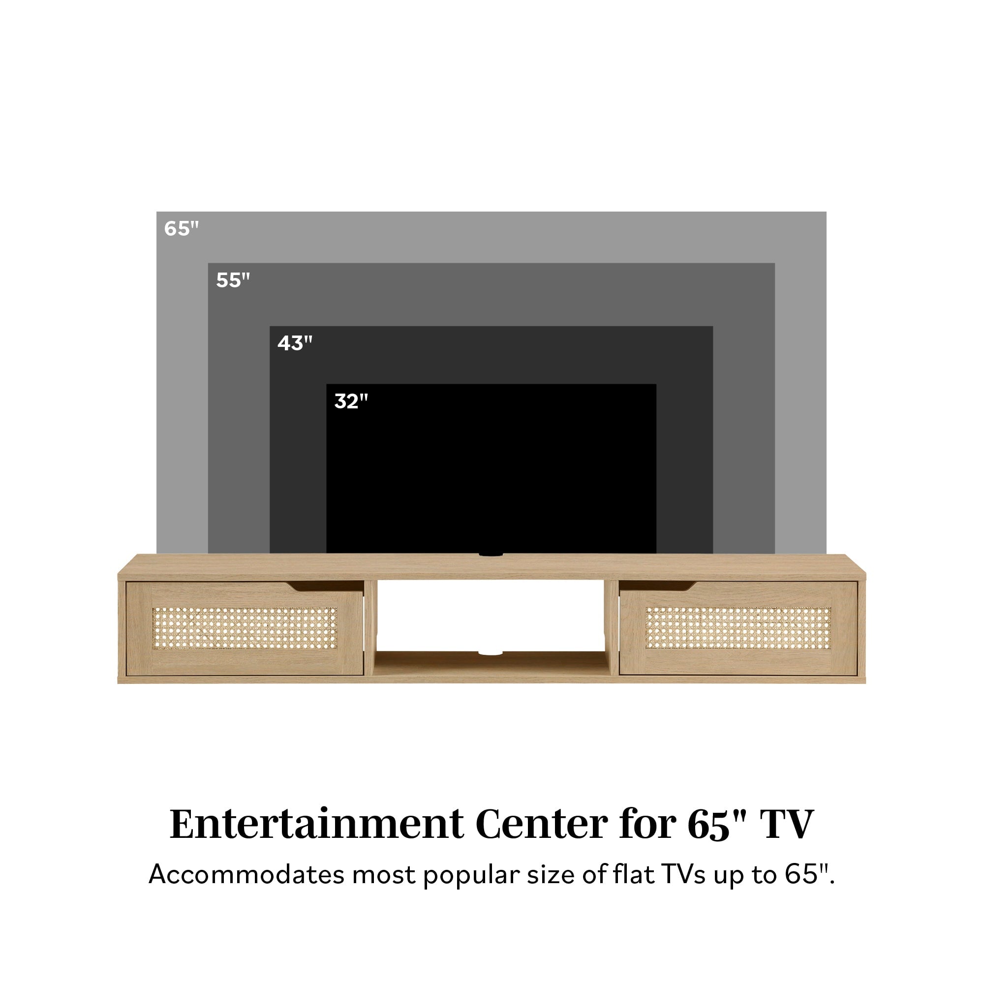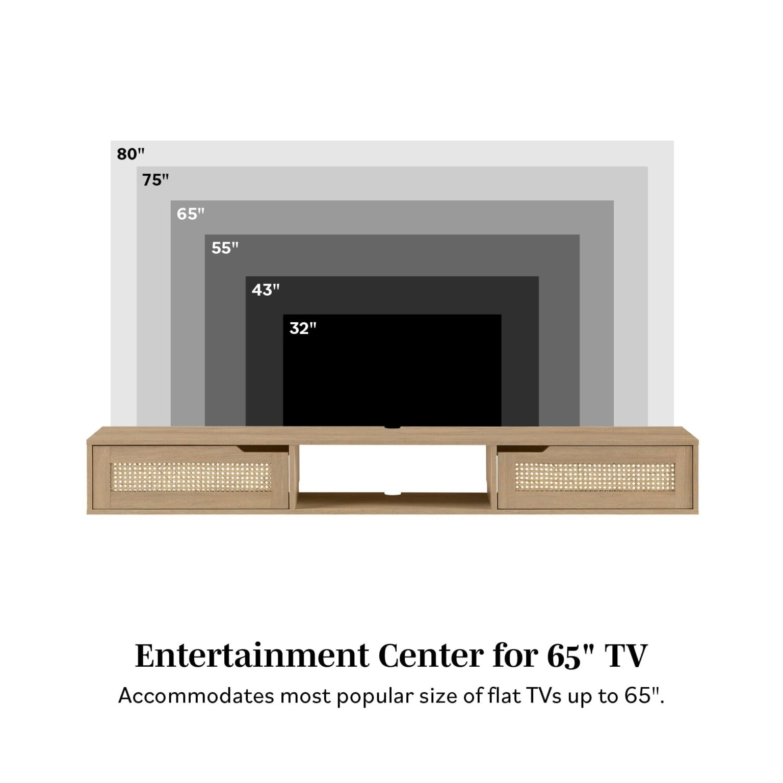 Channel surf in style with the cool, coastal aesthetic of this floating TV stand. Create your favorite spot to hang around this stylish piece with its floating display and minimalist yet ample storage space. Use the middle open shelf to display your sound bar, streaming devices, or favorite décor while you conceal clutter behind the rattan doors. With sleek finger pulls on each door, cord management ports, and included wall-mounting hardware, your entertainment hub will be organized and ready to host a soiree or solo streaming sesh with contemporary finesse.
