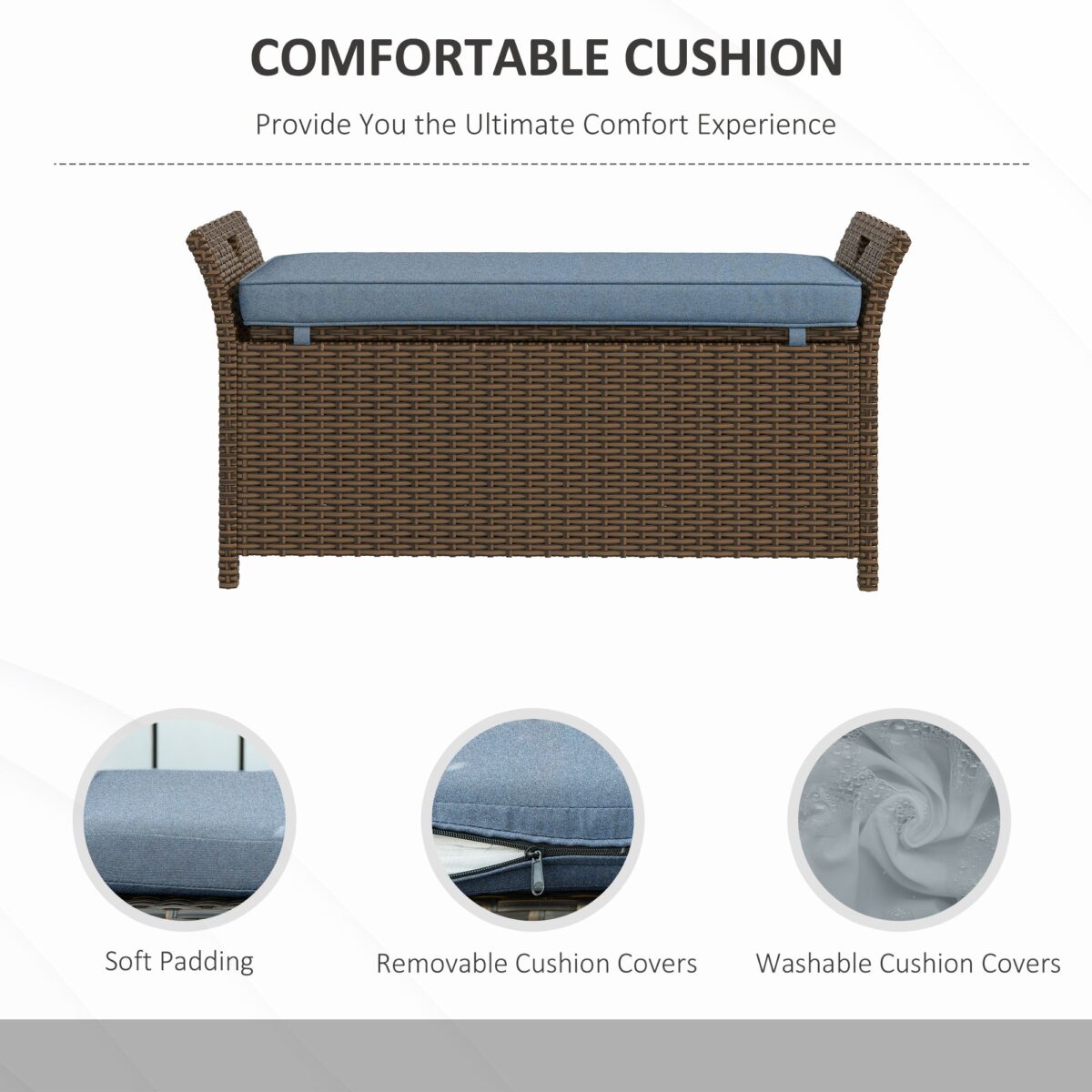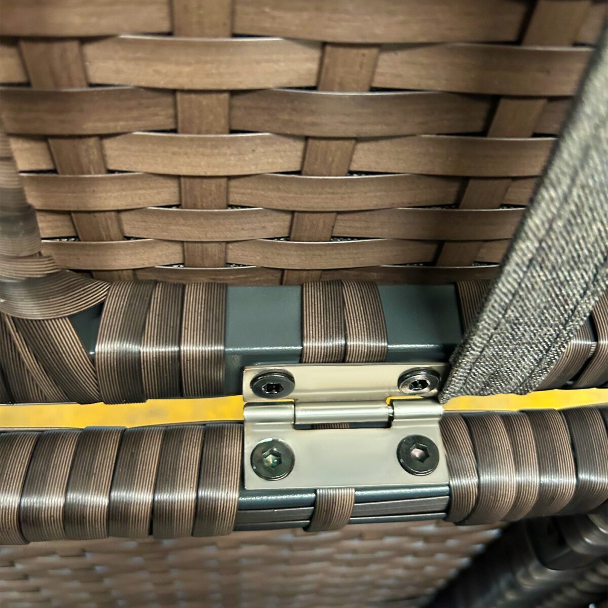 Crafted from hand-woven PE rattan, this bench combines the classic look of wicker with modern durability, resisting water and weather. Its powder-coated steel frame ensures stability, while the lightweight design and convenient side handles make it easy to move. Flip the seat to reveal a hidden storage space for all your outdoor essentials.