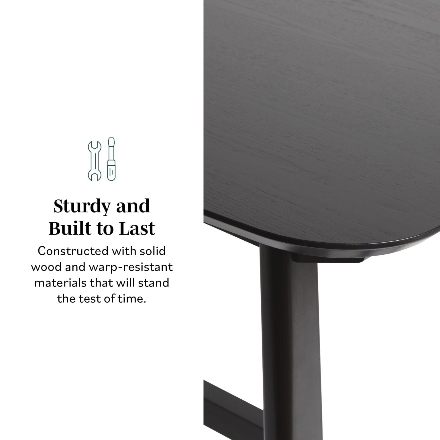 This 60-inch mid-century modern dining table is the perfect addition to your home. The sleek design goes well with a host of chair styles and colors. The solid wood, trestle-style base isn’t just for looks; it also adds sturdiness and durability. The veneer tabletop is equally durable, ensuring your table stands up to everyday living. Use this beautiful table in compact dining areas, kitchens, or even in an office space. It’s the ideal size for seating four to six people, making it perfect for everyday living and hosting guests. No matter where this table lands in your home, you’ll love its combination of aesthetics and functionality.
