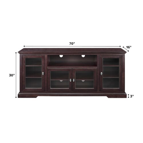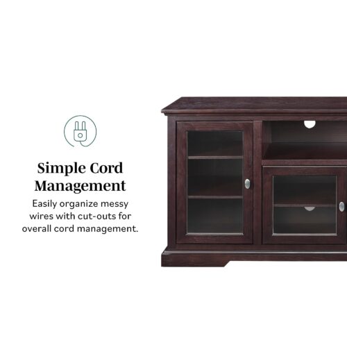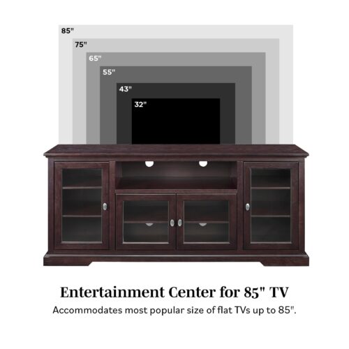 With a versatile design, this console can make a wonderful accent console in your entryway or an entertainment center in your living room. Plenty of storage space behind glass paneled cabinets for your movies, CDs, and electronics, or décor. The adjustable shelving makes it easy for you to fit the items you need to, to keep your living space clean. This TV stand can accommodate most flat-panel TVs up to 85 inches. Crafted from manufactured wood, this media console has a traditional style that’s timeless.