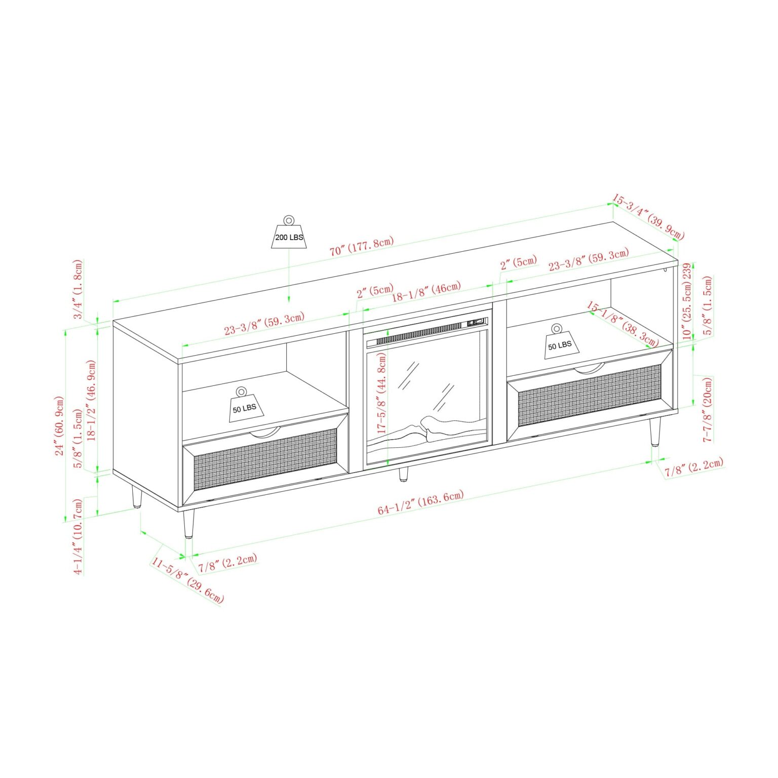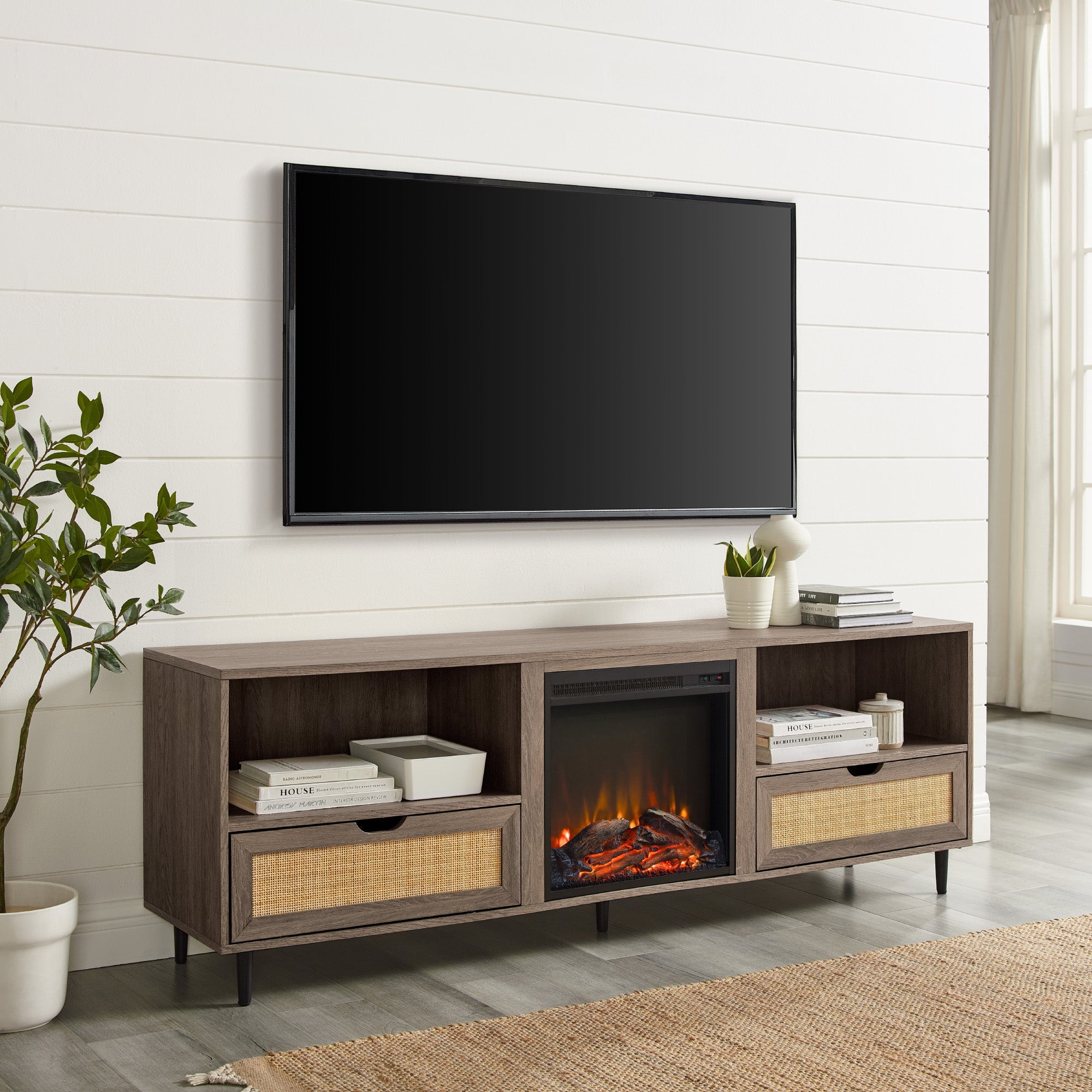 Reminiscent of a coastal retreat, this rattan-door fireplace TV stand will lend your home an instant style upgrade. The stunning cane door fronts can be dropped down on metal hinges to easily conceal clutter. While its simple silhouette will be the eye-catching style icon that pulls any room together, this ample storage is the true hero. With enough space to house your record collection, streaming devices, and thrifted treasures, this gem gives major main character energy and basically does the decorating for you. And with its removable fireplace insert, create a cozy retreat year-round and enjoy the crackle of the faux flames and heat separately or simultaneously with the flip of a switch.