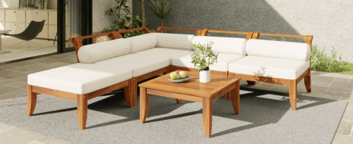 Gather ’round and create unforgettable memories with loved ones in your outdoor oasis. Our 6-piece Acacia Wood Patio Sofa Set is designed to bring people together, with a customizable L-shaped configuration that’s perfect for dynamic entertaining.