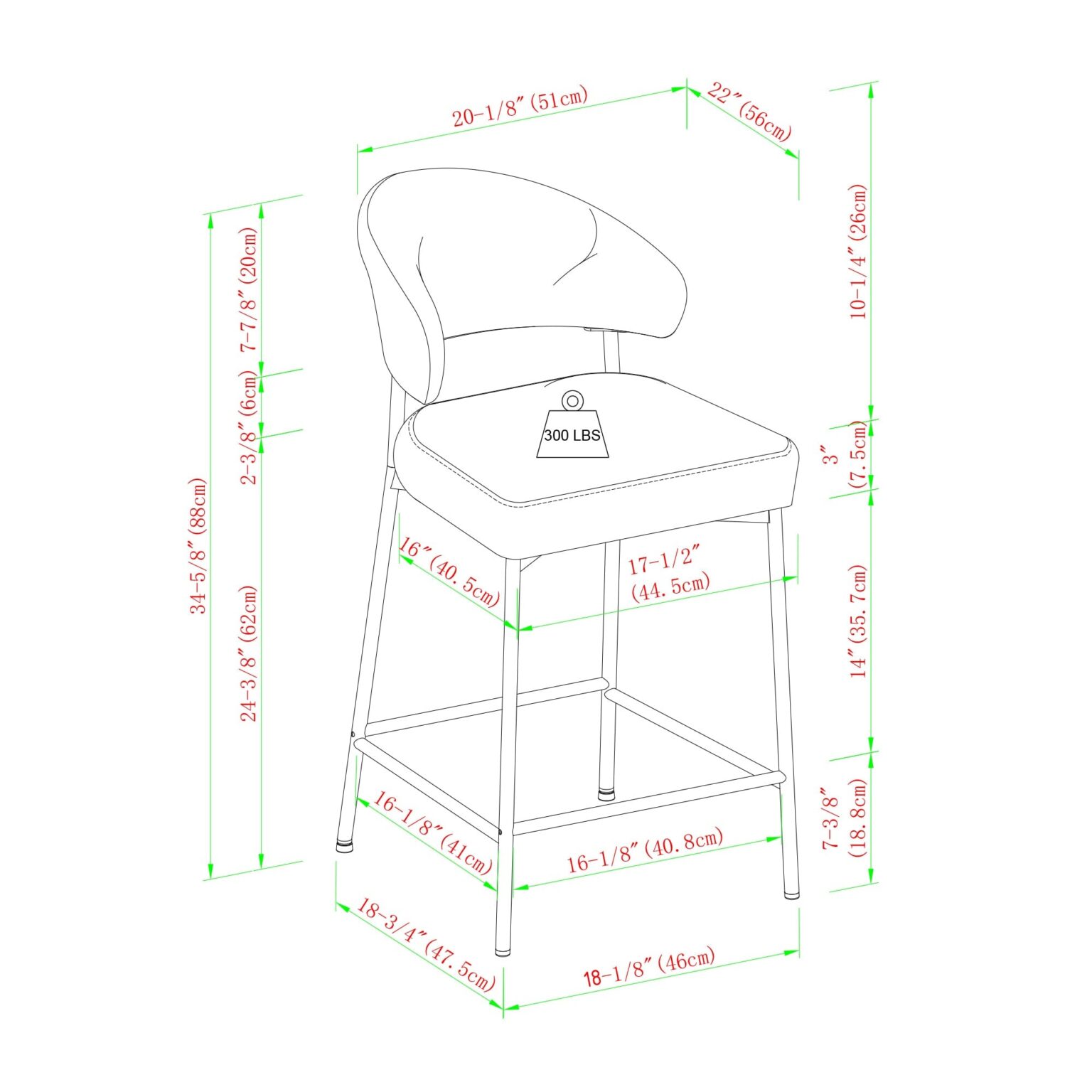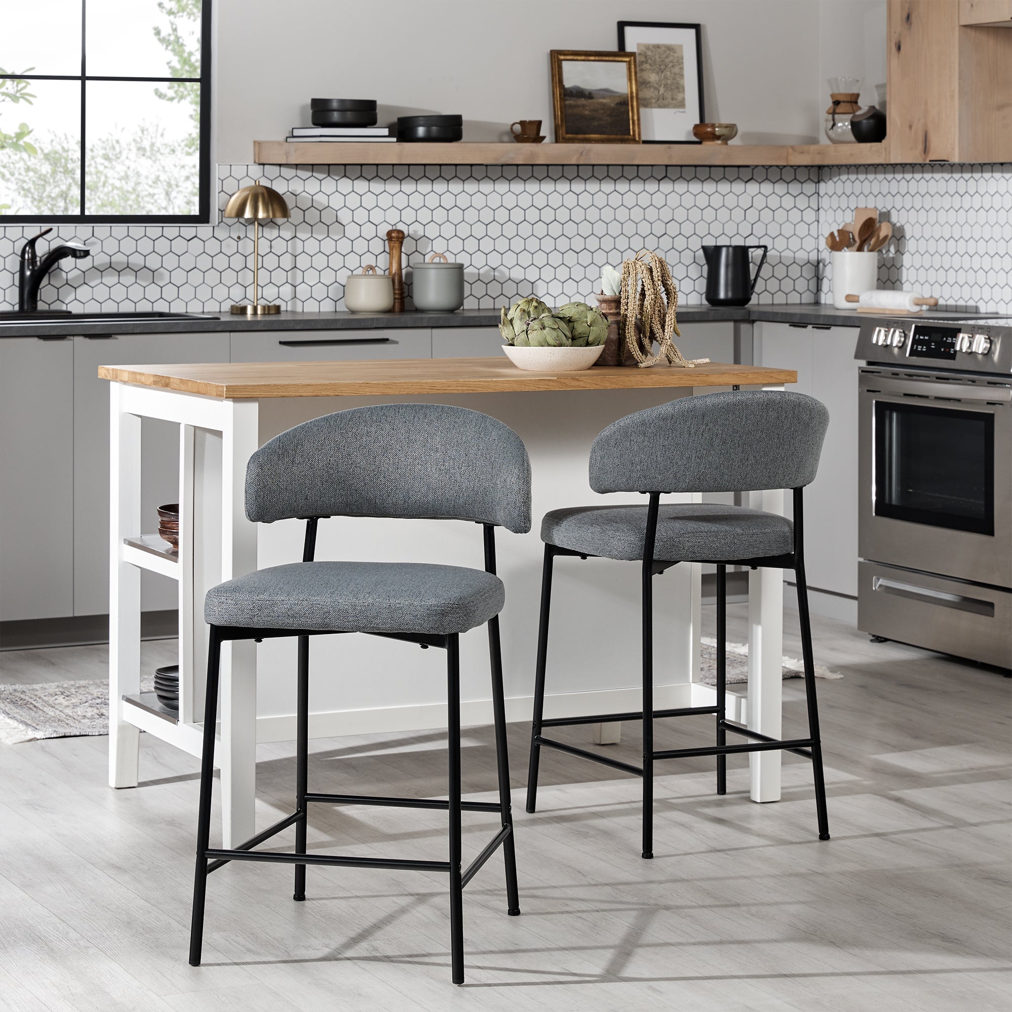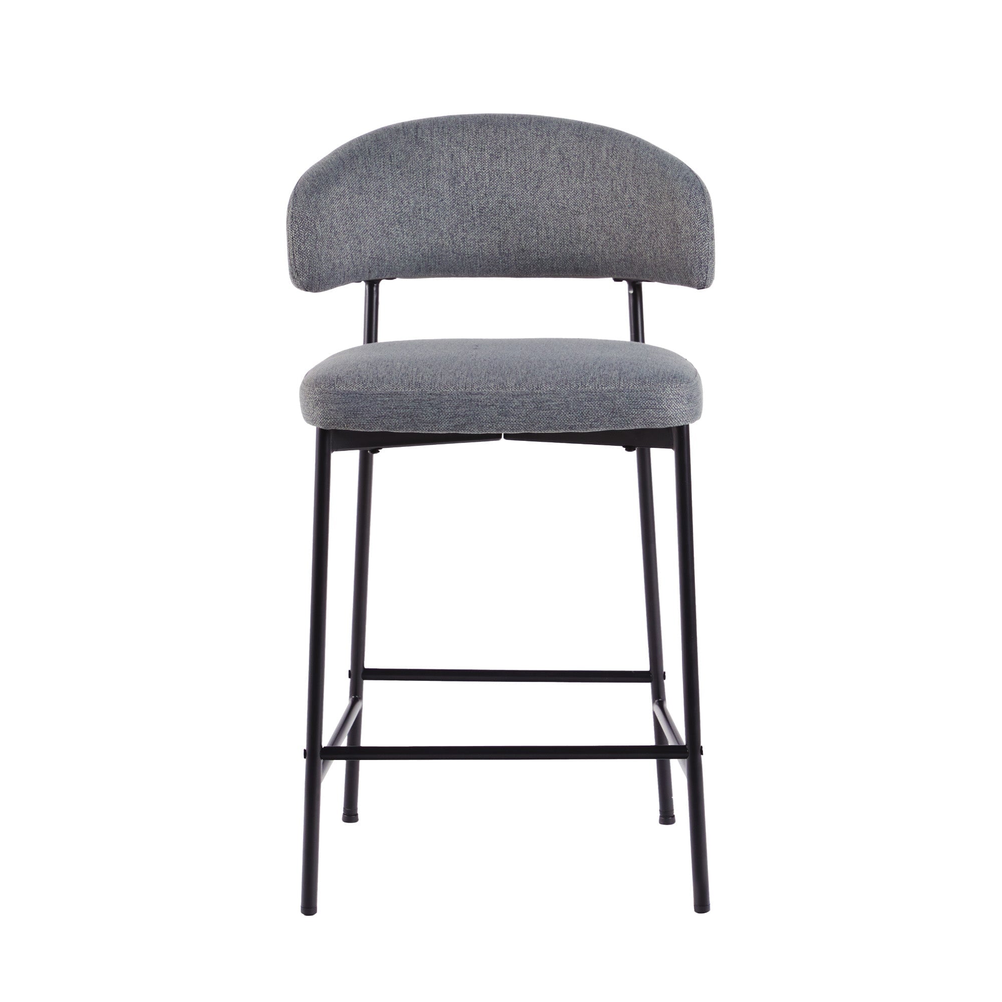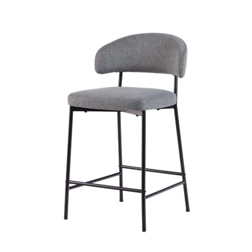 This set of two upholstered bar stools is just the modern look needed to complete your kitchen or bar area. The stylish, curved back design makes a statement, but it’s not just for looks. Meals will be more comfortable and less rushed when you enjoy the comfortable shape and high-quality padded foam seating. The durable, powder coated steel base ensures your chairs stand up to everyday use, and the high-performance fabric is easy to clean. Adjustable foot levelers make it easy to balance your chairs. Quick and easy setup allows you to start hosting guests right away.