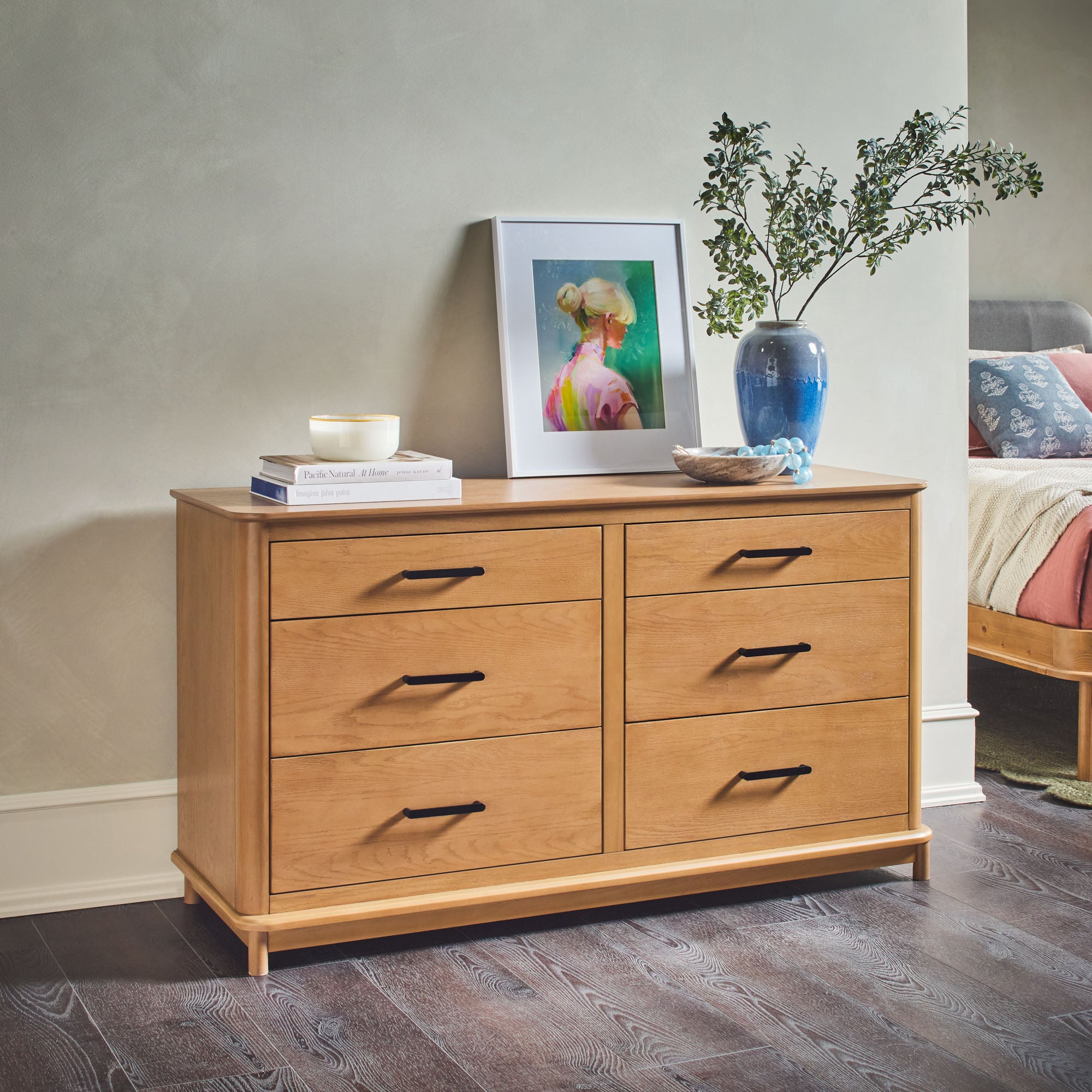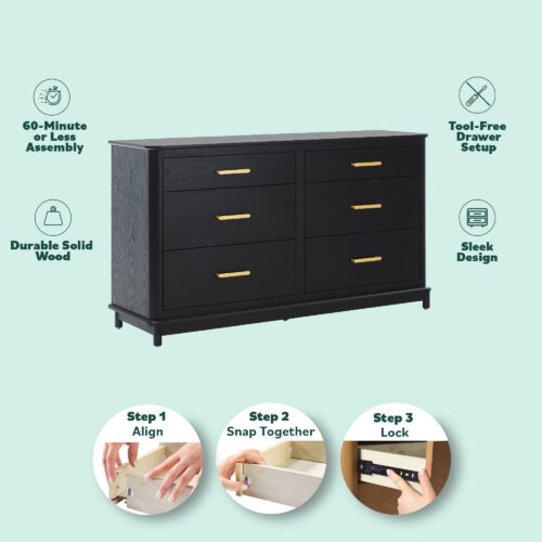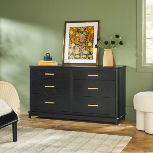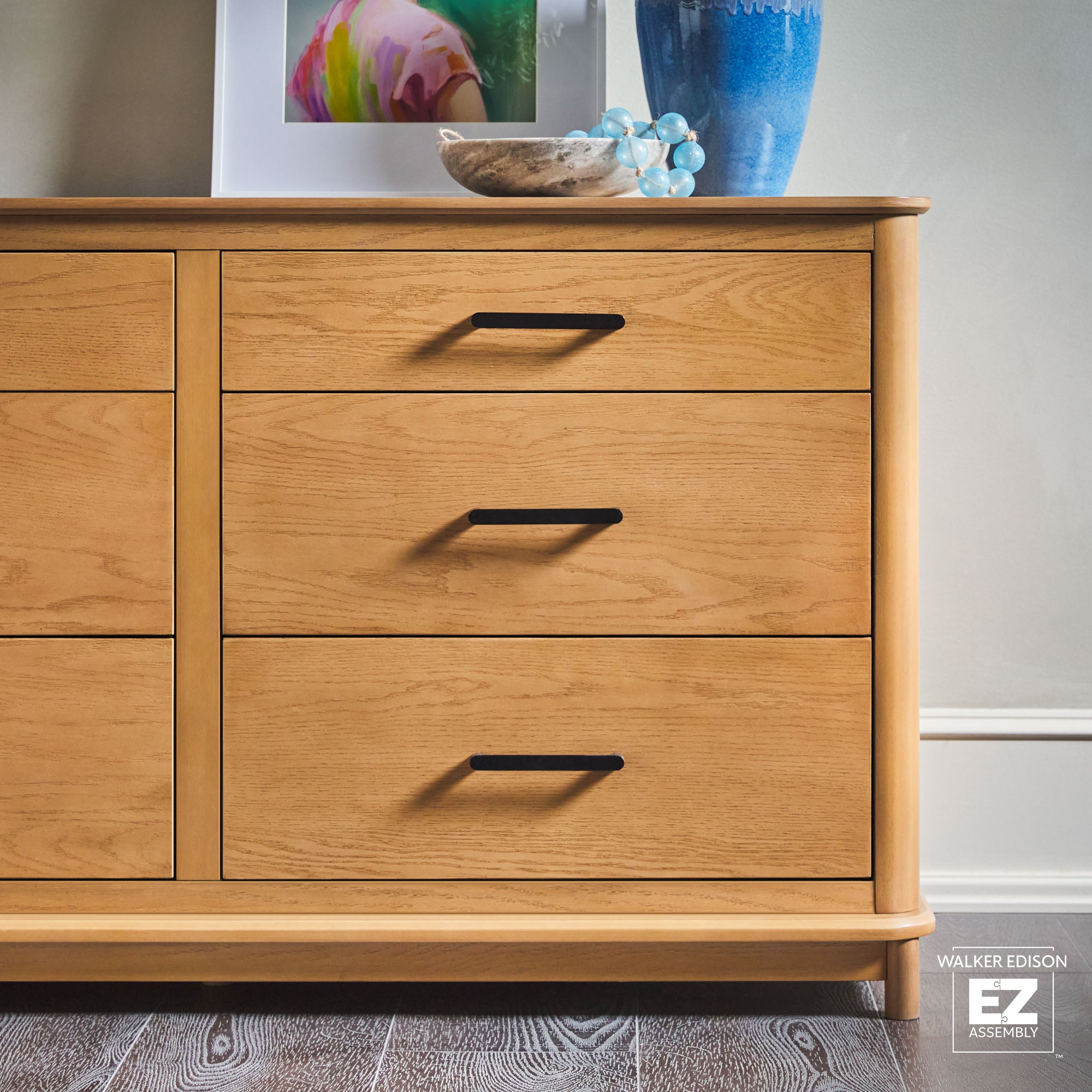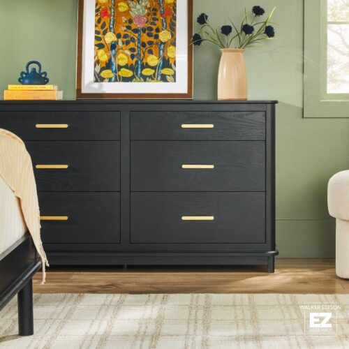 Made with our newest Walker Edison EZ Assembly™ drawers innovation. Easy to assemble, a sleek pairs-with-anything design, and high-quality construction at a budget-friendly price. Have we thought of everything with this contemporary, 6-drawer dresser? Why yes, yes we have. With subtly curved edges on the front of the case and a decorative lip detail, this dresser is a sophisticated, elevated choice for any room. Metal roller glides offer a luxurious feel when you open and close each spacious drawer, and a combination of solid and engineered wood offers durability made for everyday living. Another perk not to miss? Ultra-easy drawer assembly technology means you can Say Goodbye to Frustration and set up this dresser in a snap, no stress required.