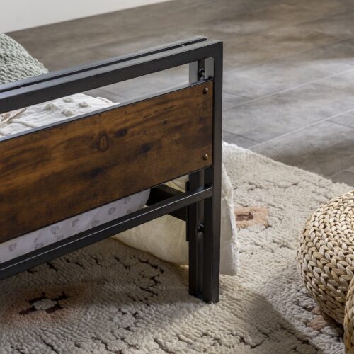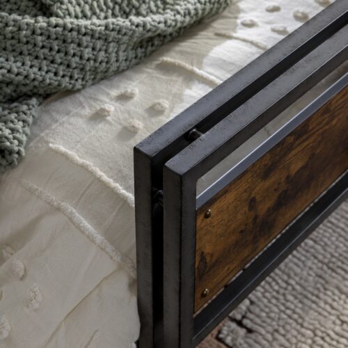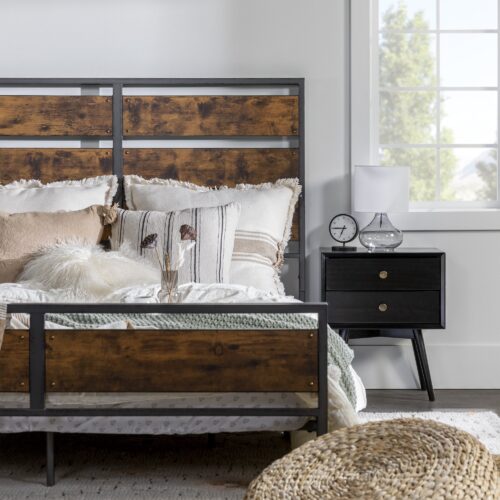 Make a statement with this rustic farmhouse style queen bed frame, it is the perfect accent for any bedroom in your home. Its sturdy construction of powder coated metal and engineered wood is practical, yet stylish. Features a textured metal finish for a distinct industrial look that will add volumes to your bedroom’s ambiance. Includes headboard, footboard, and rails for a complete set.