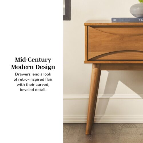Unmistakably mid-century modern, this piece will boldly make a statement, whether you use it for added storage in the living room, TV room, or your bedroom. Spacious drawers lend a look of retro-inspired flair with their curved, beveled detail, as well as modern functionality with their spacious interiors and smooth solid wood glides. Sleek, hardware-free drawer pulls add an element of classic modernity to the piece, while its durable, responsibly sourced solid wood build and included anti-tip kit ensure that this sustainably stylish piece remains a staple in your abode for years.