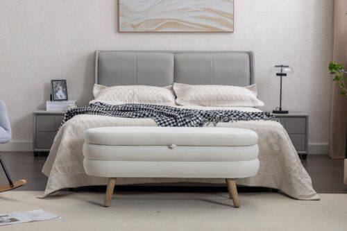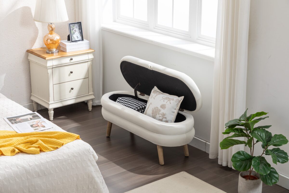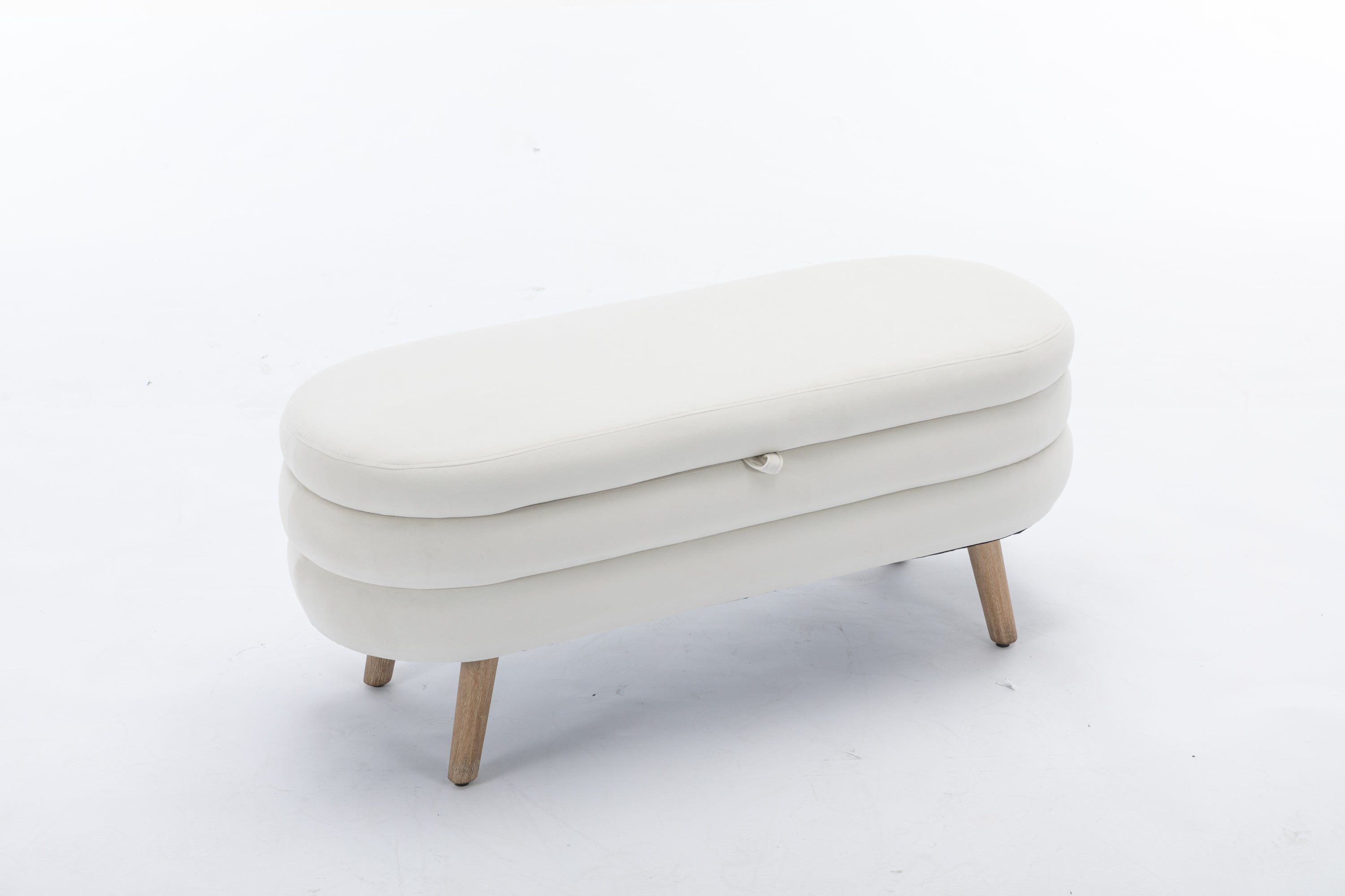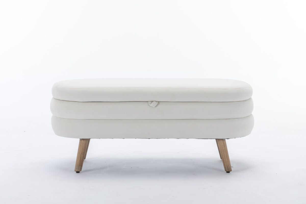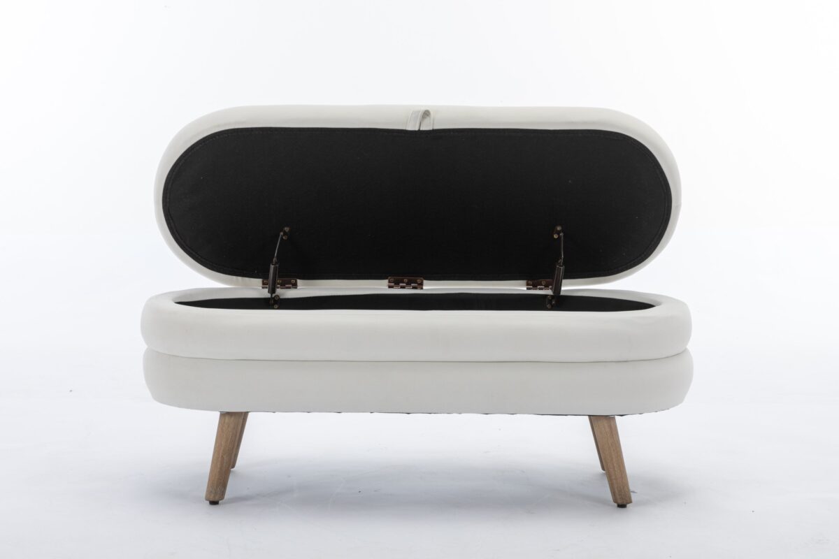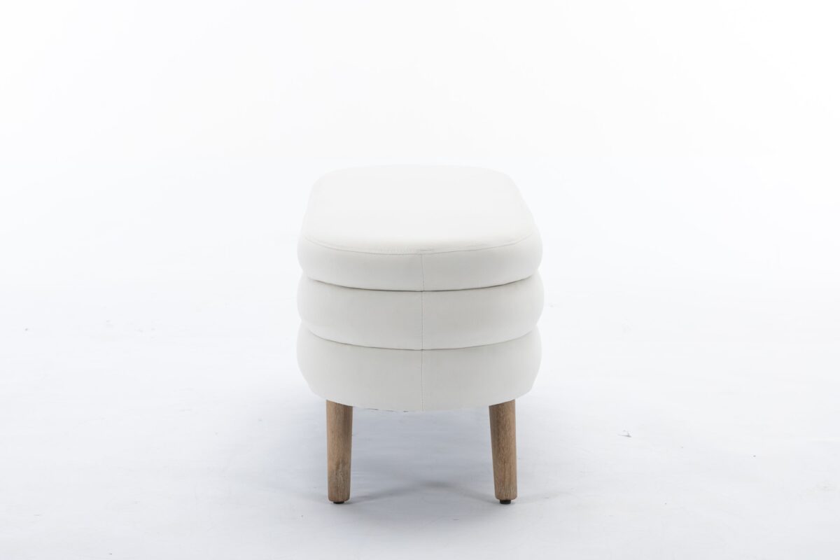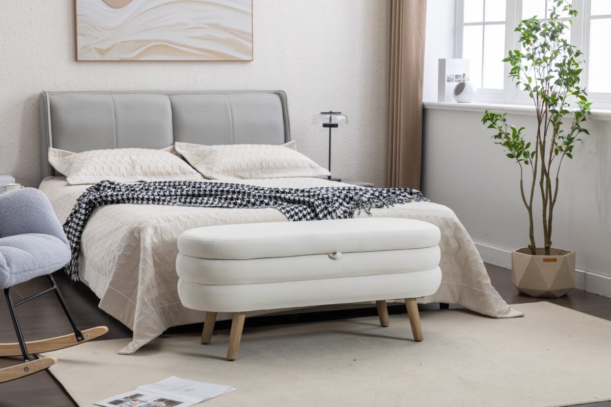 White Velvet Storage Bench, a chic addition to any bedroom or living room. Crafted from luxurious velvet fabric, this modern bench offers both comfort and functionality with its tufted design and internal storage.