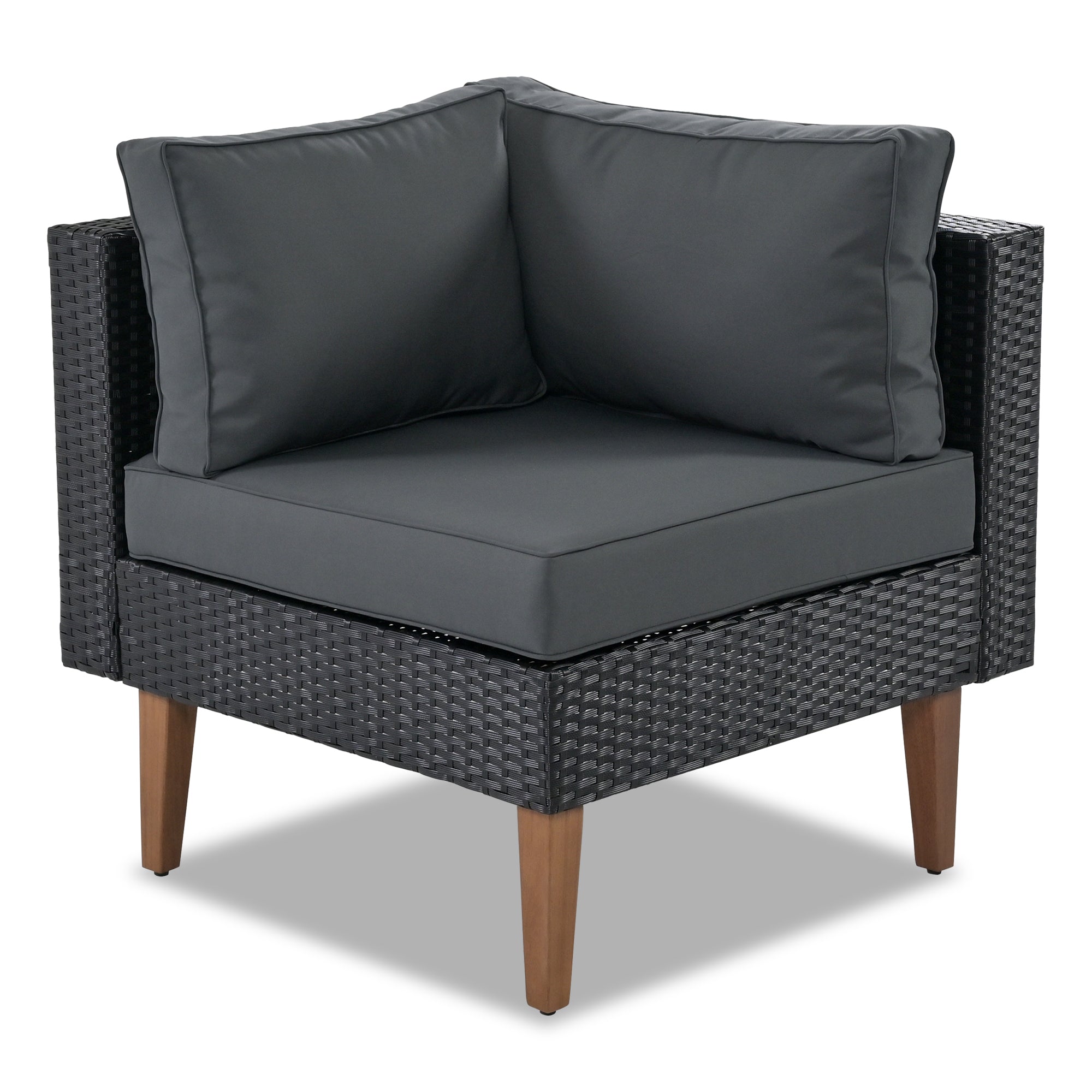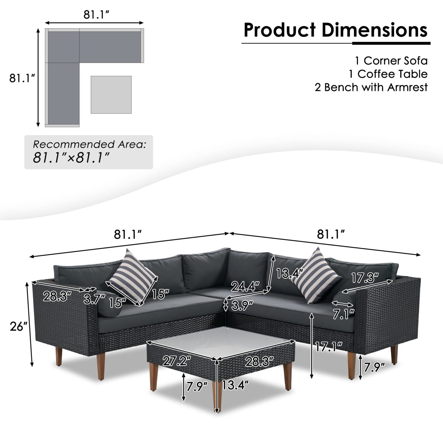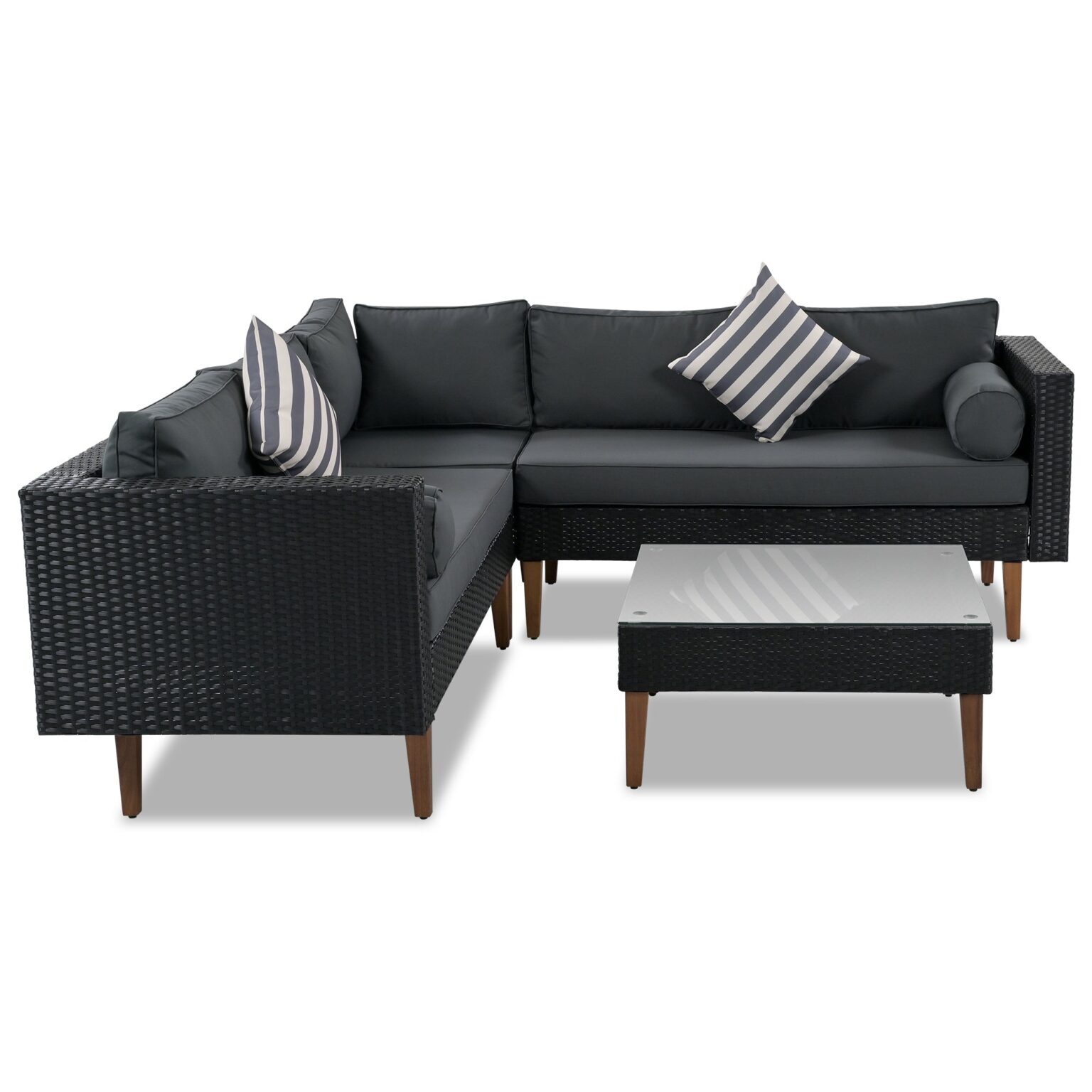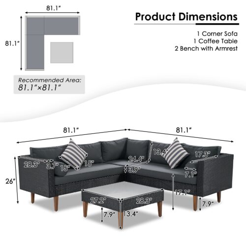 The Outdoor Wicker Sofa Set is the perfect addition to any outdoor living space. Designed with waterproof and UV-resistant wicker material and polyester fabric, this sofa set is built to withstand harsh weather conditions. The solid wood legs feature adjustable feet, making it easy to even accommodate ground and provide stability. The classic black and gray collocation is full of high-end, very suitable for business conversation. The comfortable cylindrical pillows and decorative pillows added style and extra relaxation, suitable for your all place. The set is easy to assemble and for up to 4-5 people, and suitable for any of your parties, conversations, leisure in all places.