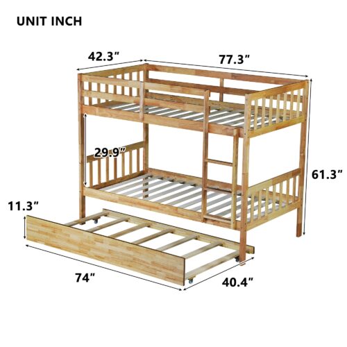 Twin Over Twin Rubber Wood Bunk Bed with Trundle, Convertible into 2 Twin Size Beds, Twin Size Bunk