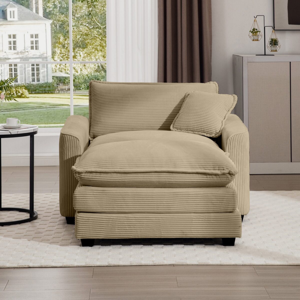 This accent chair and ottoman set blends modern elegance with retro charm, featuring a luxurious cloud-like pillow top design. Upholstered in soft, plush corduroy, it offers unmatched comfort with thick memory foam cushions and a cozy, ergonomic seat. The matching ottoman adds versatility, creating the perfect spot to relax, rest your feet, or use as additional seating. Available in a range of colors, this set is easy to assemble and a stylish addition to any living room, bedroom, or home office, offering both comfort and sophistication.