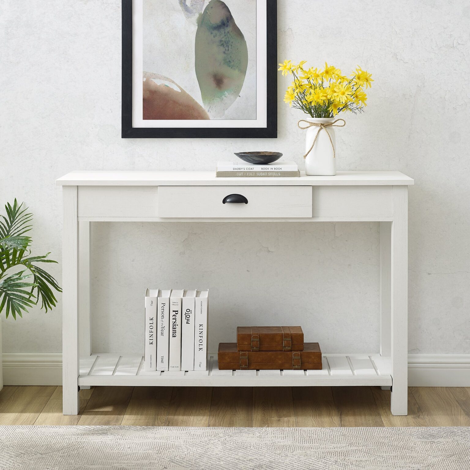 Make a statement in your living space with this 48-inch entry console table. Featuring a pull-out drawer for hidden storage, this table also includes a spacious slatted bottom shelf to display and store your favorite accessories, collectibles, and necessities. Durably constructed of warp-resistant MDF and finished in a variety of gorgeous colors, this piece will bring a rustic country charm to your home that you’ve been looking for.