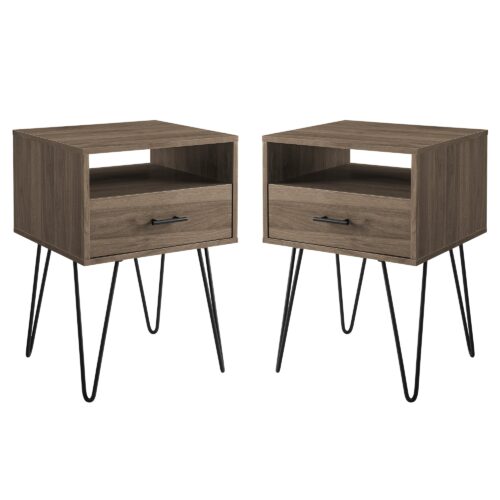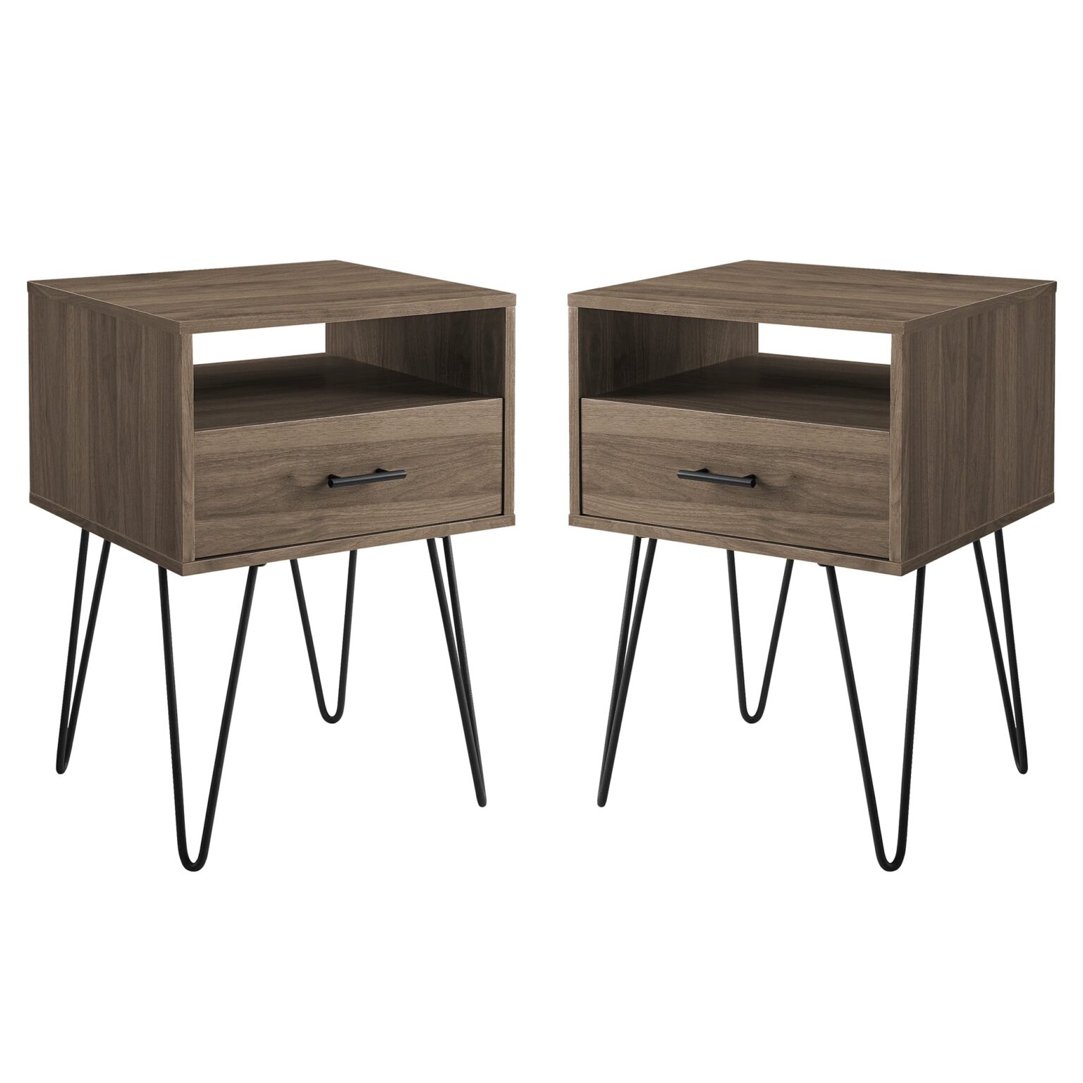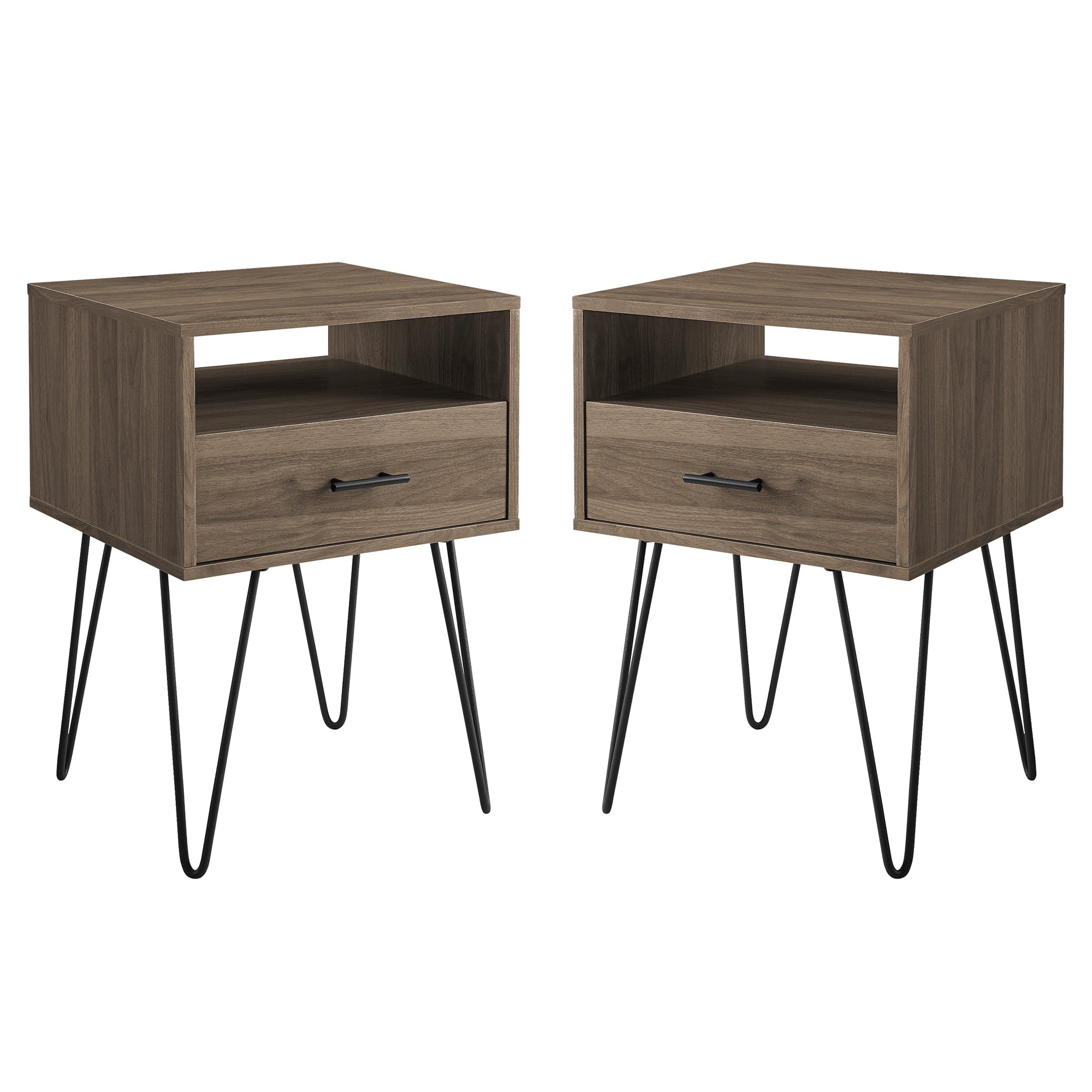 Hear the notes of old jazz echo through the house when you incorporate this set of two Mid-century modern end tables. The metal hairpin legs and box frame provide retro vibes for the living room. One drawer on easy-open metal telescoping glides offers a hidden spot to tuck clutter out of sight. Display a journal or keep track of remotes in the open cubby to personalize each piece to fit your needs. You can trust the warp-resistant MDF wood build and powder-coated steel frame to hold the items you like to keep close by.Â