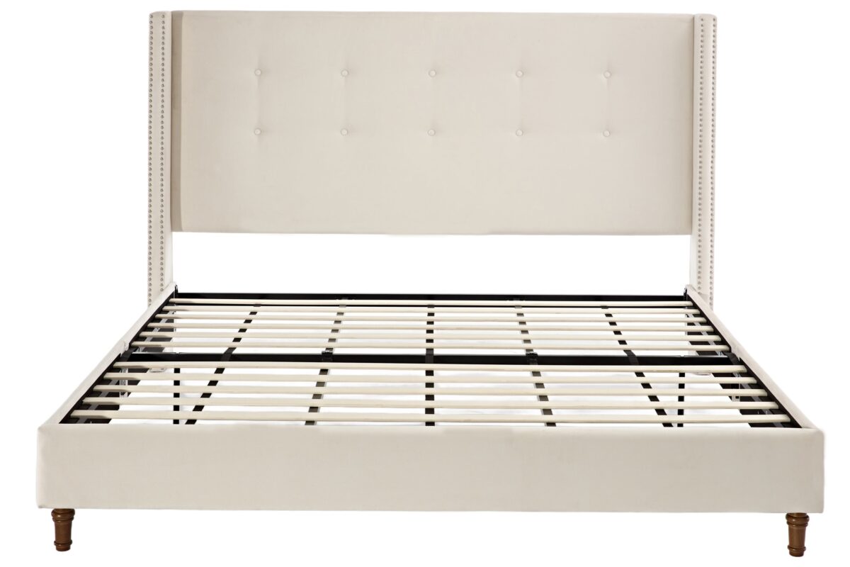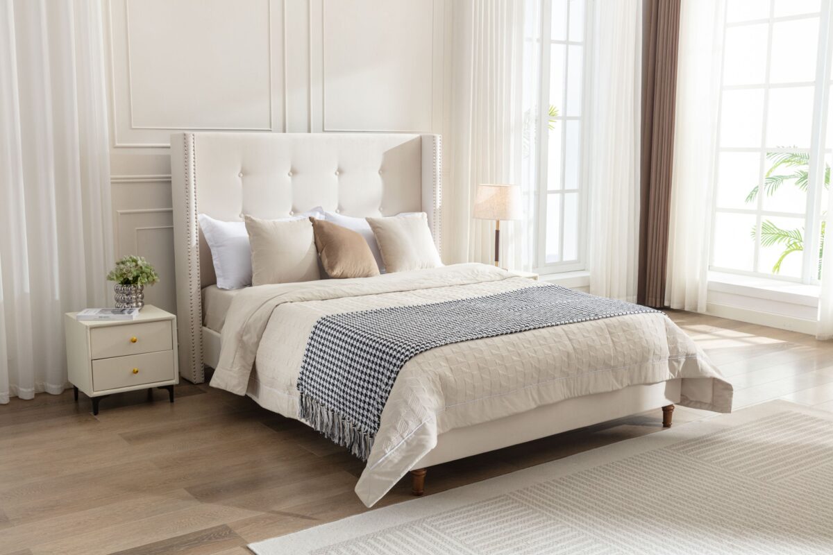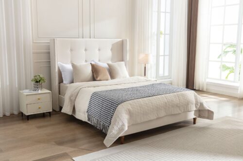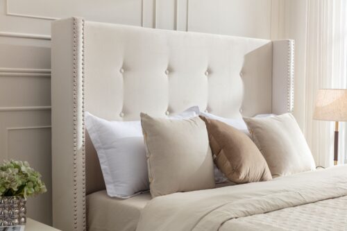 Its 54″ height creates a welcoming focal point for any bedroom, feels just as premium as it looks. Premium and beautiful velvet fabric – the perfect place to drift off and dream. Embrace gorgeous and elegant style, featuring a nail-head trim wingbacks and traditional hand buttoned tufting. As always, your comfort and support are high priorities at us, with a sturdy wooden-slats base and metal side rails frame. Boasts beautiful solid wood feet in walnut effect, for the perfect finish to its elegant and classical design.