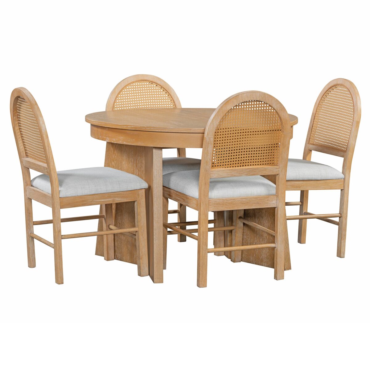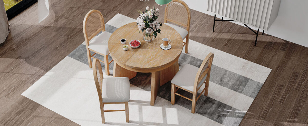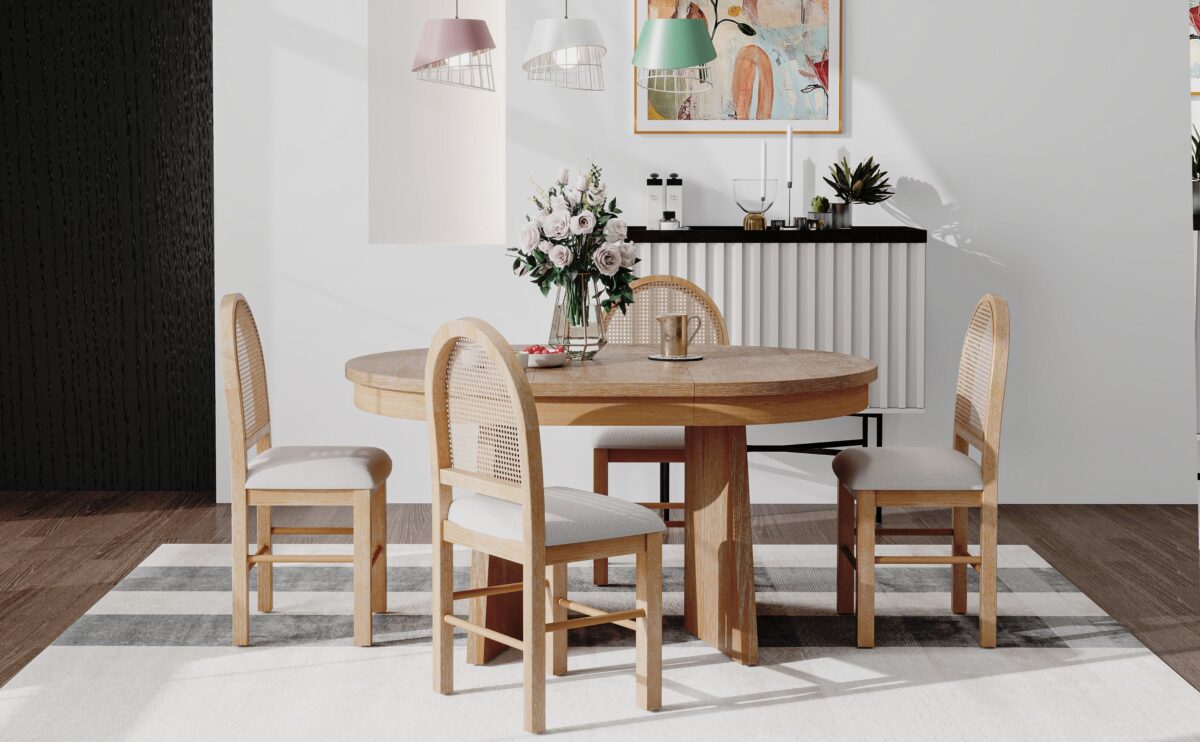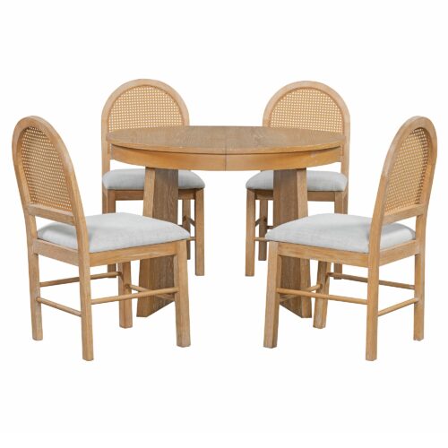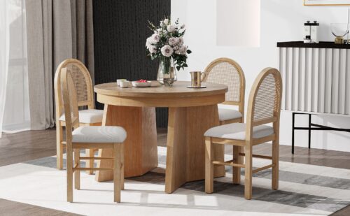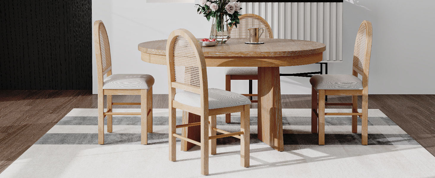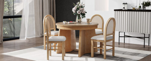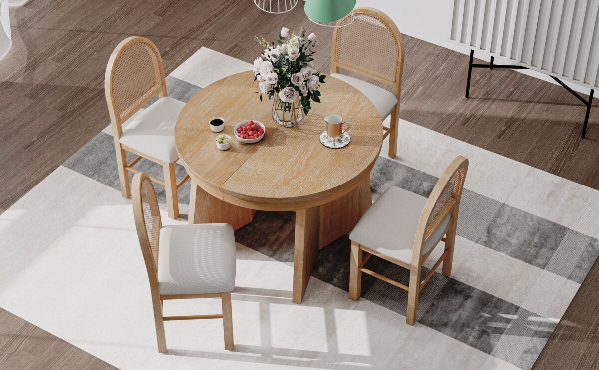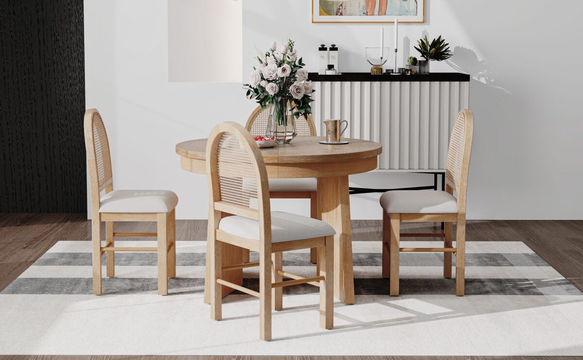 This 5-piece retro extendable dining table set exudes charm with its vintage-inspired design elements. The rattan backrests on the upholstered chairs further enhance the retro appeal, creating a cozy and inviting atmosphere for family meals or gatherings with friends. This round dining table for 4 adds a touch of retro romance to your restaurant, kitchen area, or dining room.Â