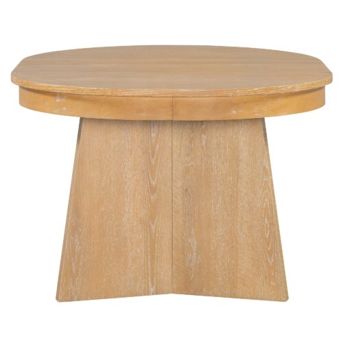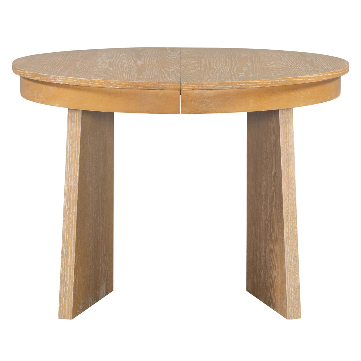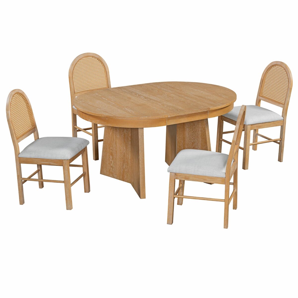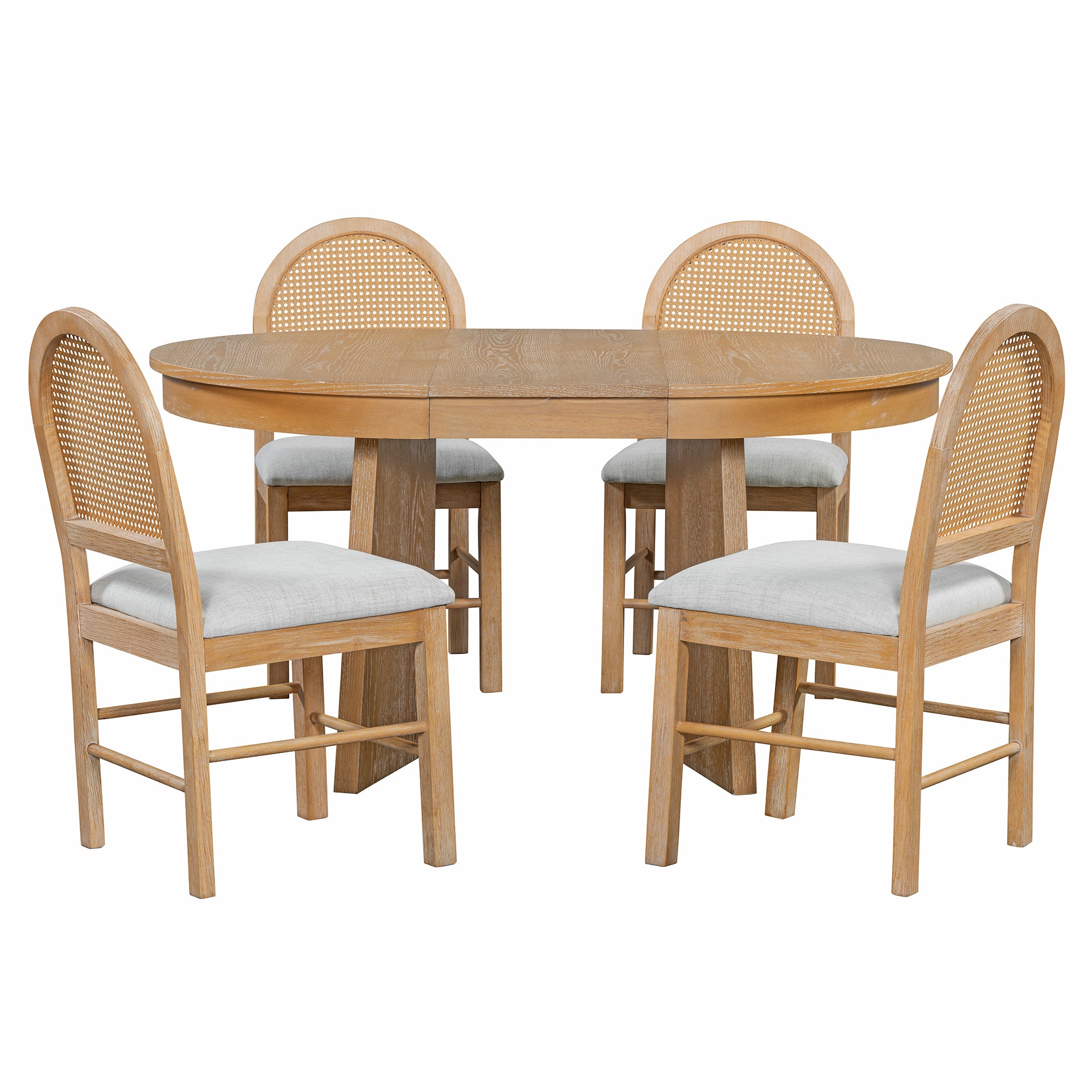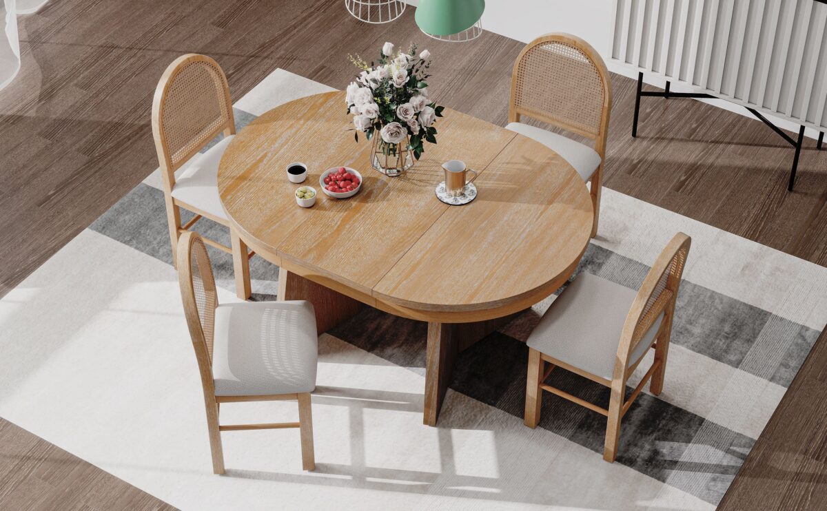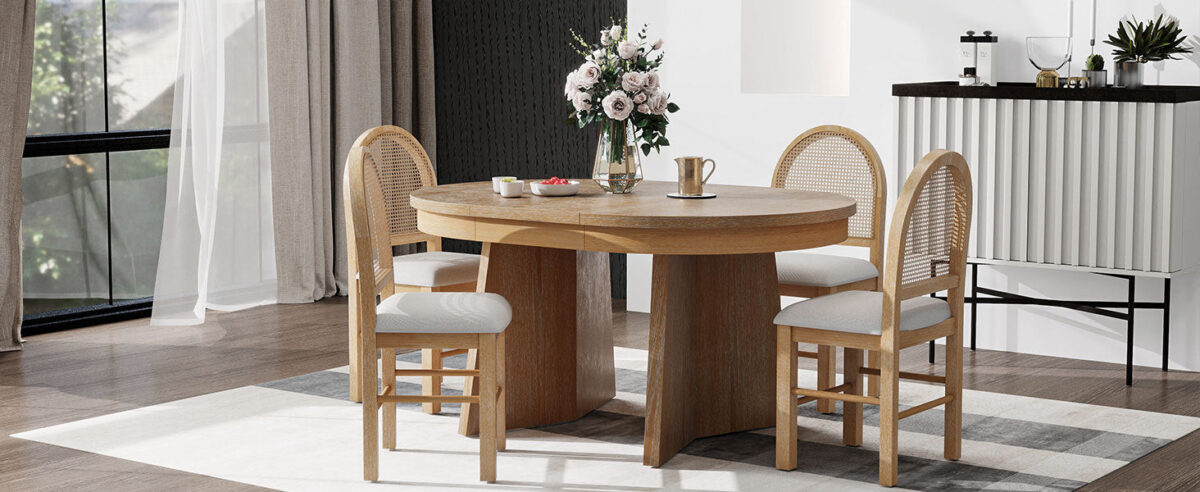 This 5-piece retro extendable dining table set exudes charm with its vintage-inspired design elements. The rattan backrests on the upholstered chairs further enhance the retro appeal, creating a cozy and inviting atmosphere for family meals or gatherings with friends. This round dining table for 4 adds a touch of retro romance to your restaurant, kitchen area, or dining room.Â