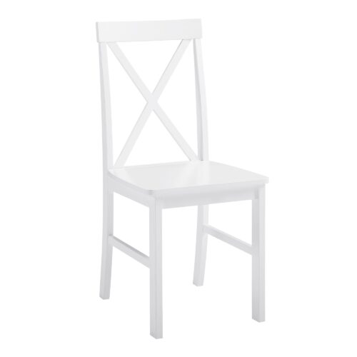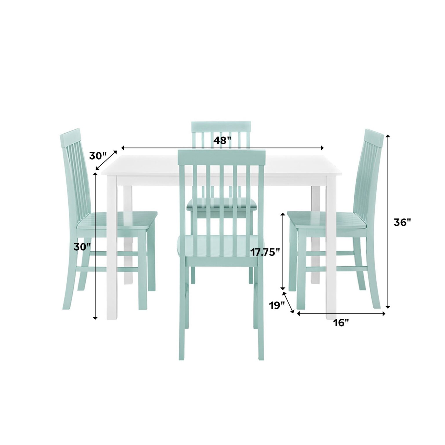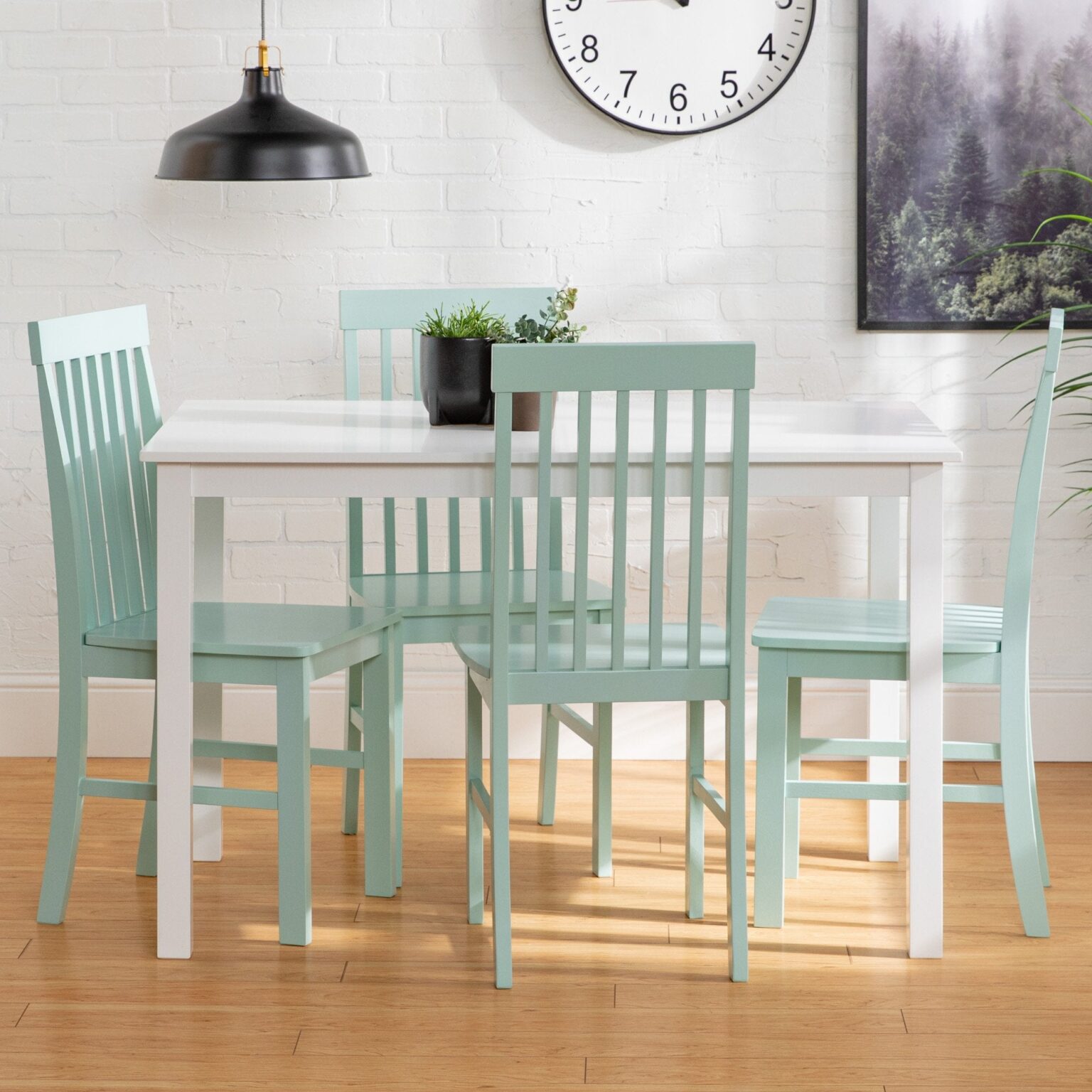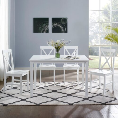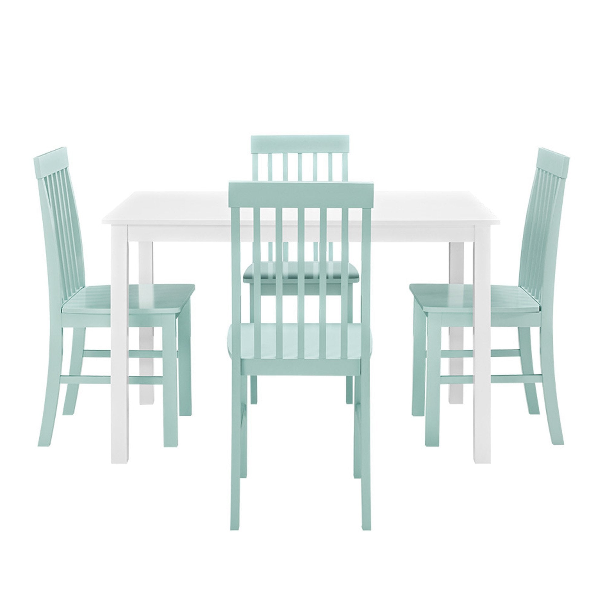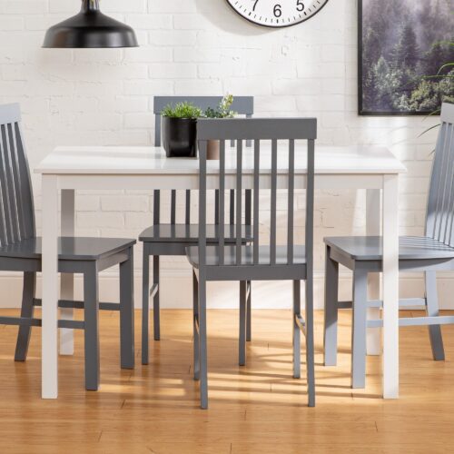 Take your kitchen or dining area to the next level with our modern style dining set. Including four slatted back chairs with slightly curved angles throughout, in a bright colored finish. The table features a classic, straight-line design with a painted, fresh white finish for a simple, yet elegant table. Enjoy meals with your family, with this stylish dining set. Â
