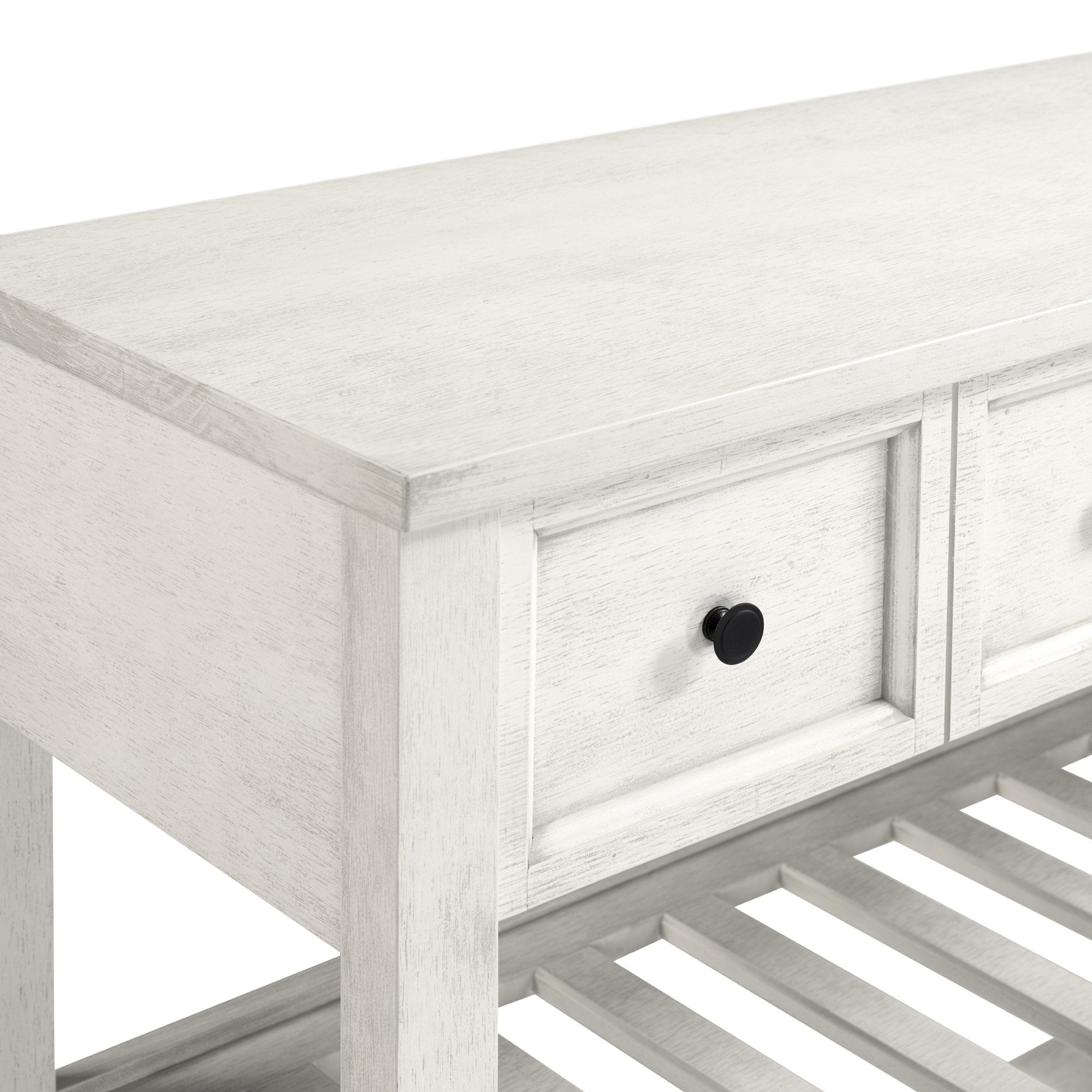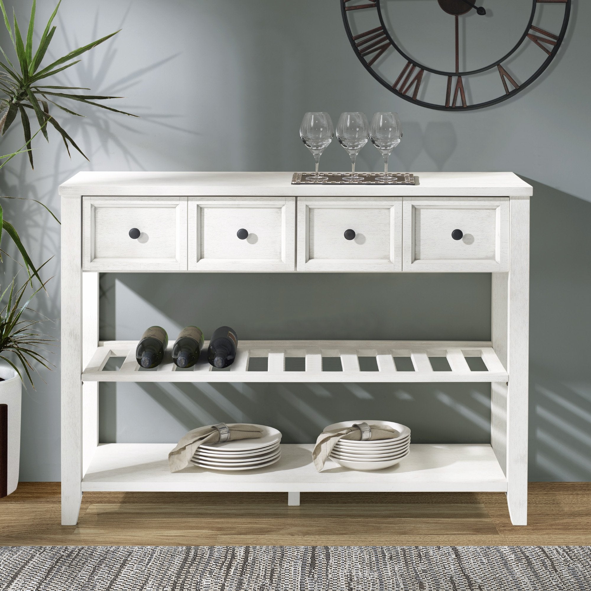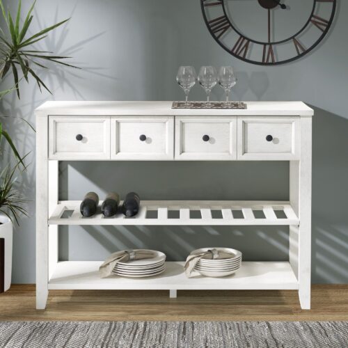 Rack up design points with this transitional style solid wood buffet bar. With an array of shelving options and two drawers that look like four, you can display or hideaway holiday dishes, cookbooks, or any other sort of item. The slotted middle shelf is ideal for storing wine bottles. This open and closed storage console also makes a great sofa table and will take your coastal, farmhouse, or transitional design a step beyond what you imagined was possible.