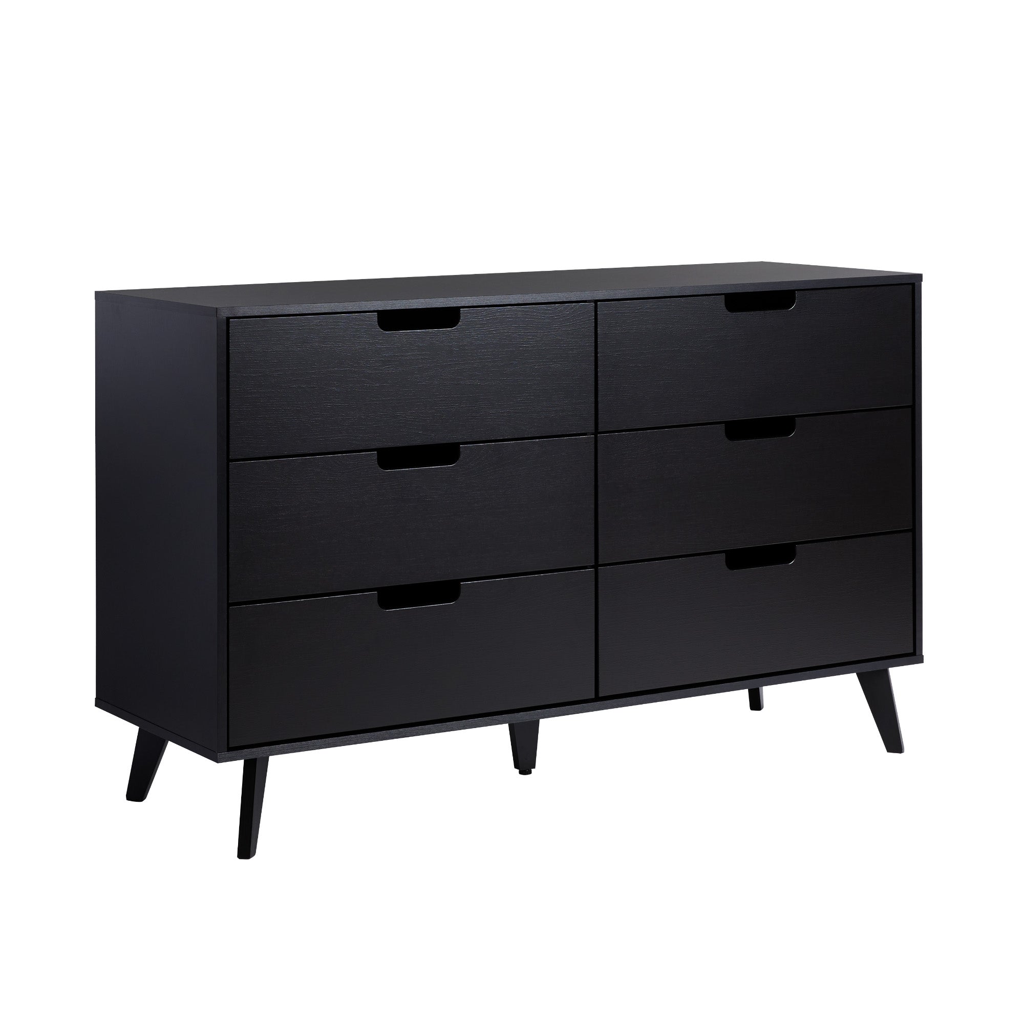 This collection is ideal for storing and organizing your wardrobe. Deep, roomy drawers offer plenty of space to house everything from socks and belts to jeans and T-shirts. Durable, metal drawer slides offer a smooth open and close, so you can always easily find what you’re looking for. The tapered and angled legs complement the streamlined style of the drawer fronts, while the cut-out handles make a unique and subtle statement that adds interest. The sleek black color pairs well with any bed or nightstand, making it a versatile piece that can go anywhere. Ultimately, all elements combine to create a classic collection that suits any space.
