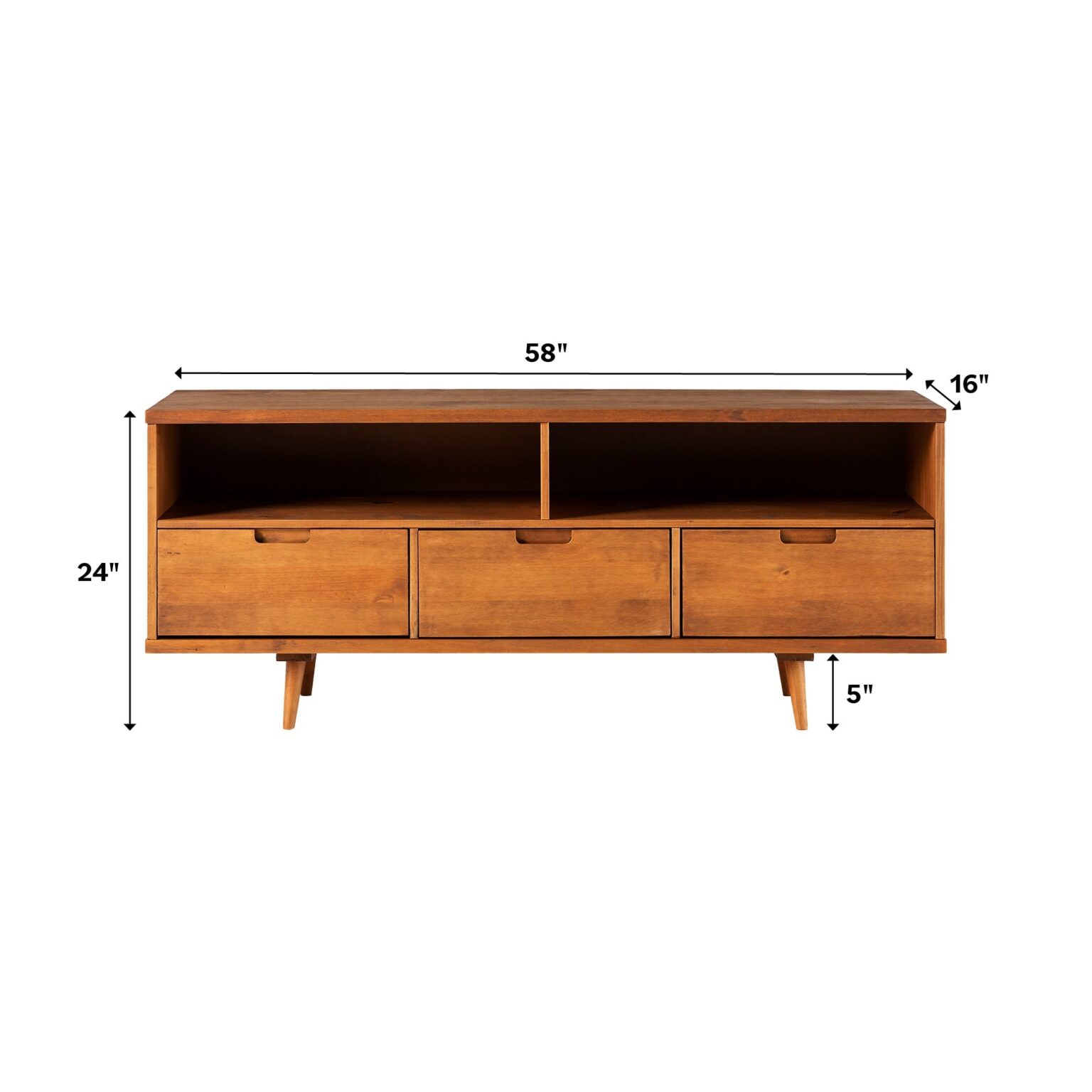 With slightly tapered legs, this 58-inch TV stand features a mid century modern silhouette to complement your home’s aesthetic. Crafted of solid pine wood to showcase a beautiful, natural grain stained finish for a warm texture to your living room. With three easy to access drawers featuring cutout handles, two open shelves above, and cord management to organize your electronics. This TV stand can also be incorporated in your bedroom as a storage cabinet or in your kitchen as a buffet due to its versatile design. Providing additional storage space in your home for the essentials you love most, from your favorite movies to your book collection and family photos. This entertainment center can fit up to a 64-inch TV.