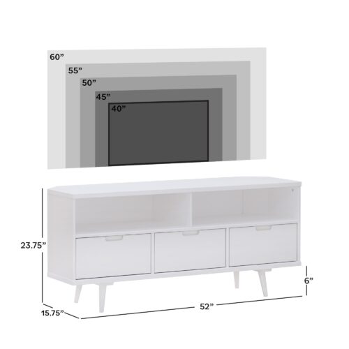 Accentuate your great taste for home décor with this bohemian-inspired TV stand. The tapered wood legs and natural grain finish provide a Mid-century modern feel to your living room or den. Tuck your vast movie collection within the three drawers with attractive cutout handles to get the organized feel you’ve been searching for. Place media components in the two open cubbies for the ultimate home theater experience.