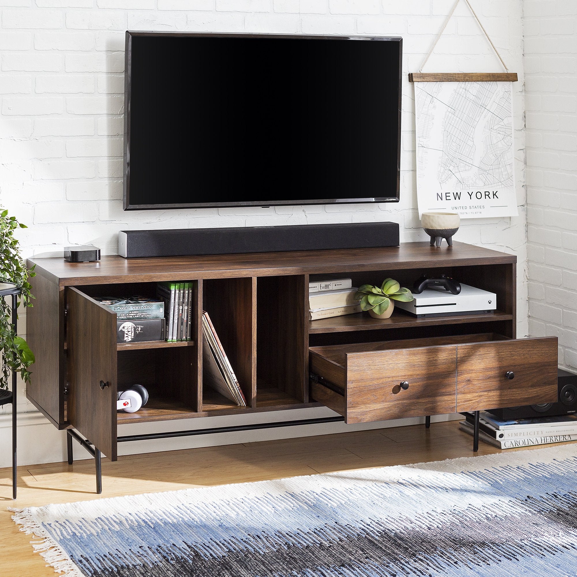 This fully finished vintage inspired media stand is a great place to store records, taller books, or other eclectic finds. There are two vertical cubbies along with one horizontal cubby that provide open storage options that each include cord management holes that allow you to set up gaming consoles, cable boxes, or other media how you’d like. One door with adjustable metal hinges, along with one drawer that looks like two, provides closed storage options. This TV console can accommodate TVs up to 70 inches.Â