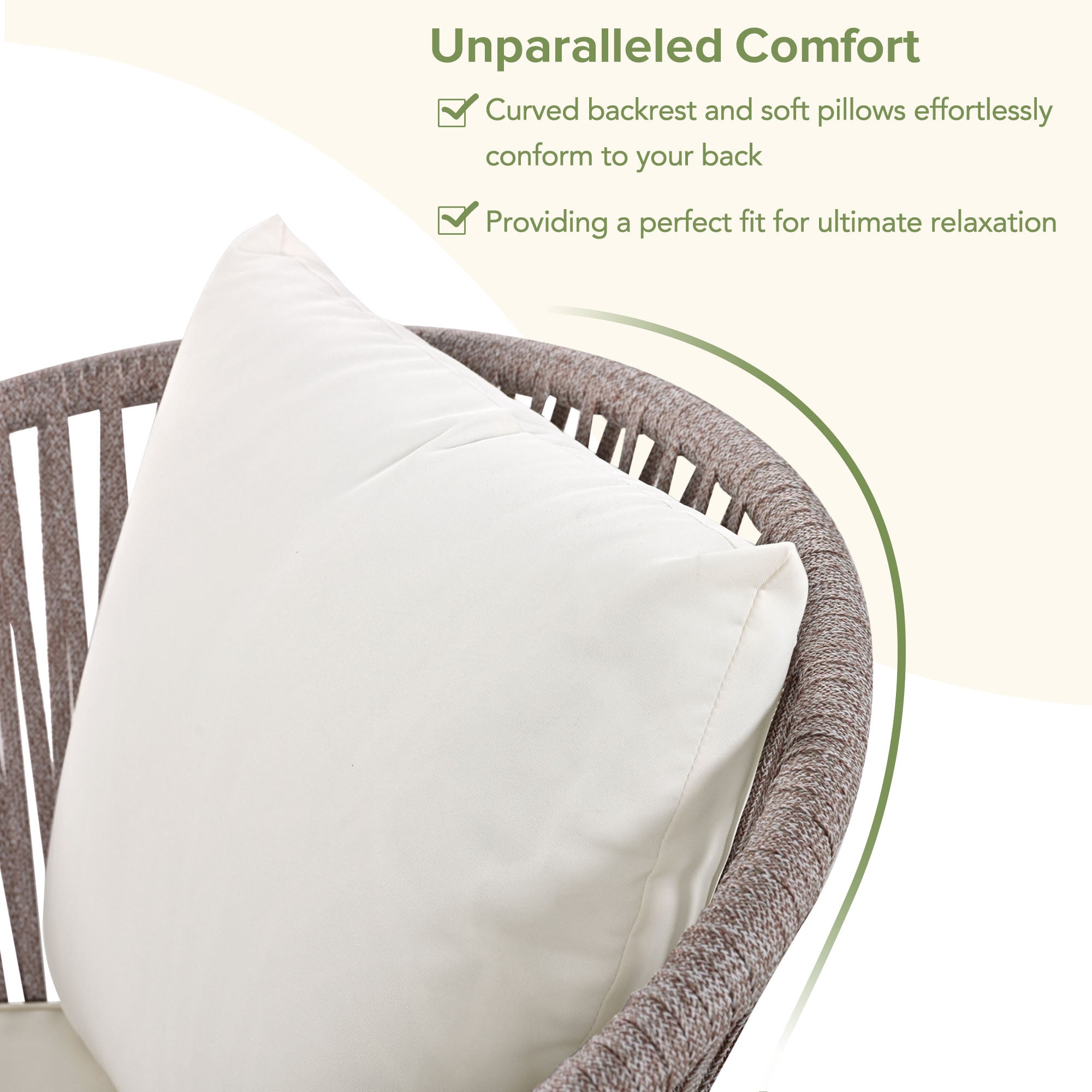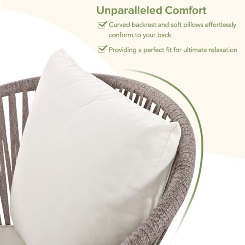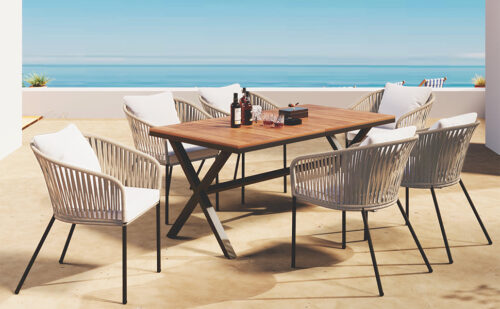 Introducing our meticulously crafted outdoor dining set, comprising a rectangular table and six chairs designed to elevate your dining experience. Crafted with a robust iron frame and acacia wood tabletop, the table exudes durability and sophistication. The ergonomic chairs boast a curved backrest for optimal comfort and support, complemented by plush seat cushions and back pillows for a luxurious seating experience. Equipped with adjustable feet, both the chairs and table ensure stability on any outdoor terrain, making them perfect for backyard barbecues or serene garden picnics. With its classic beige rope weaving, this set adds a contemporary flair to any outdoor space, seamlessly blending style and functionality for any setting.