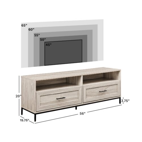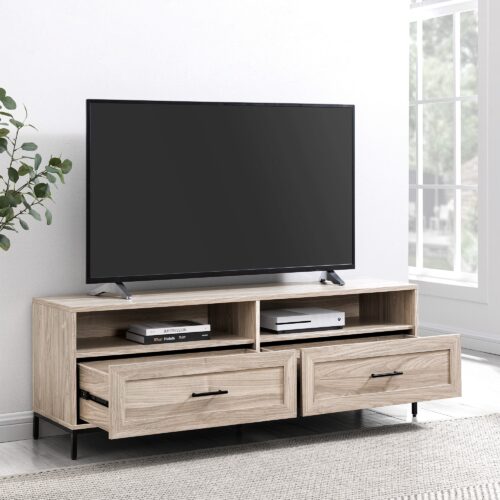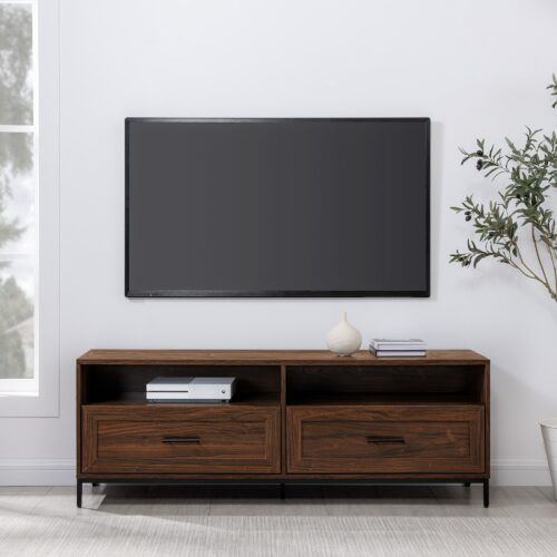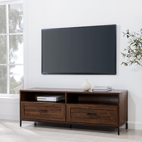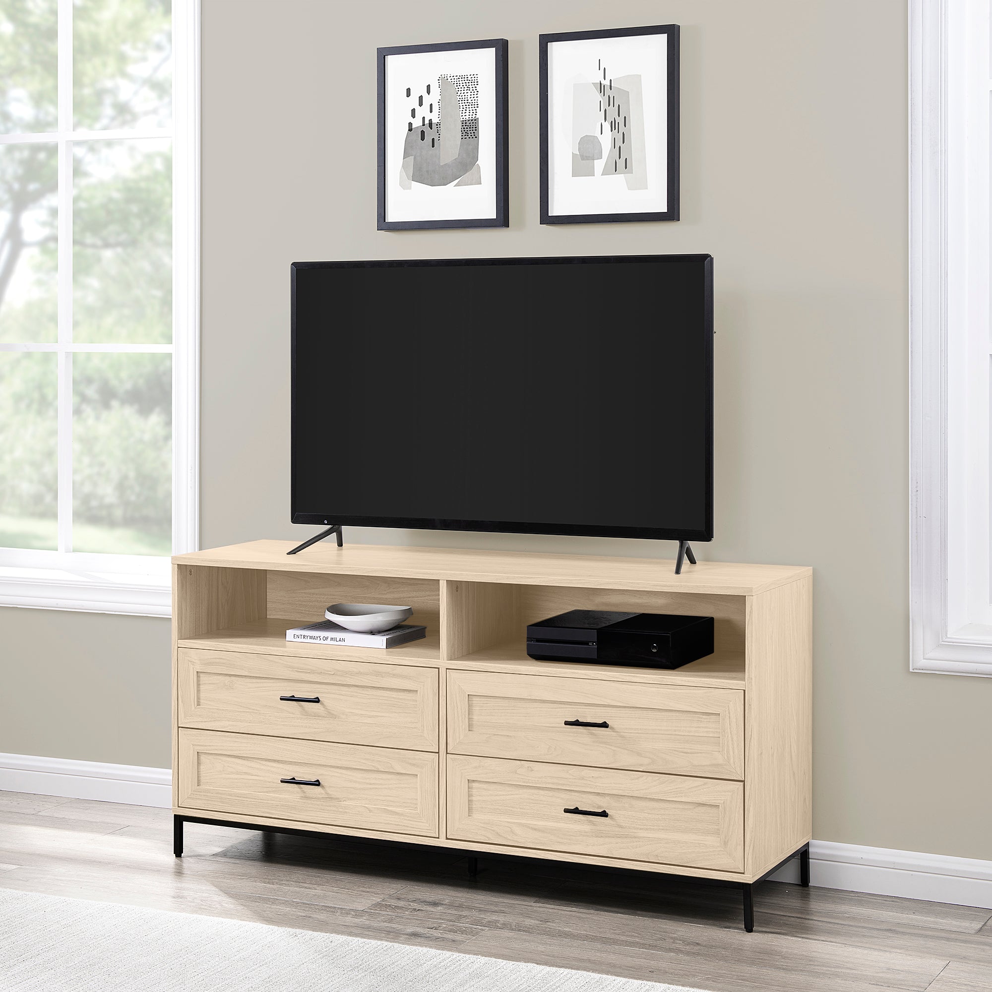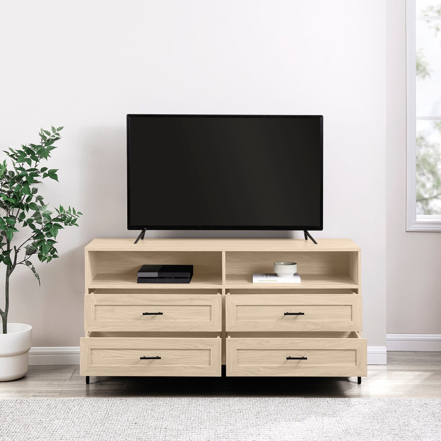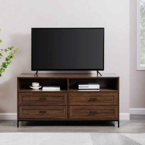 Movie nights have never felt more right than with your 60” TV sitting atop this modern console. Cozy up and enjoy your favorite flicks with the spacious surface of this stand, while you have enough room to store all of your media consoles within the two open cubbies and four drawers. Put your display-worthy décor on debut within the open cubbies, or use them to house your media and feed your cables through the cord management ports for an ultra-clean look. With a modern build, minimalist black hardware, and a classic silhouette fit for storage, this TV stand will help your living room will look as instantly refreshed as you’ll feel after a good series binge sesh.