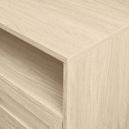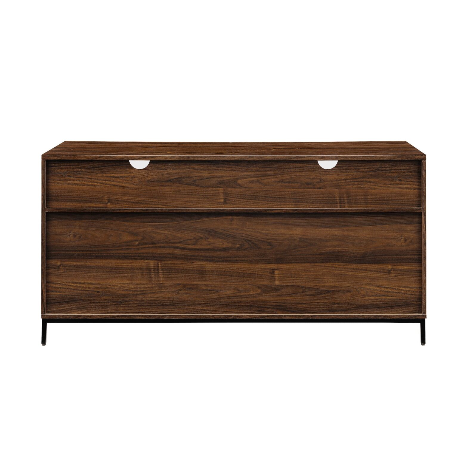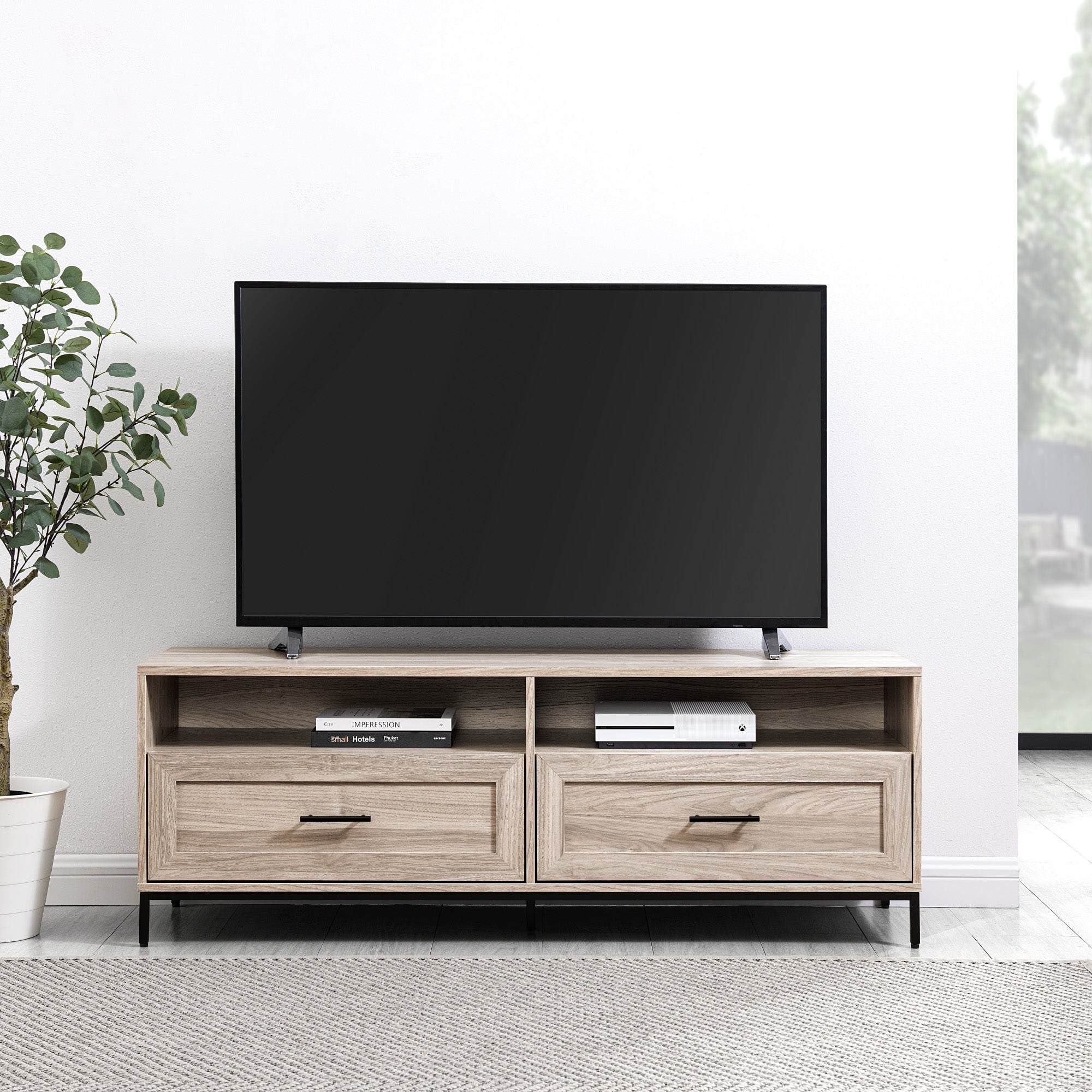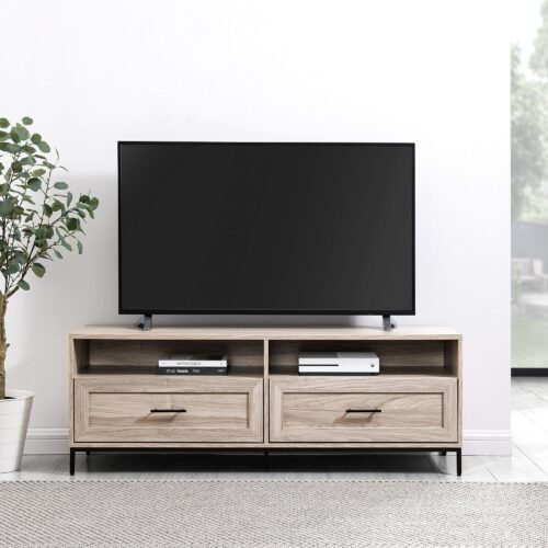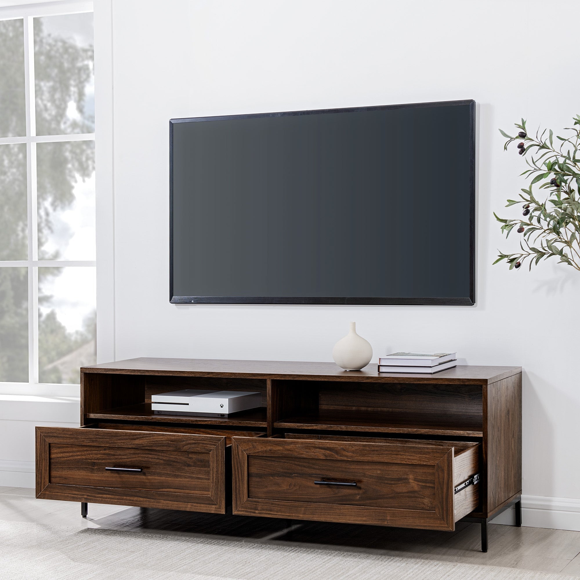 Movie nights have never felt more right than with your 60” TV sitting atop this modern console. Cozy up and enjoy your favorite flicks with the spacious surface of this stand, while you have enough room to store all of your media consoles within the two open cubbies and four drawers. Put your display-worthy décor on debut within the open cubbies, or use them to house your media and feed your cables through the cord management ports for an ultra-clean look. With a modern build, minimalist black hardware, and a classic silhouette fit for storage, this TV stand will help your living room will look as instantly refreshed as you’ll feel after a good series binge sesh.