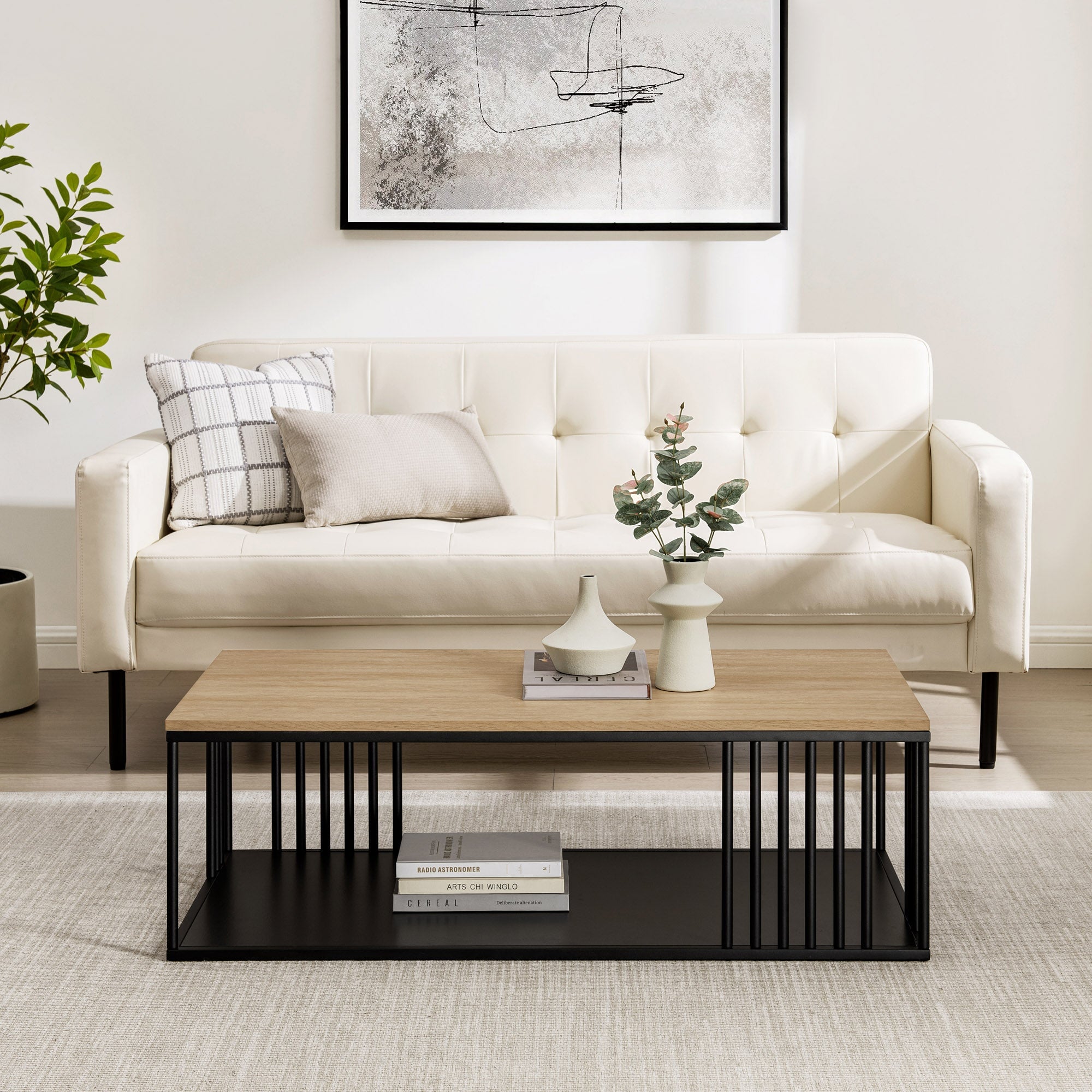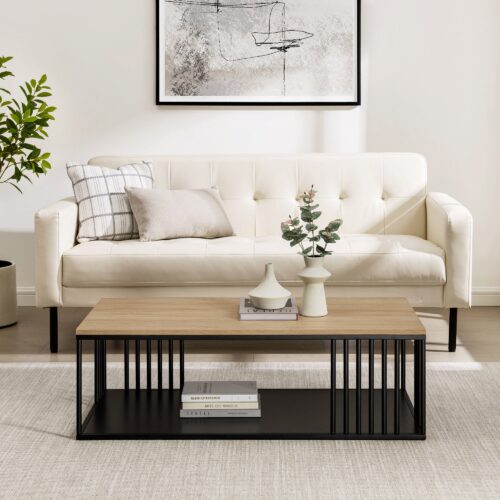The sleekest couchside companion, this contemporary coffee table will lend your place an effortless upgrade with its mixed material design and metal details. The vertical metal slats add just the right amount of ultra-modernity to the piece, while a stunning, durable laminate finish over MDF wood offers a unique tabletop. With an easy assembly, lightweight build, and weight capacity of 150 pounds, this coffee table is just what you’ve been looking for, whether it’s for your apartment or forever home.