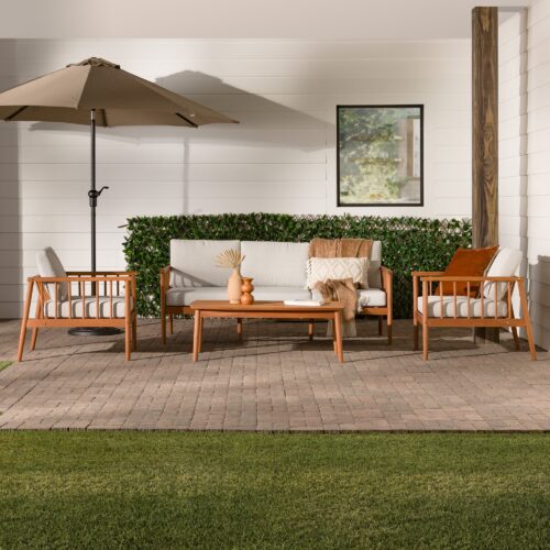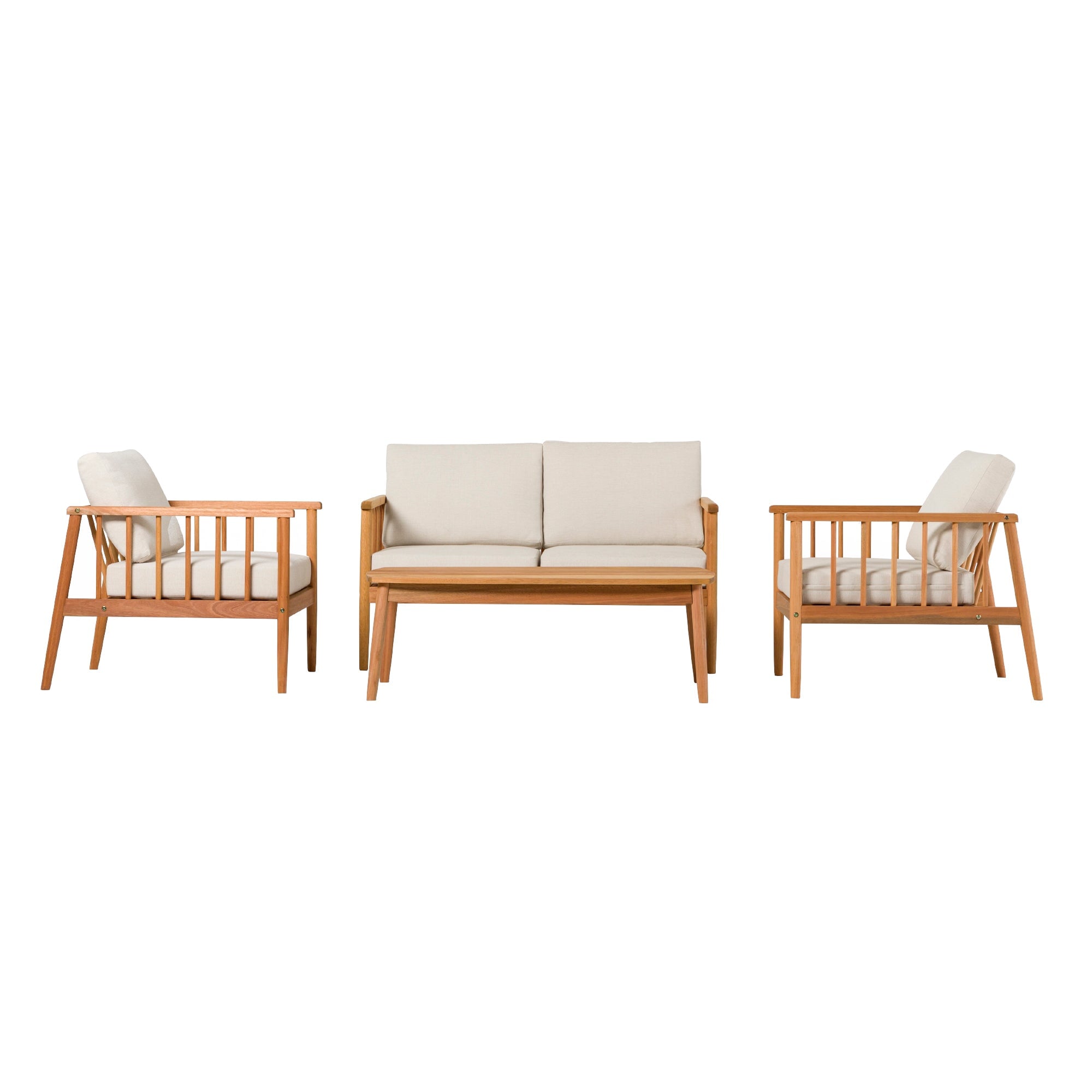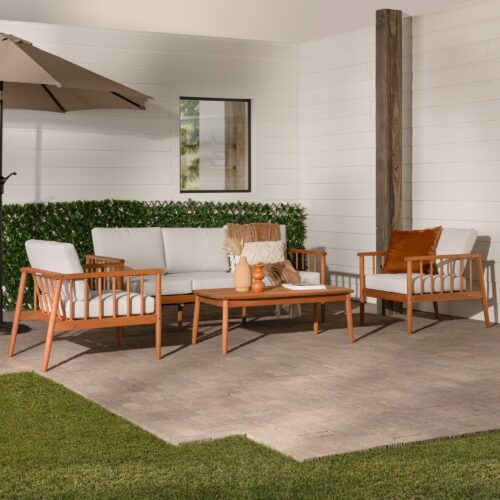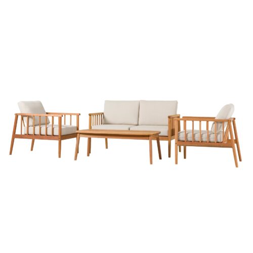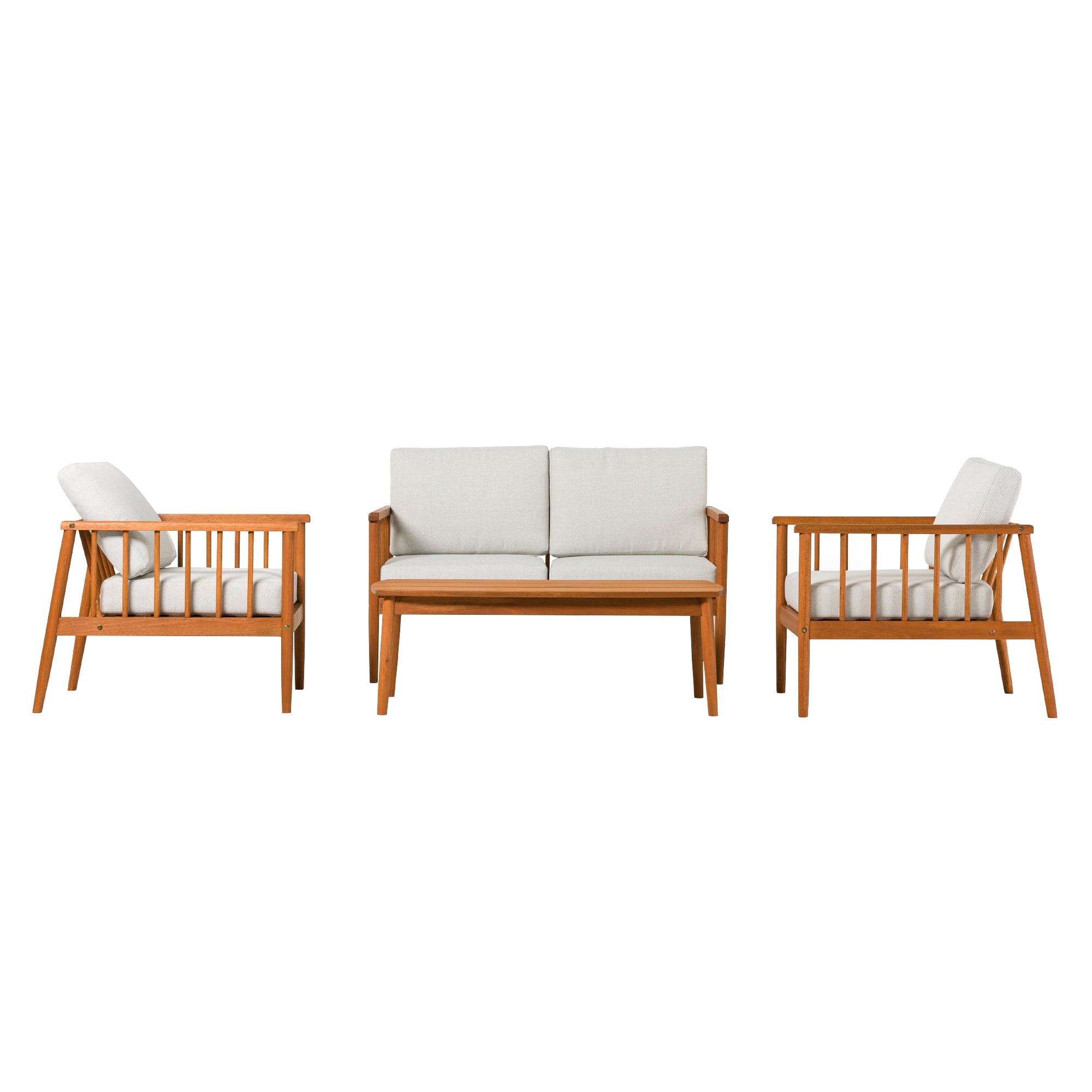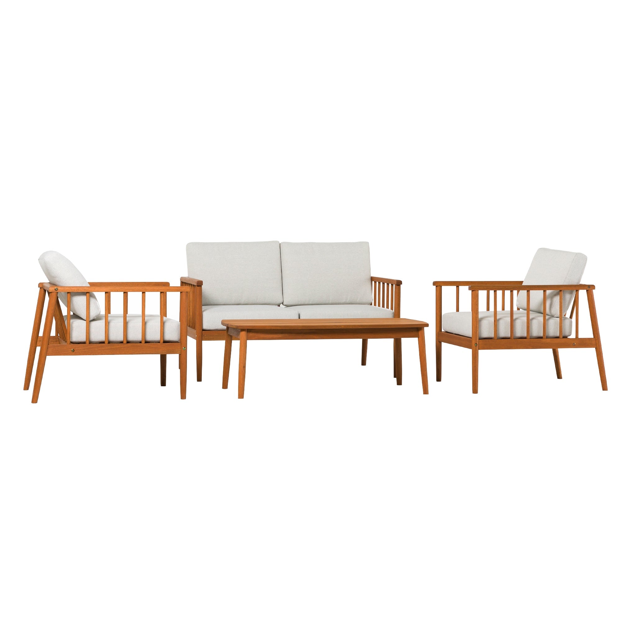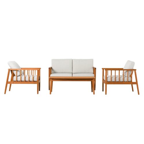 Lay back, lounge, and look forward to total backyard bliss with this patio set on display and ready to accommodate. Low-key comfort and high-key style effortlessly unite with this matching set’s spindle sides and plush cushions. Configure the loveseat and accent chairs however you like to host summer soirees or intimate get-togethers with friends and family—with enough room for everyone! The perfect surface for smore’s assembly, game night, or seasonal cocktails, the included solid wood coffee table is the cherry on top of this essential entertainment hub. Mindfully crafted with solid eucalyptus wood, this set of four is sustainable, stylish, and moisture resistant.