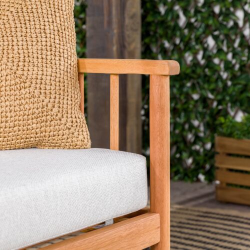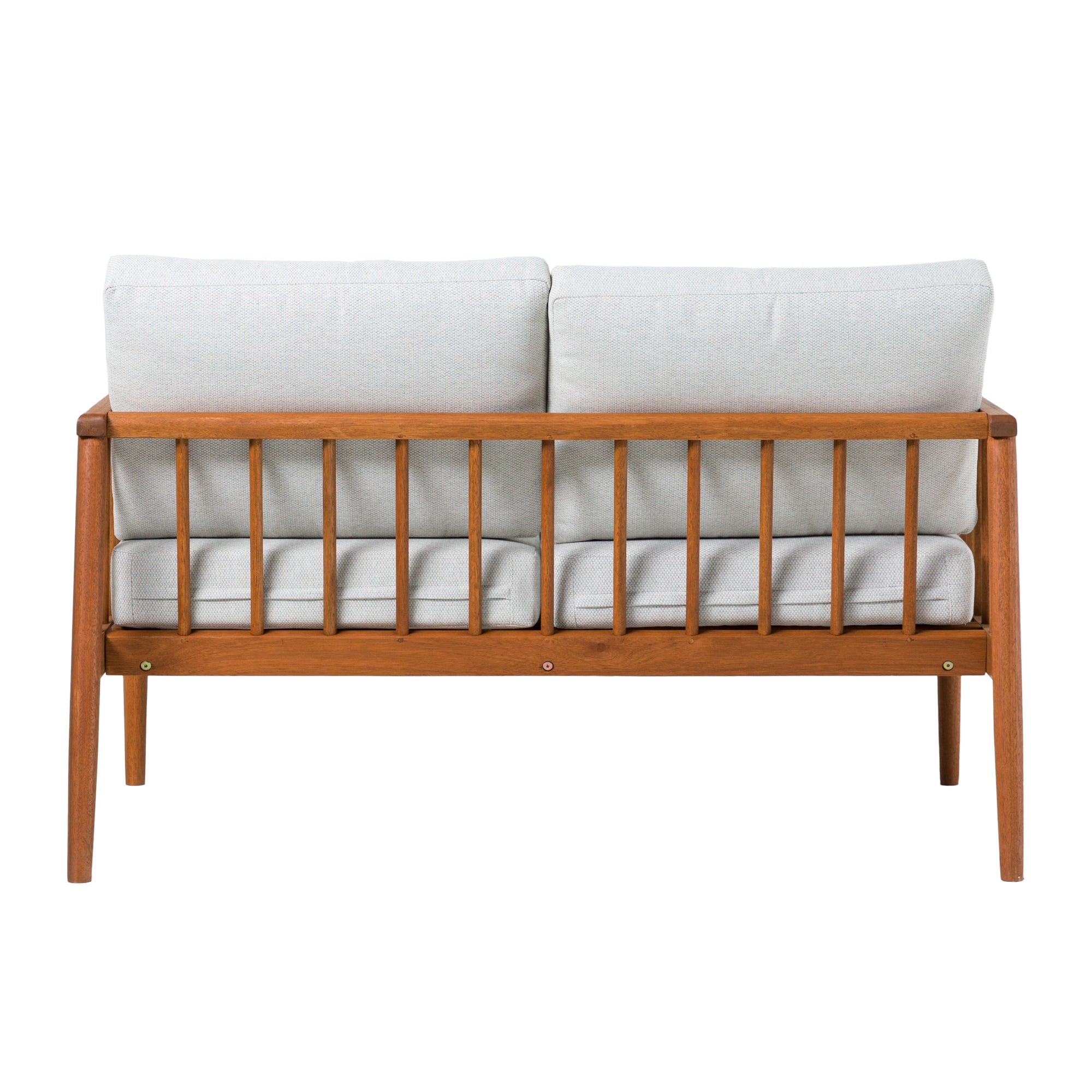 Lay back, lounge, and look forward to total backyard bliss with this patio loveseat on display. Low-key comfort and high-key style effortlessly unite with this seat’s spindle wood detail and plush cushions. Whether it’s on your patio, near the pool, or out on your apartment balcony, rest and relaxation come easy with this chair’s easy-to-clean, rot-resistant, and ultra-long-wearing build. Mindfully crafted with solid eucalyptus wood, this seat is as sustainable as it is stylish. Pair this triple lounge with the matching accent chairs and coffee table to make this loveseat even more inviting.