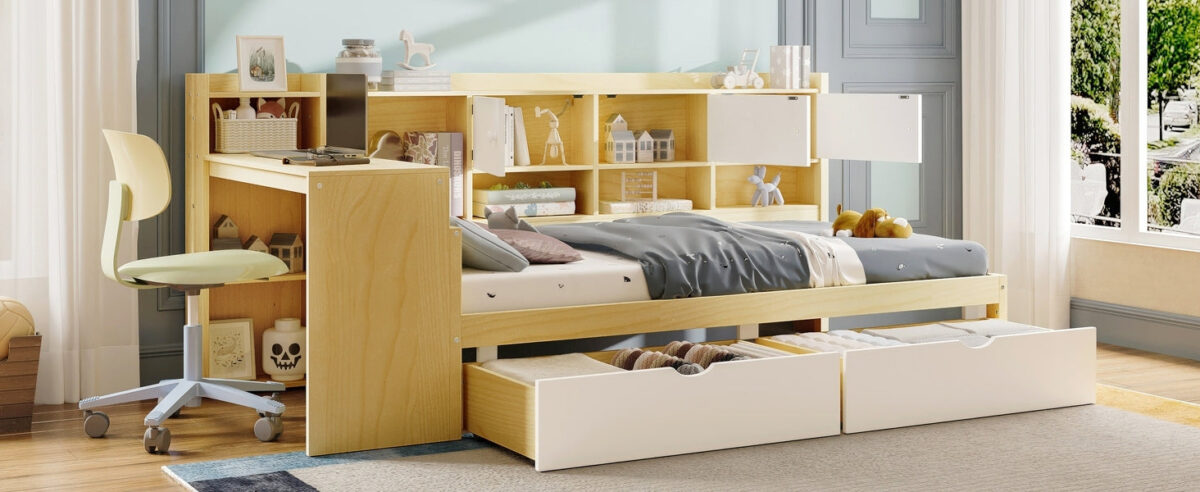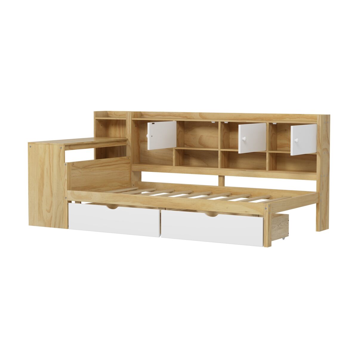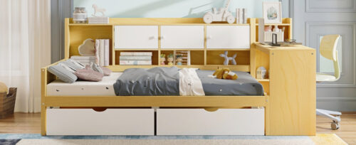 Maximize your space with this L-Shape Wooden Daybed, designed for both style and functionality. Featuring seven spacious storage cabinets along the side, two large drawers beneath the bed, and a built-in study desk with an integrated bookshelf, this multi-purpose bed offers the perfect blend of comfort and organization. Crafted from high-quality wood, the sturdy frame ensures durability and long-lasting use, while the sleek design seamlessly fits into any bedroom or studio layout. Whether you need extra storage, a dedicated study area, or a cozy sleeping space, this daybed has it all.