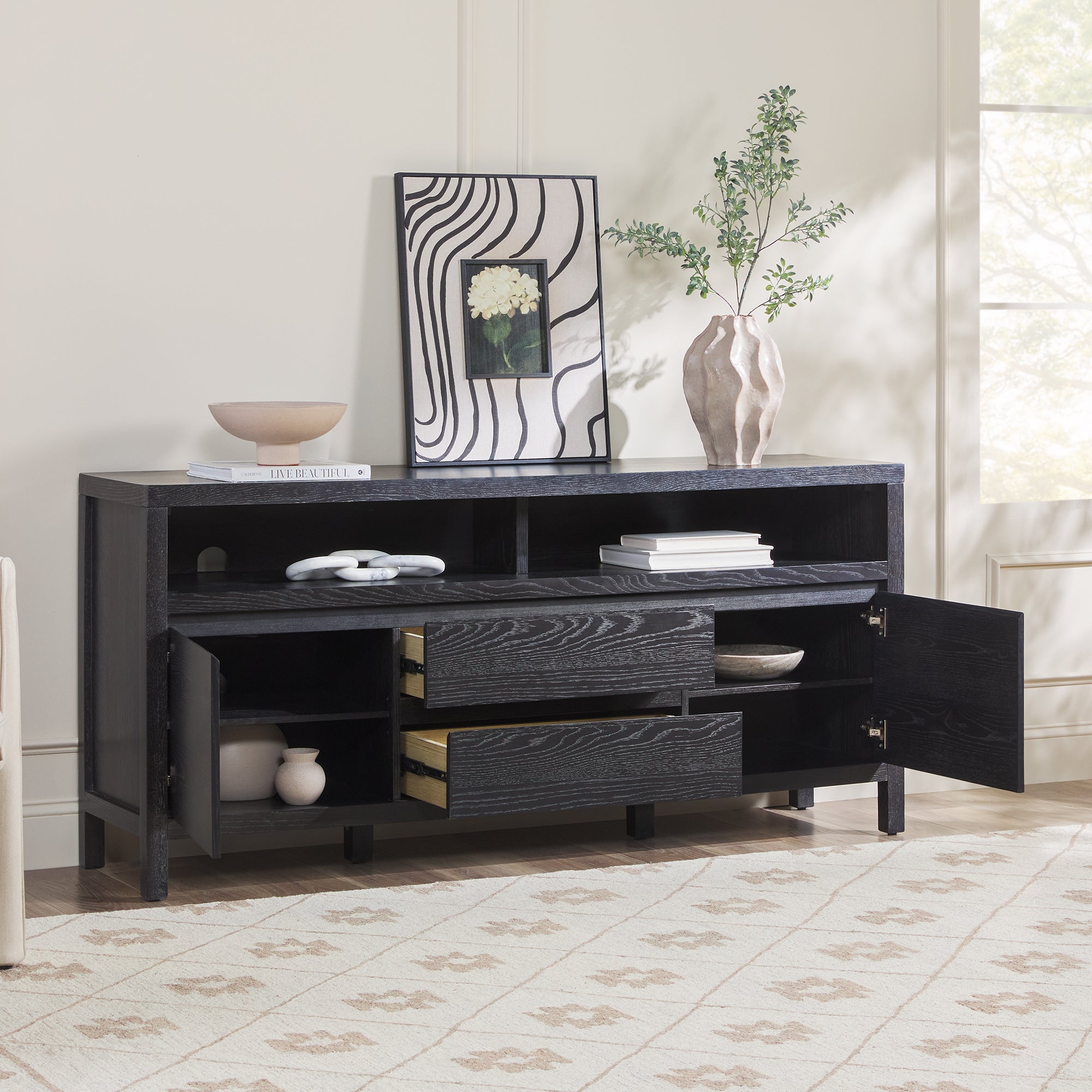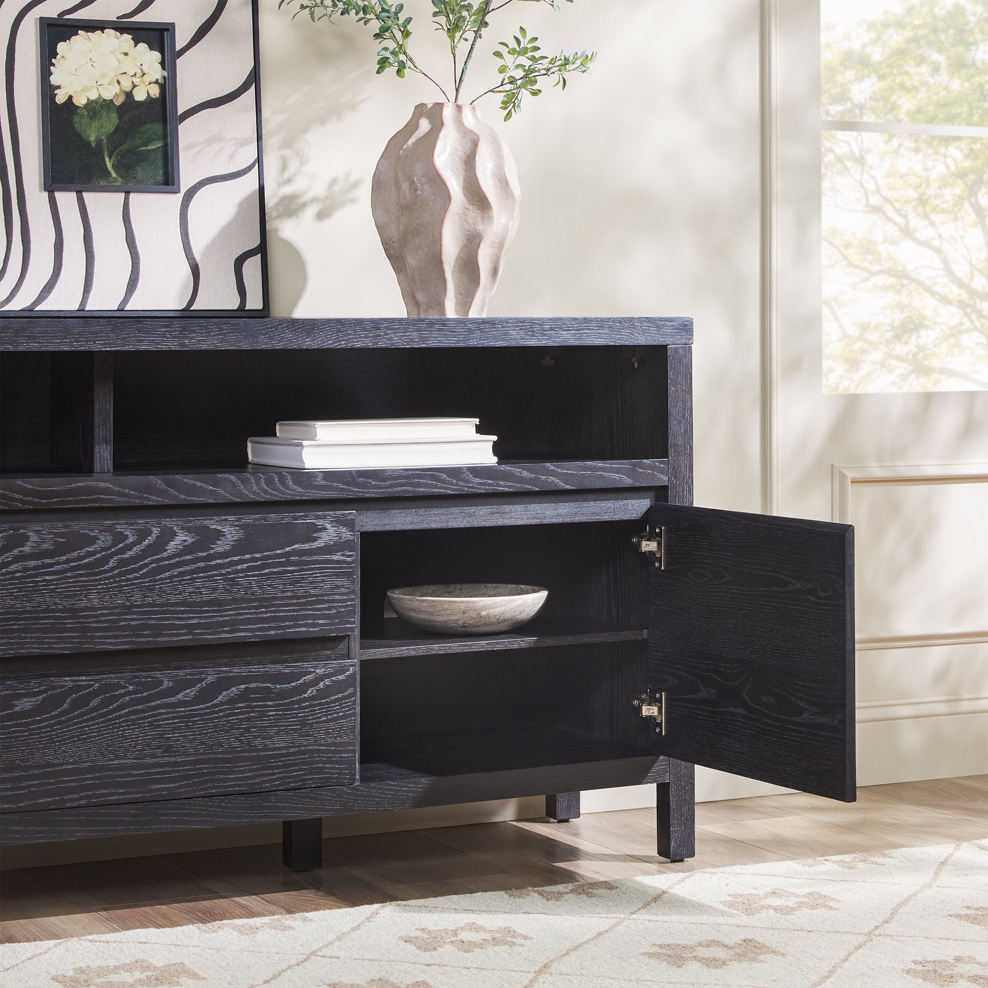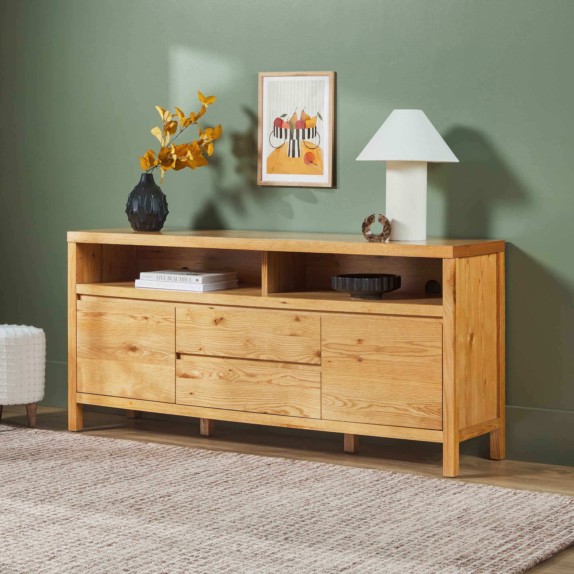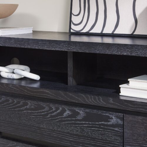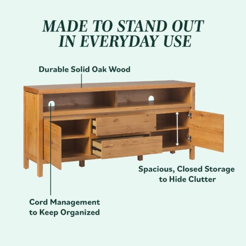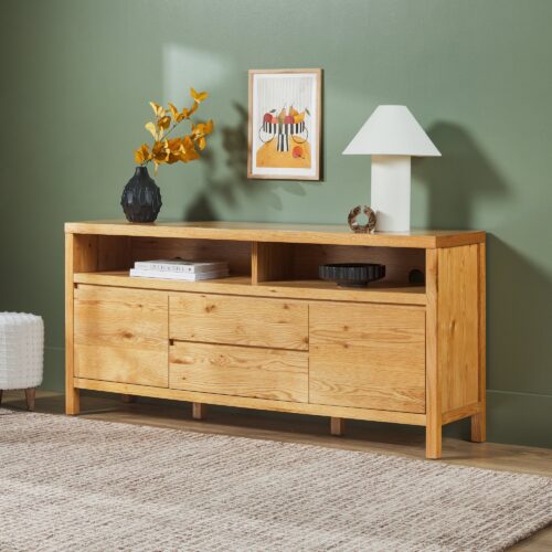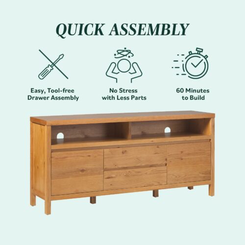 This modern farmhouse sideboard and tv stand blends rustic charm with everyday function. An open shelf offers easy access to décor and essentials, while the durable white oak veneer top adds warmth with its natural wood grain. Perfect for dining rooms, living spaces, or entryways, it’s a stylish and practical addition. With two doors, adjustable shelves, and smooth-glide drawers, storage is both versatile and organized. Built-in cable management keeps cords out of sight for a clean setup. Designed for quick assembly, it’s ready to use in 60 minutes or less.