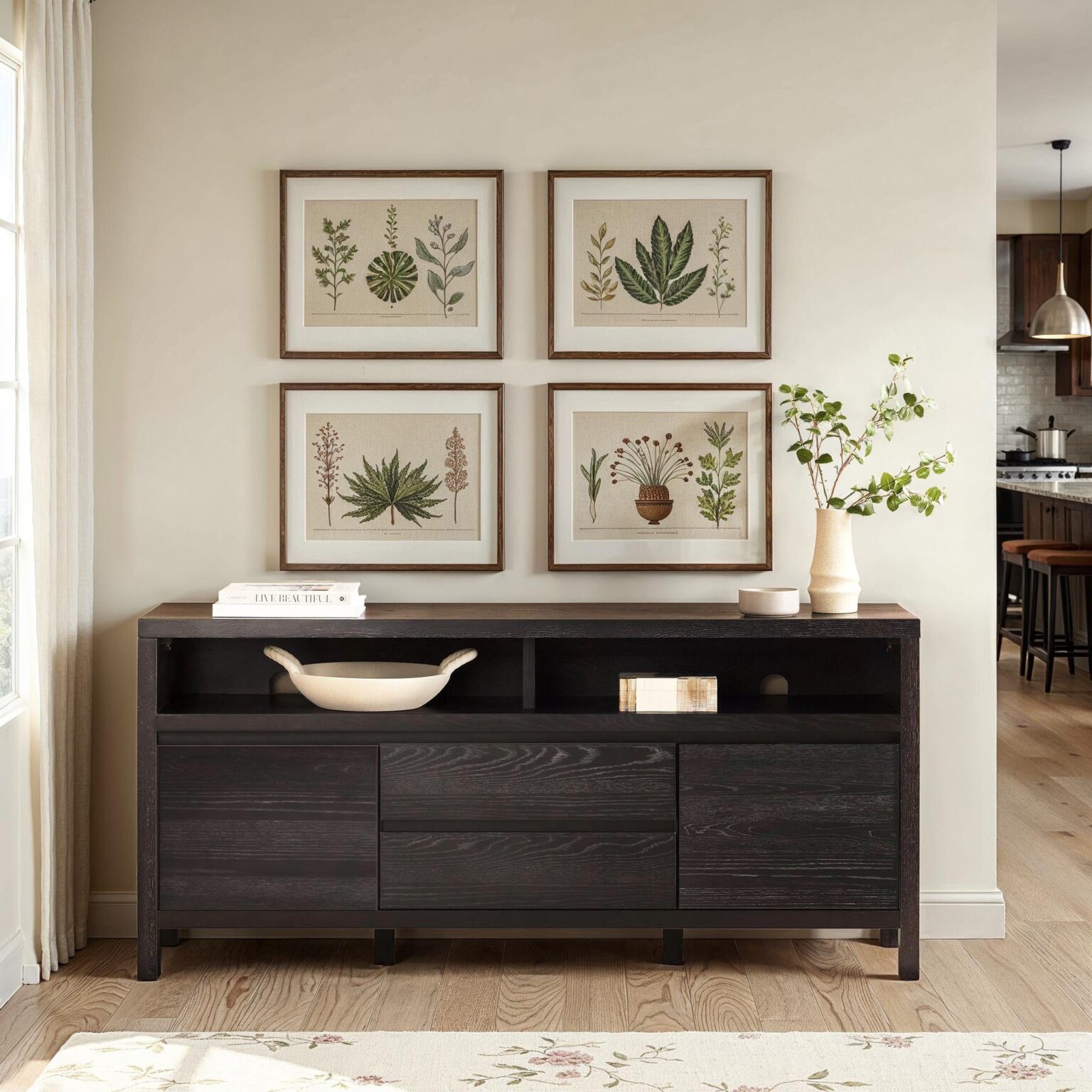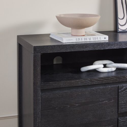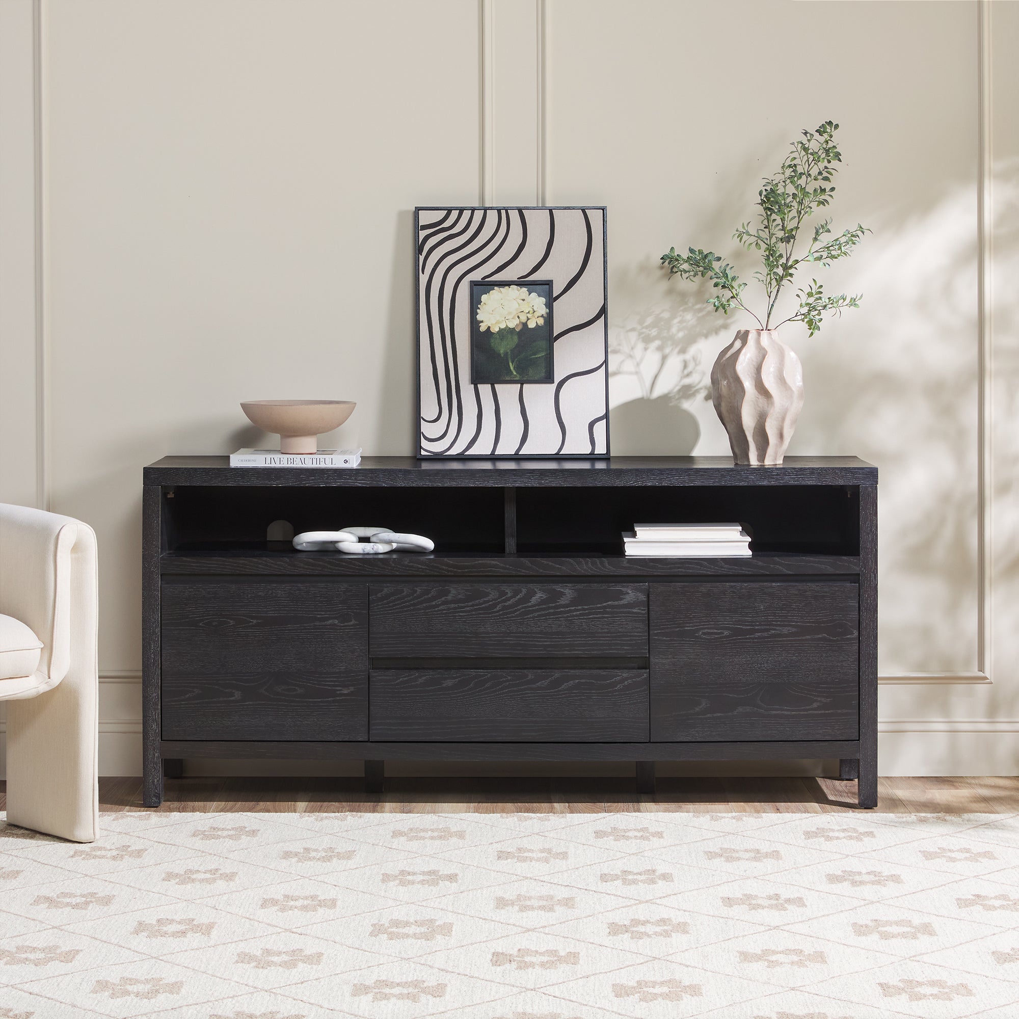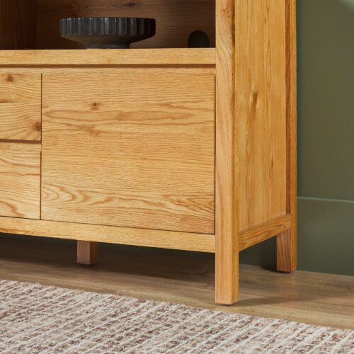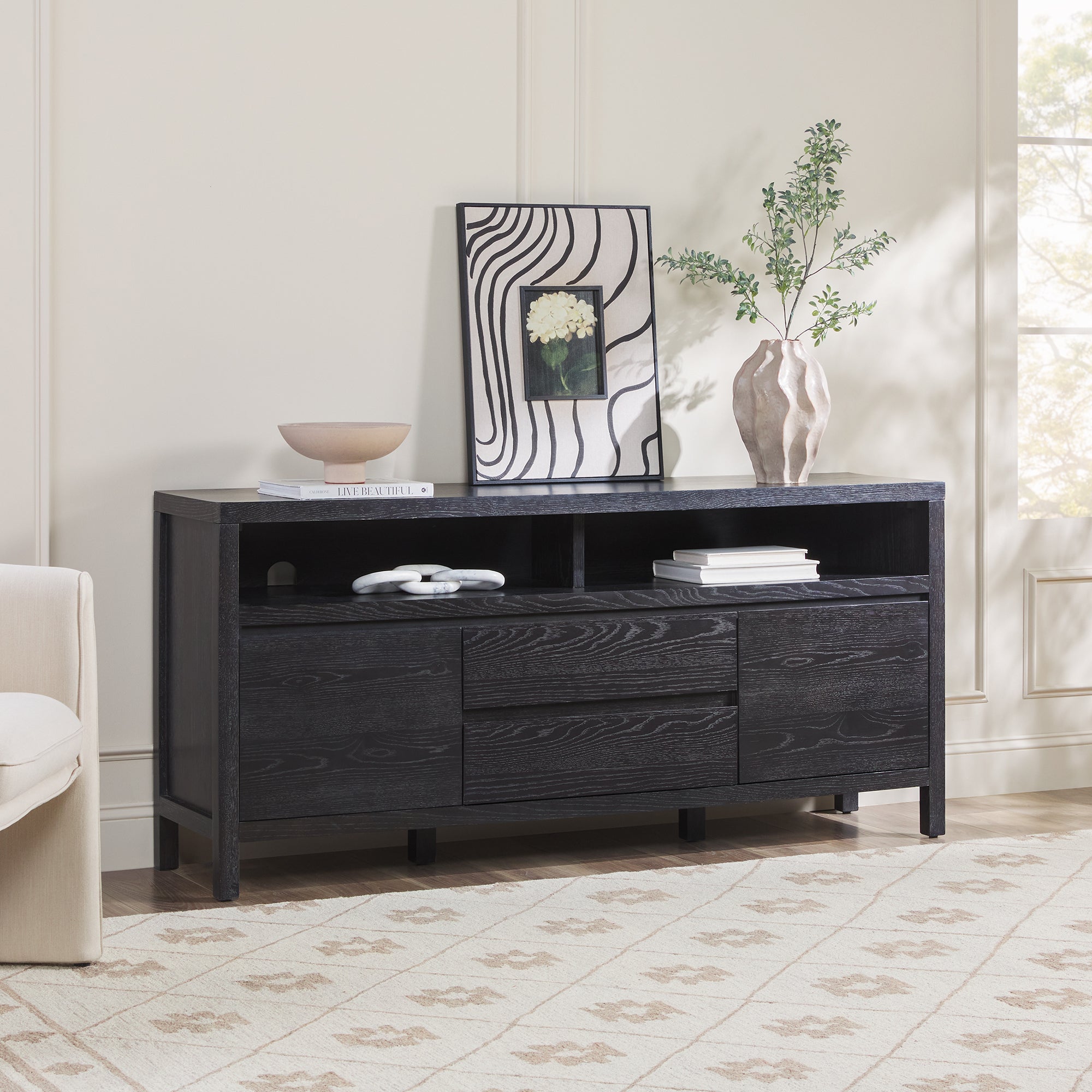 This modern farmhouse sideboard and tv stand blends rustic charm with everyday function. An open shelf offers easy access to décor and essentials, while the durable white oak veneer top adds warmth with its natural wood grain. Perfect for dining rooms, living spaces, or entryways, it’s a stylish and practical addition. With two doors, adjustable shelves, and smooth-glide drawers, storage is both versatile and organized. Built-in cable management keeps cords out of sight for a clean setup. Designed for quick assembly, it’s ready to use in 60 minutes or less.