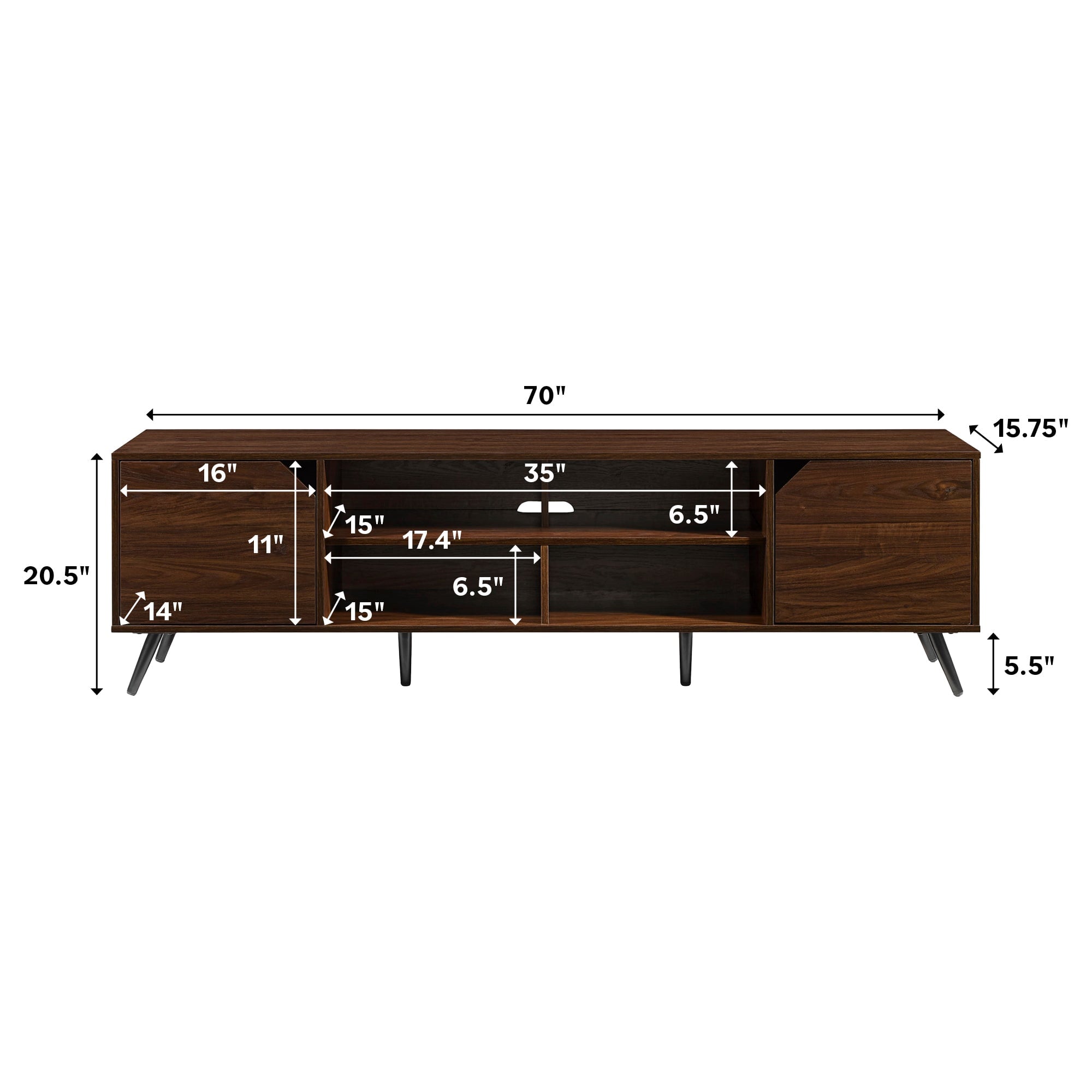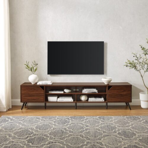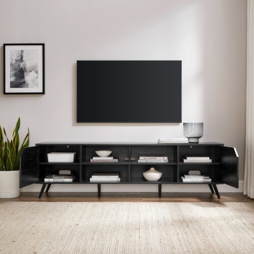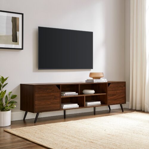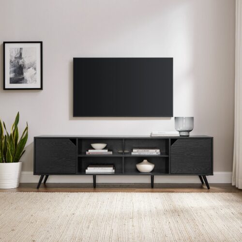 Sleek, storage savvy, and ready to stream from every cubby, this contemporary TV stand has got you and your favorite tech covered. Four divided cubbies lend you all the storage you’ll need for streaming boxes, gaming consoles, and movie night must-haves. Two adjustable shelves behind the soft-close doors will come in handy when you’d like to conceal clutter, or remove the shelf to store taller items. With its modern motif and spacious storage, this contemporary console is the total package.