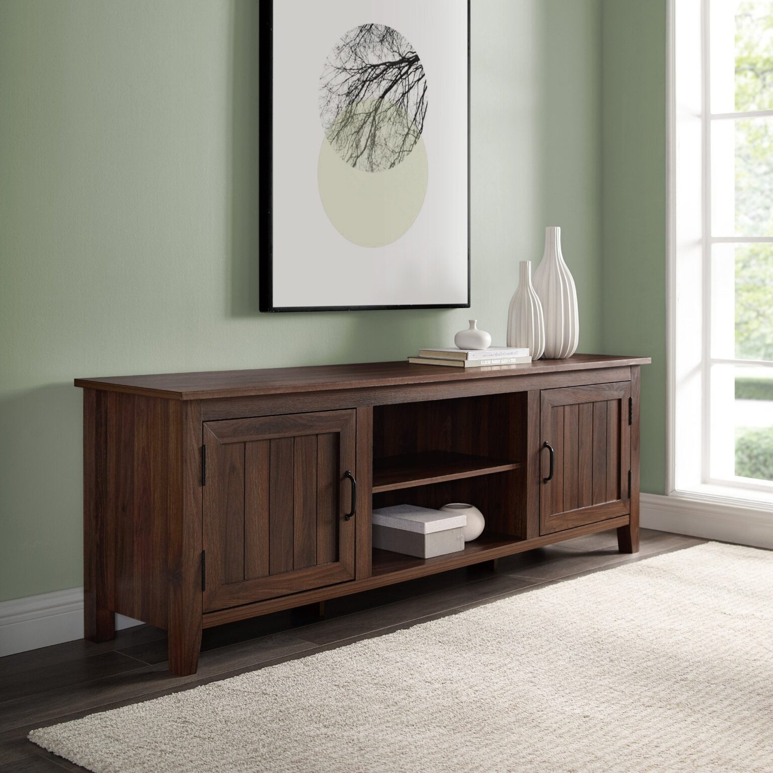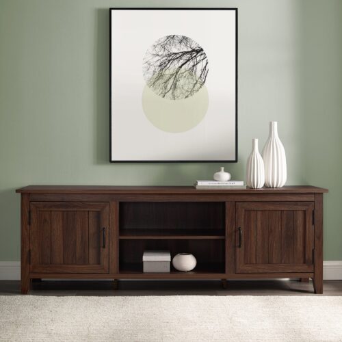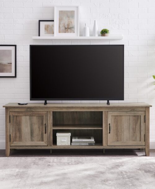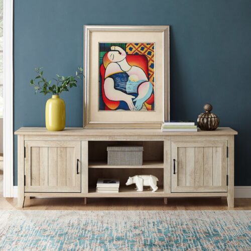 Improve your living space with our 70-inch modern farmhouse console, as it’s both practical and stylish. This TV stand features two bead board designed side doors with adjustable shelving inside and in the center of the piece. Constructed of high-grade MDF, along with having exposed metal hardware for an overall modern farmhouse and coastal style. This versatile piece can be used in your living room as a centerpiece and storage unit to decorate with nautical themed décor or as an entertainment center for placing your TV on to watch your favorite shows with friends and family. Either way, this console table will give you just the right amount of space needed for your items and be a stylish addition to your space