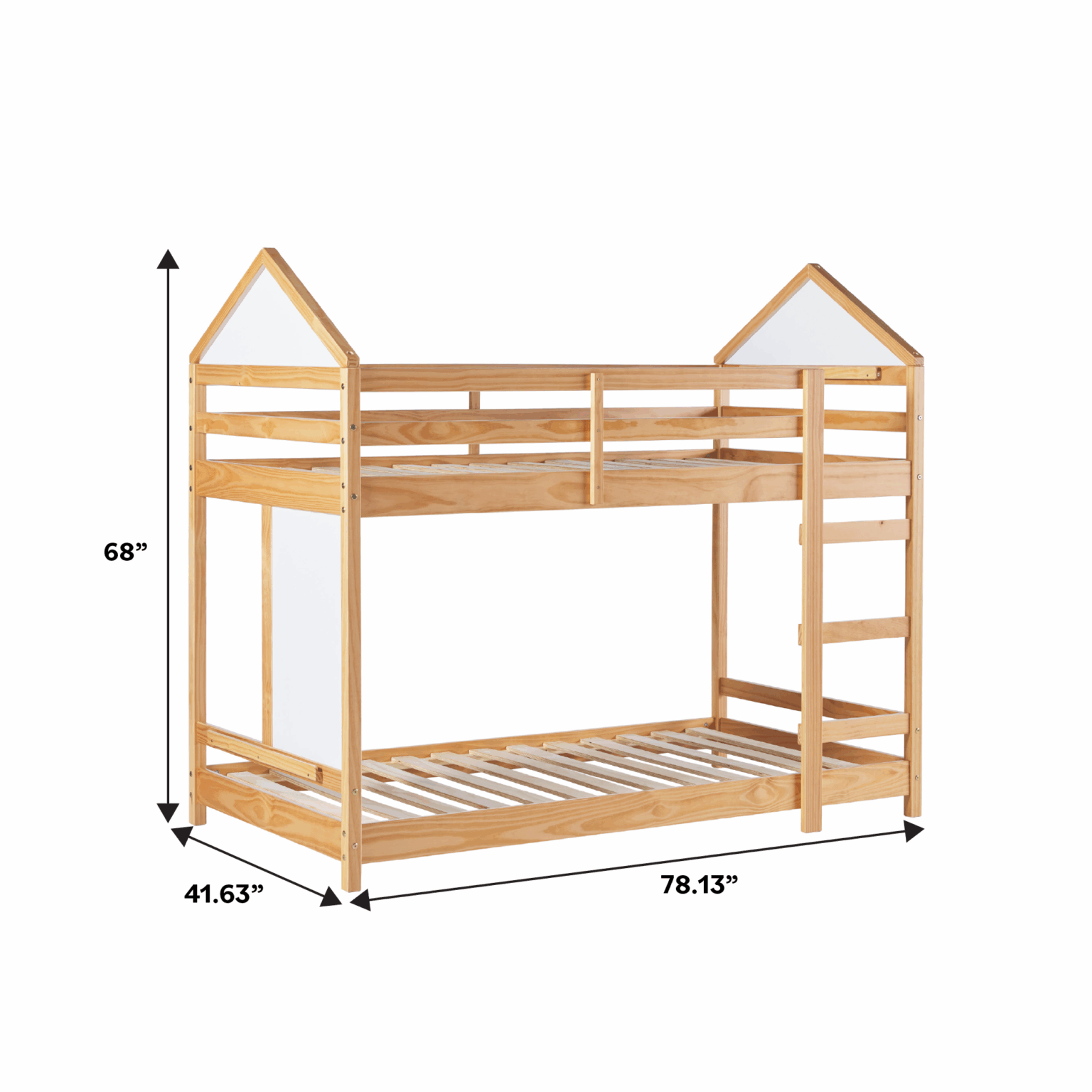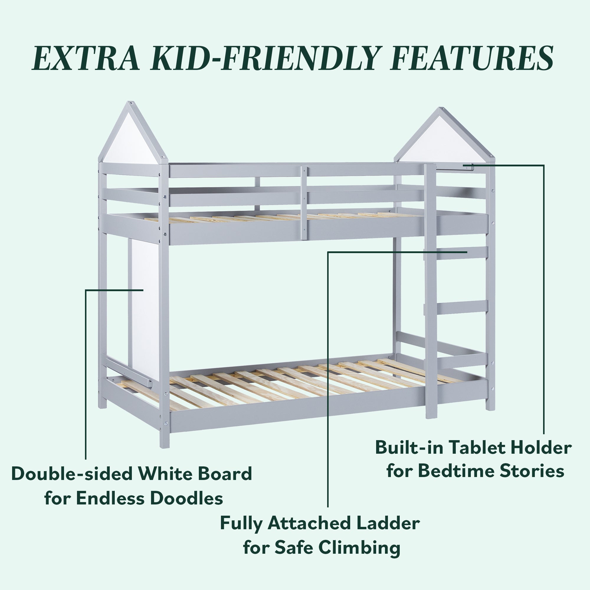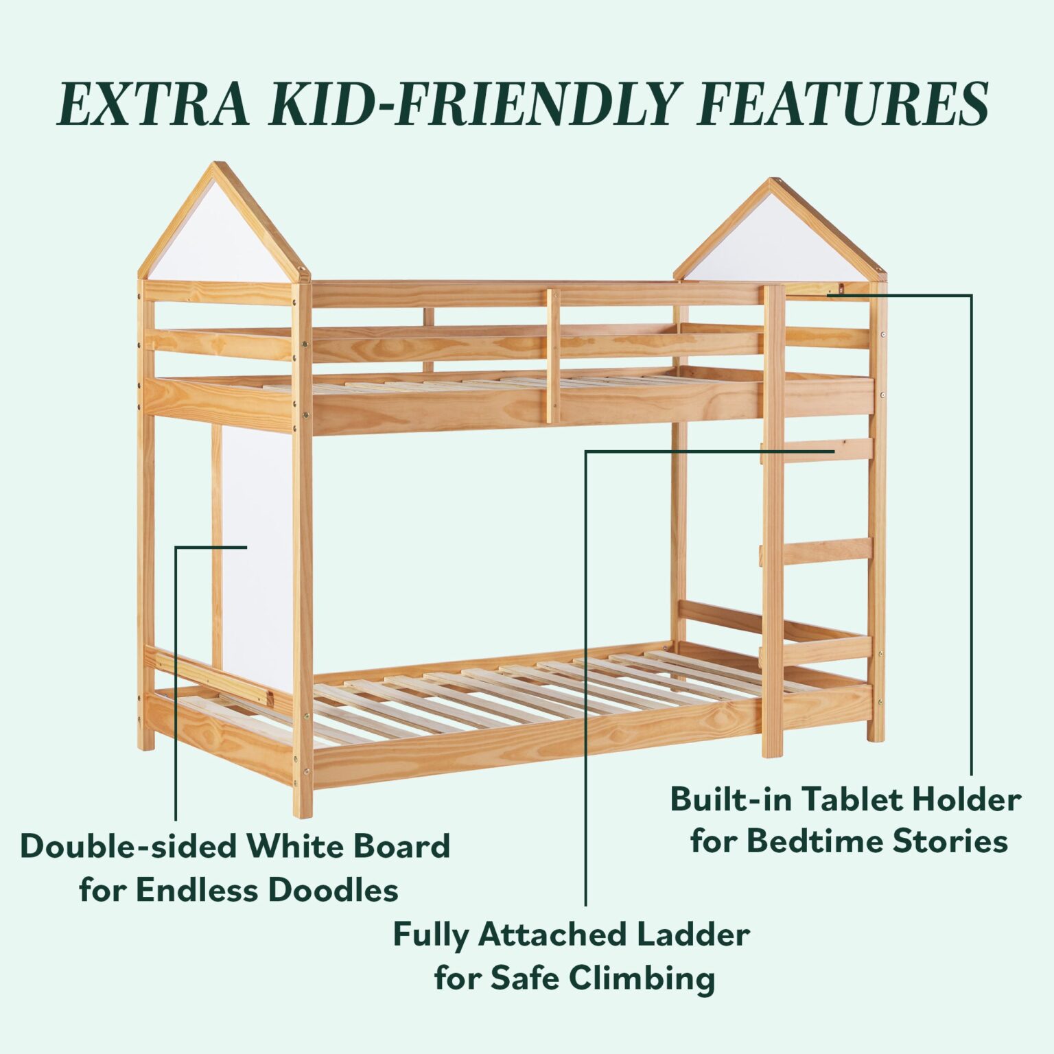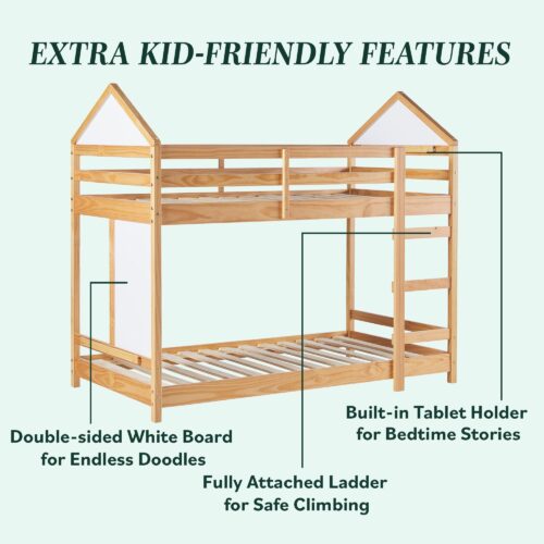 This bunk bed is designed to make the most of every inch, featuring built-in rails at the top and bottom to securely hold a tablet or phone for added functionality. Encouraging creativity, it includes double-sided whiteboards on one end and within the house-like structure—perfect for both play and learning. Its fresh & fun design brings a contemporary vibe that’s as unique as your kid. Crafted from solid pine wood and warp-resistant engineered wood, it’s built to endure for years to come. With a sturdy slat support system, there’s no need for a box spring, making it both sleek and convenient.