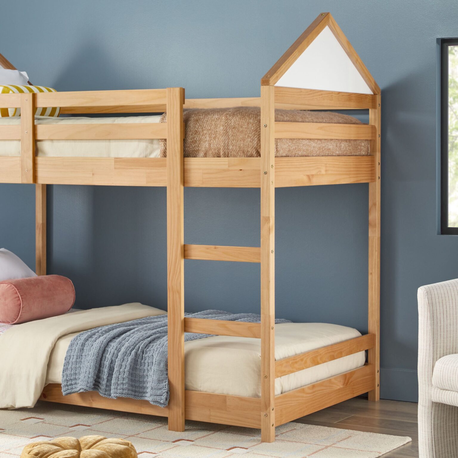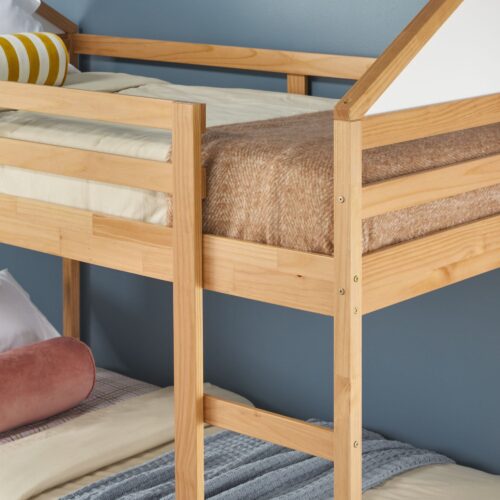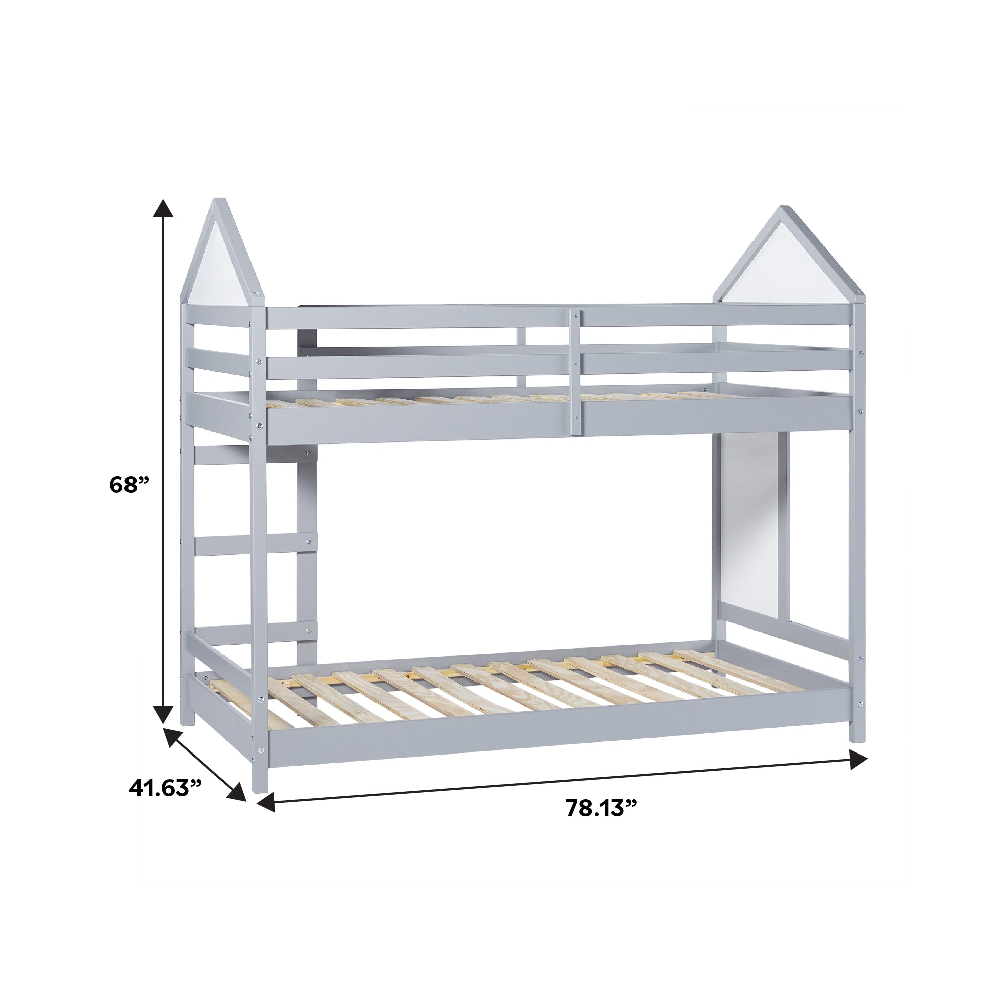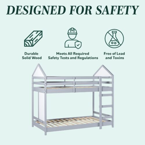This bunk bed is designed to make the most of every inch, featuring built-in rails at the top and bottom to securely hold a tablet or phone for added functionality. Encouraging creativity, it includes double-sided whiteboards on one end and within the house-like structure—perfect for both play and learning. Its fresh & fun design brings a contemporary vibe that’s as unique as your kid. Crafted from solid pine wood and warp-resistant engineered wood, it’s built to endure for years to come. With a sturdy slat support system, there’s no need for a box spring, making it both sleek and convenient.