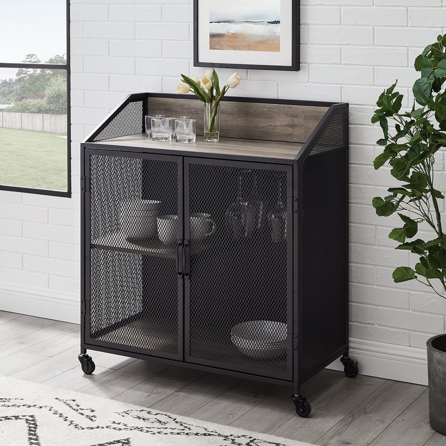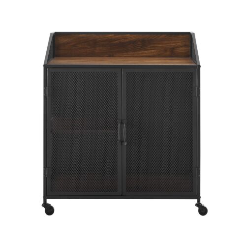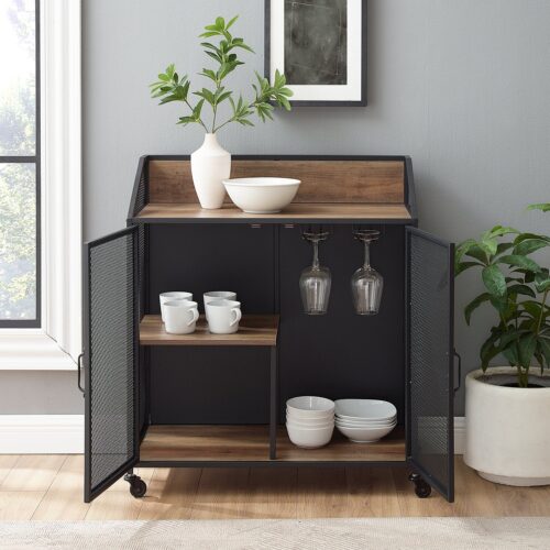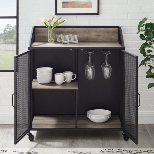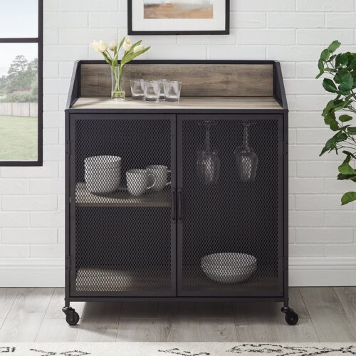 This industrial bar cabinet provides the ideal spot for entertaining guests with your collection of drinks or appetizers, as it has an upper shelf and lower cabinet with more shelving behind mesh styled doors. The doors and sides of the piece are made of metal, while the shelves and backing are constructed of durable laminate. This rolling cart has locking casters, so it will stay in place when needed. Gently glide this piece from your kitchen to your dining or living space for an easier way to transfer your dinnerware and food.Â