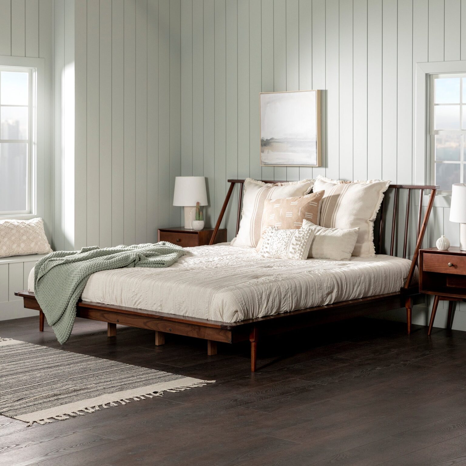 Stylistically unobtrusive and structurally sound, this solid pine spindle frame bed will keep your bedroom dreamy whether you’re looking at it or actually sleeping on it. Its platform design takes out the bothersome need for a box spring base, making it easy to place a mattress of your choice on the frame. And while the tapered legs and clean lines emanate a mid-century modern vibe, this bedframe fluidly fits in with traditional, gender-neutral, or minimal designs with its beautiful stain finish.